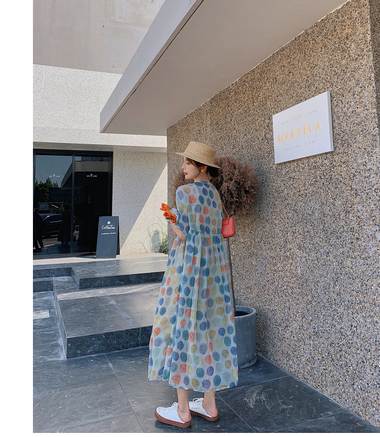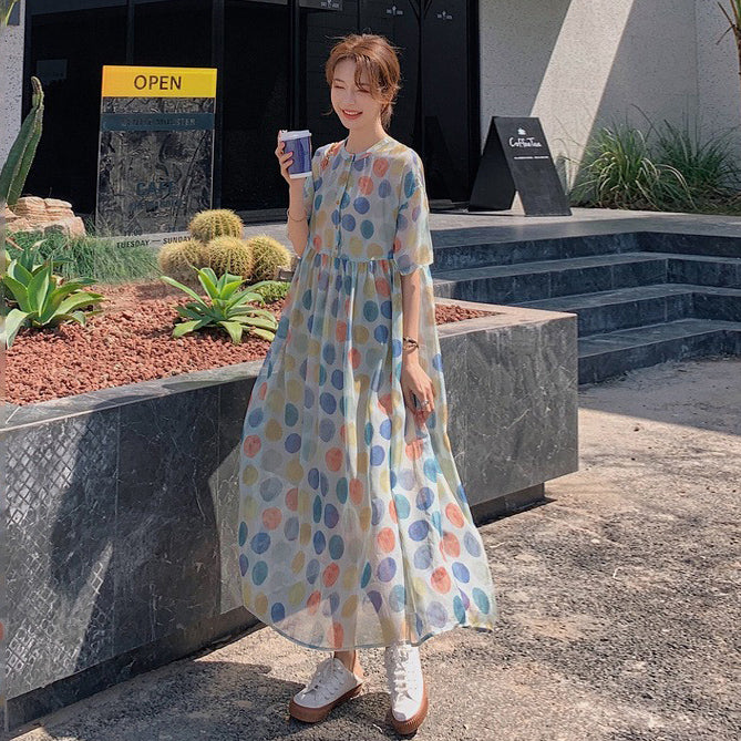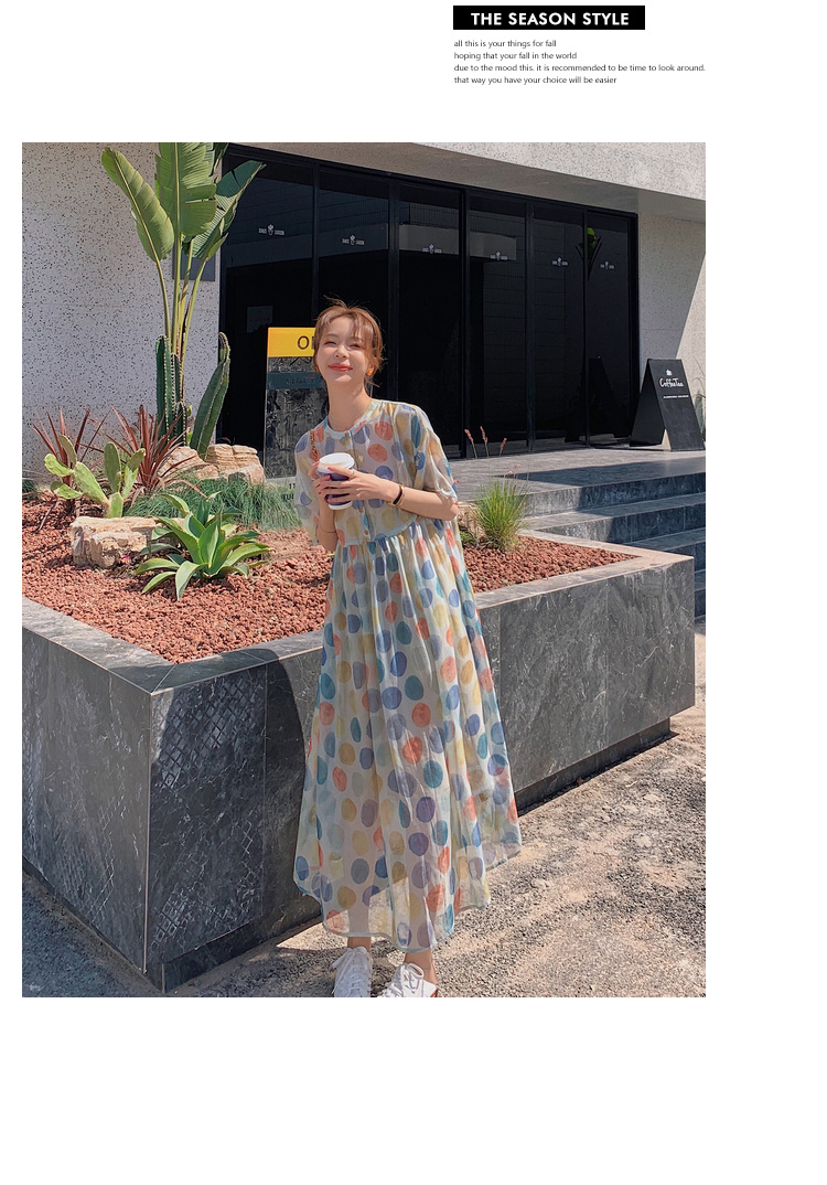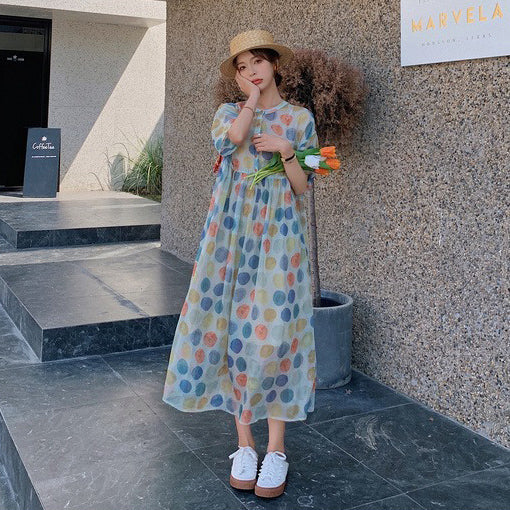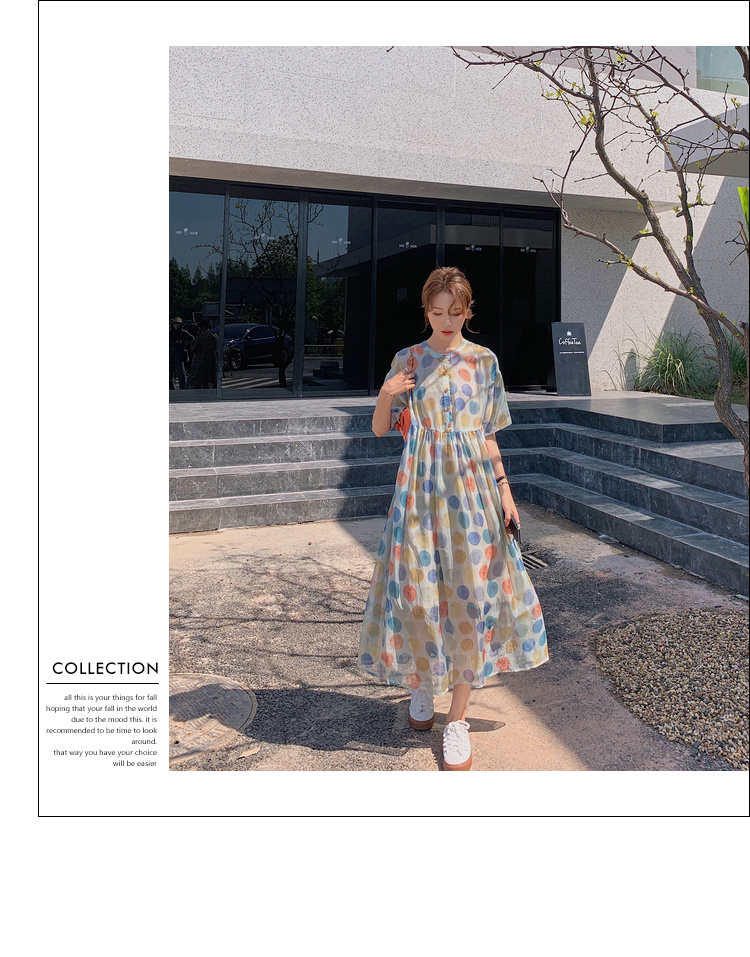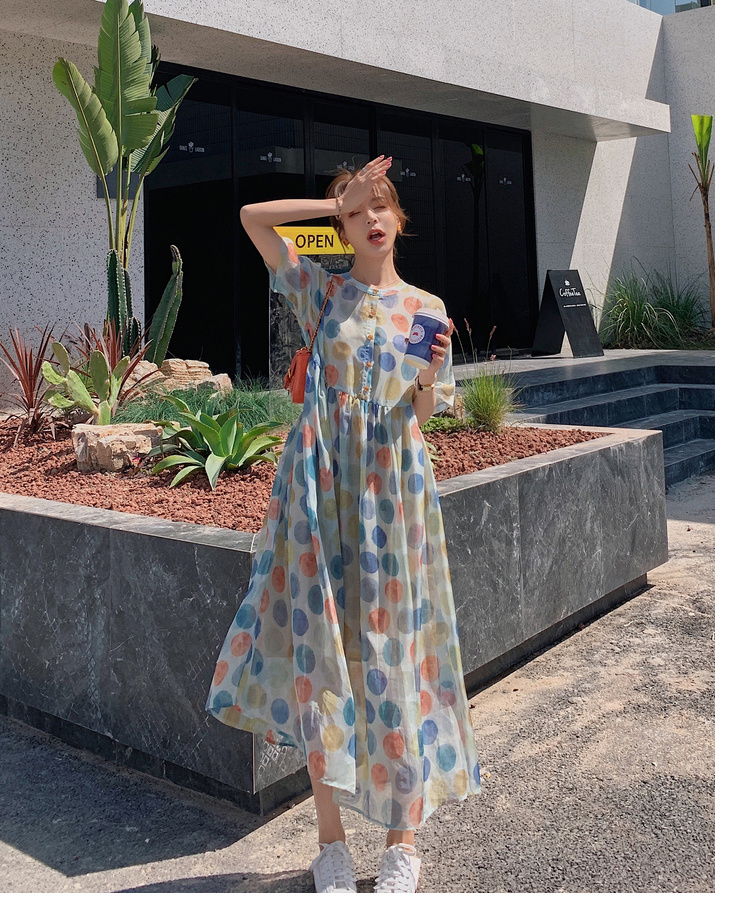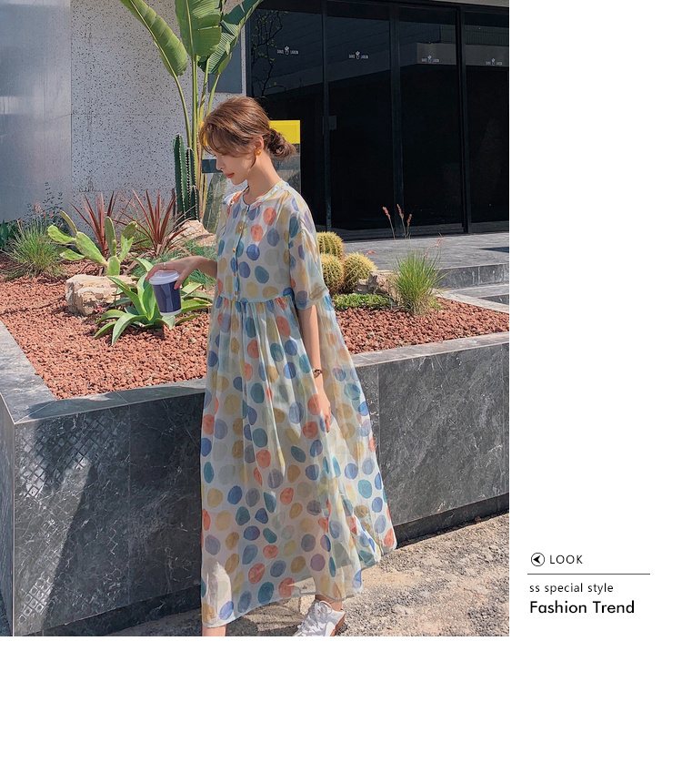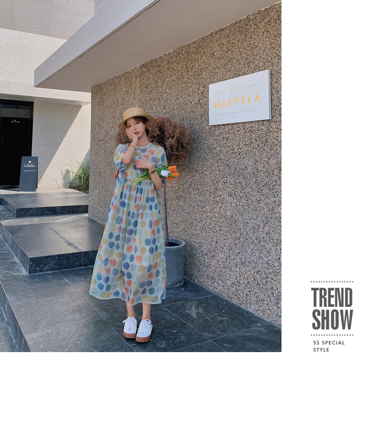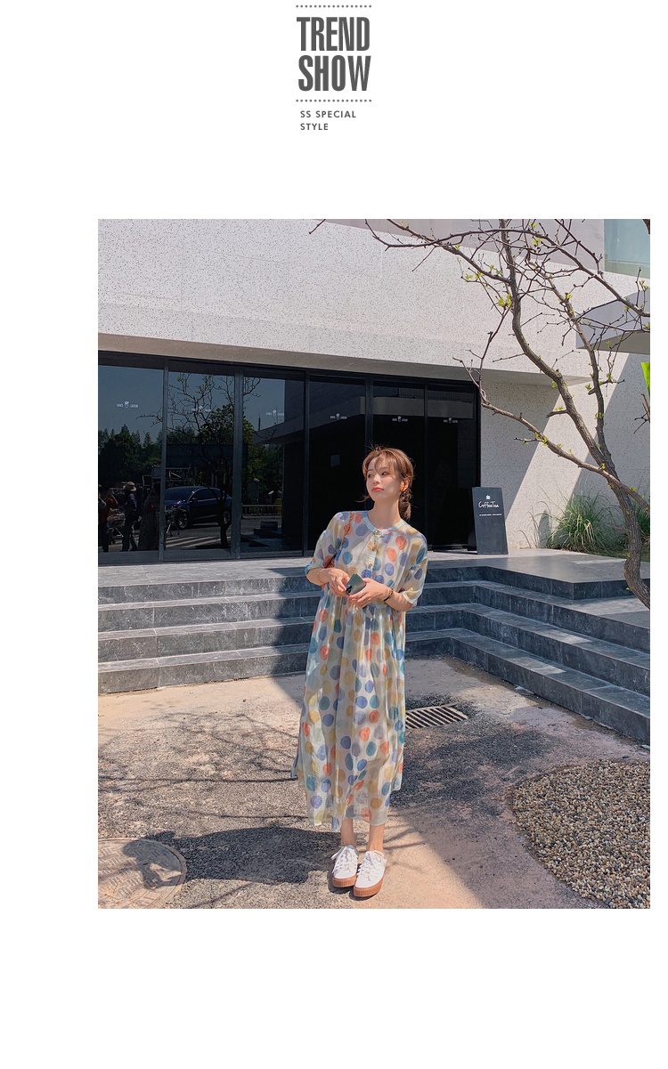 【ワンピース】【10~15日内発送】夏新作 やや透け感 ゆったりシルエット 体型カバー 冷淡系ドット柄 半袖ワンピース【SHシリーズ】