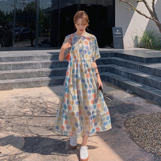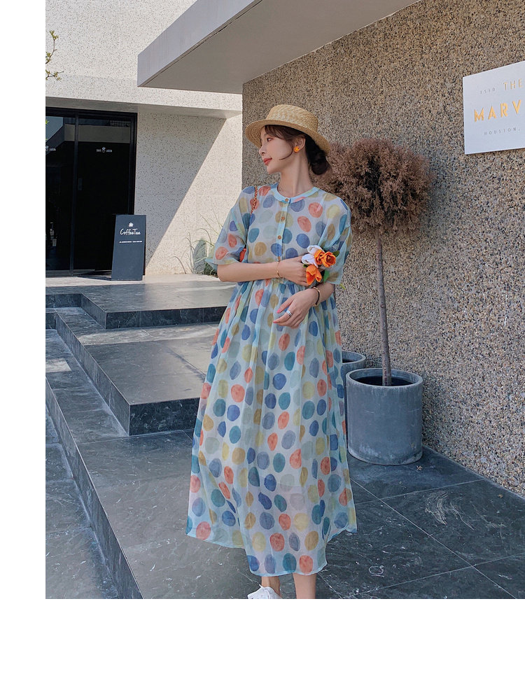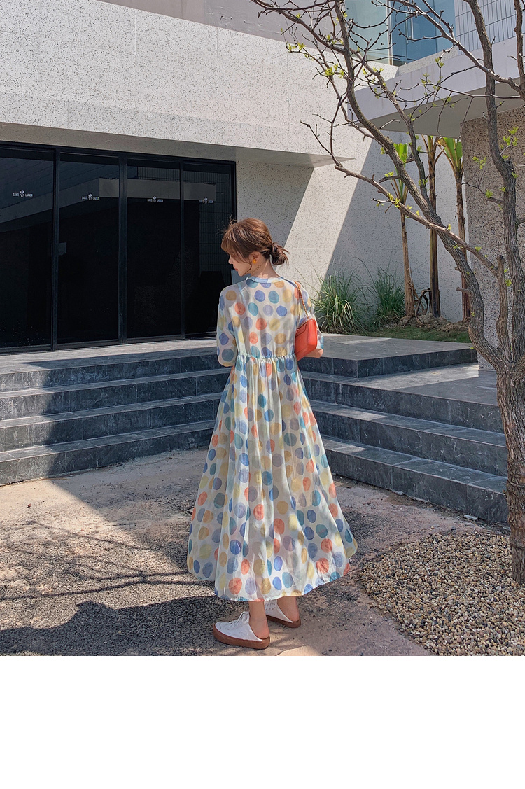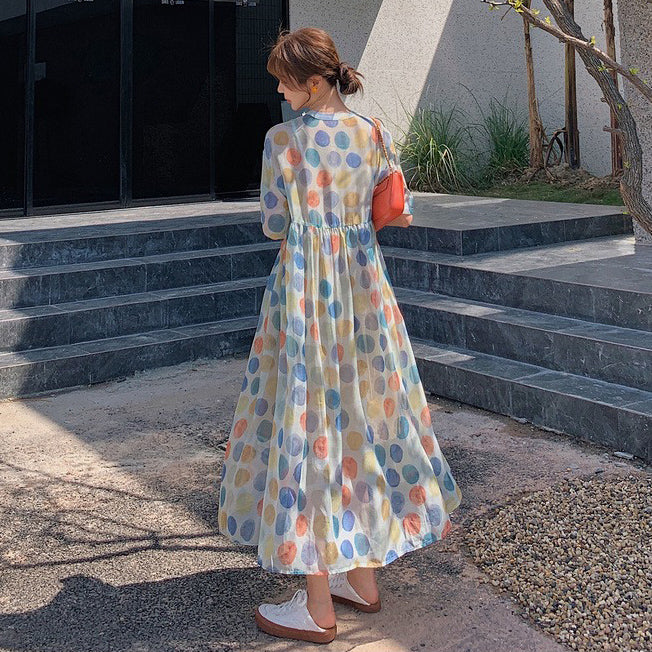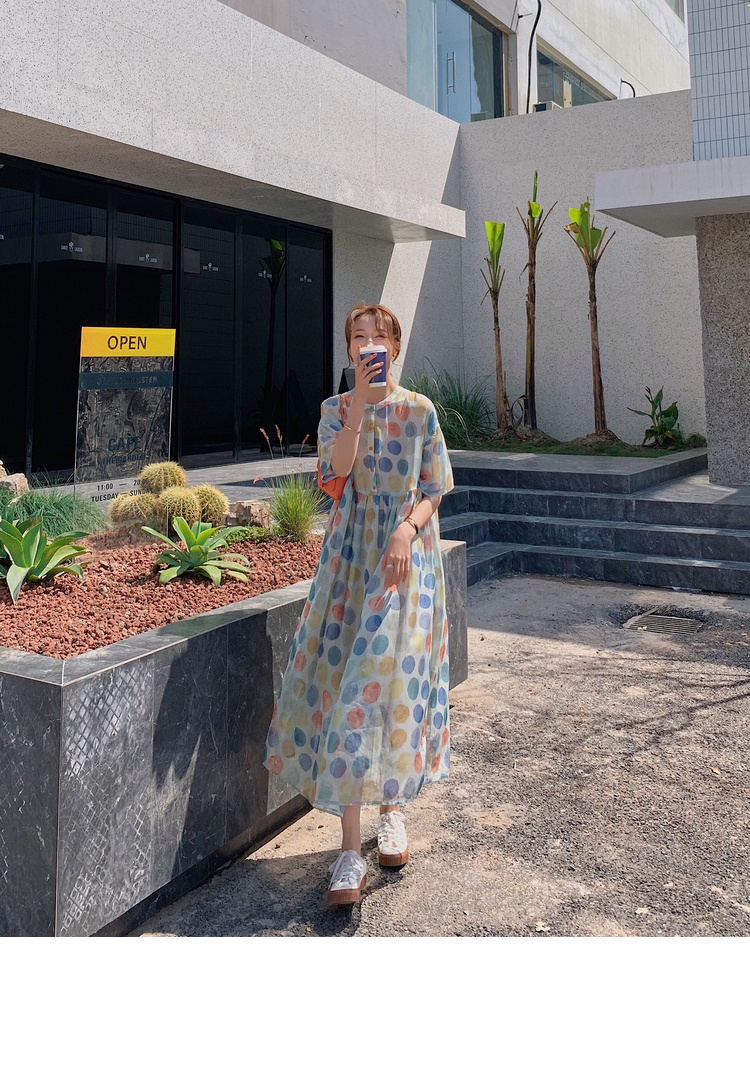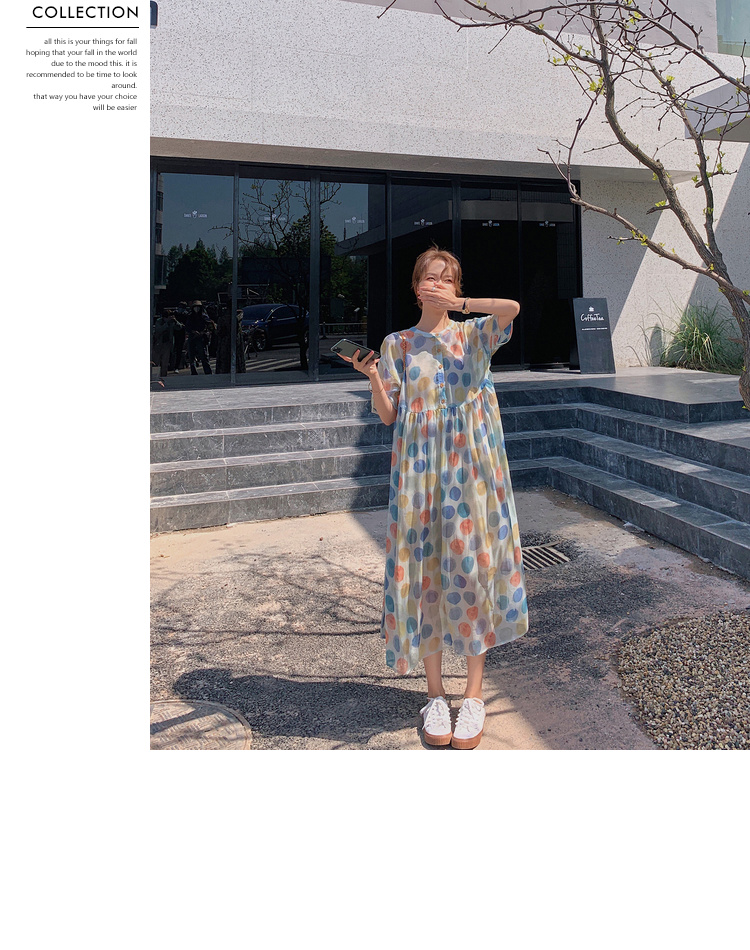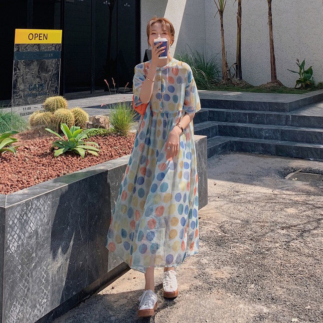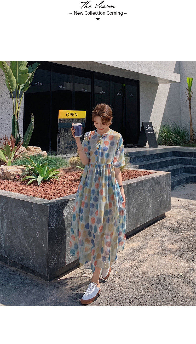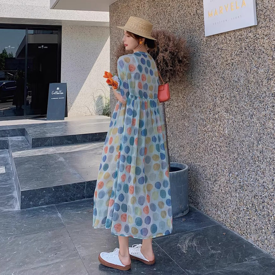 【ワンピース】【10~15日内発送】夏新作 やや透け感 ゆったりシルエット 体型カバー 冷淡系ドット柄 半袖ワンピース【SHシリーズ】