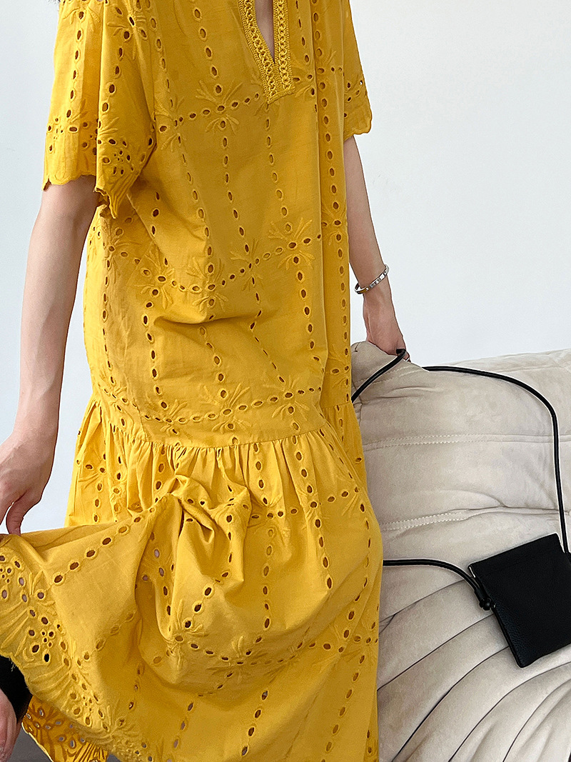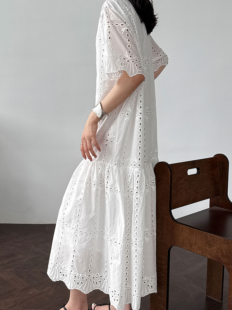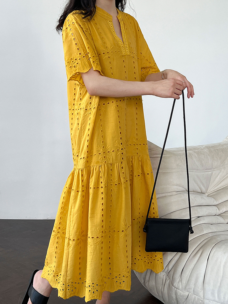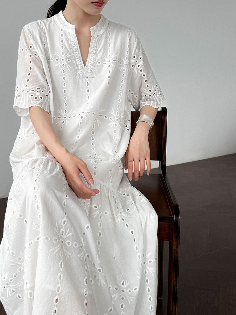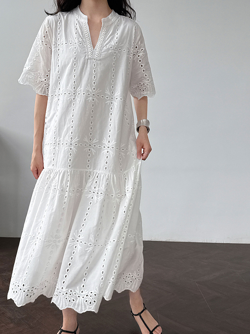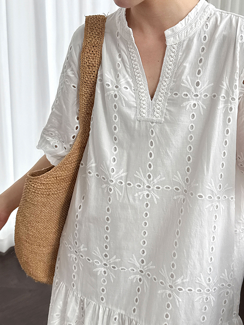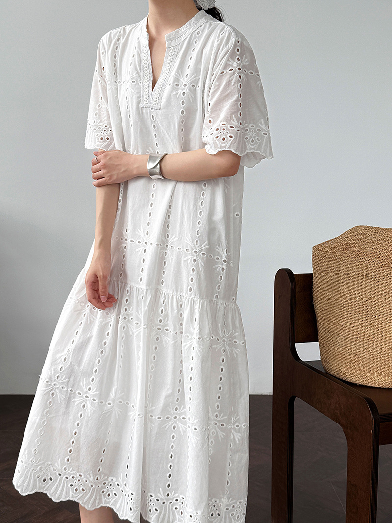 【ワンピース】夏 透かし彫り レース 刺繍 Vネック 半袖 ワンピース【SNシリーズ】
