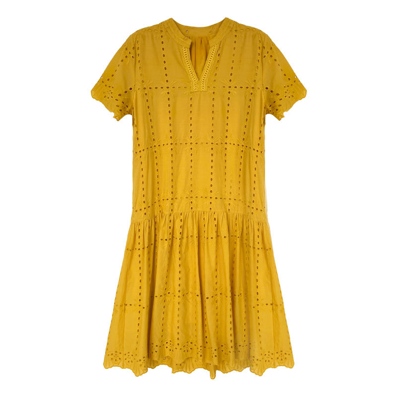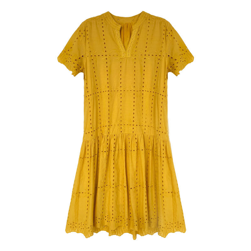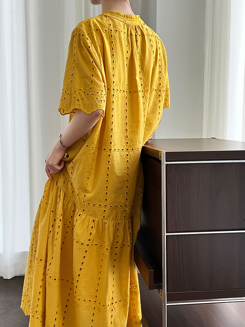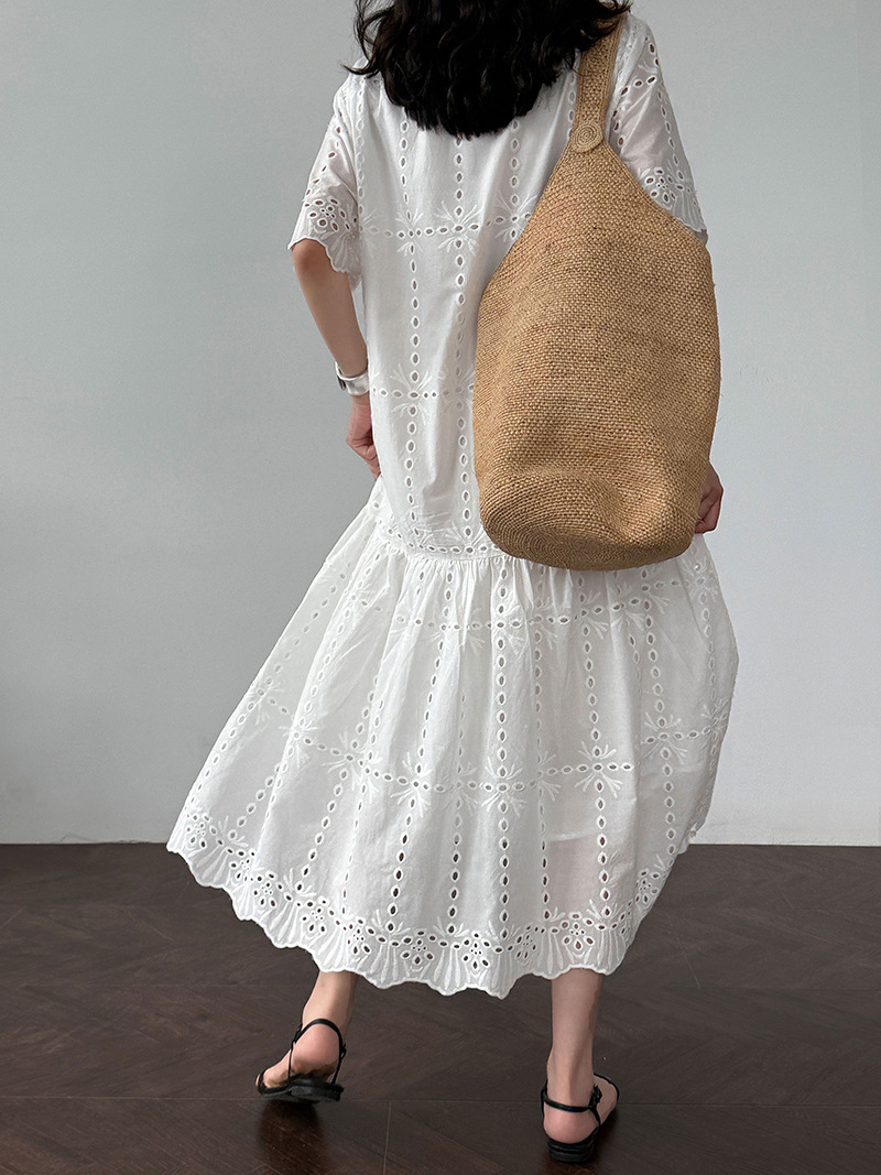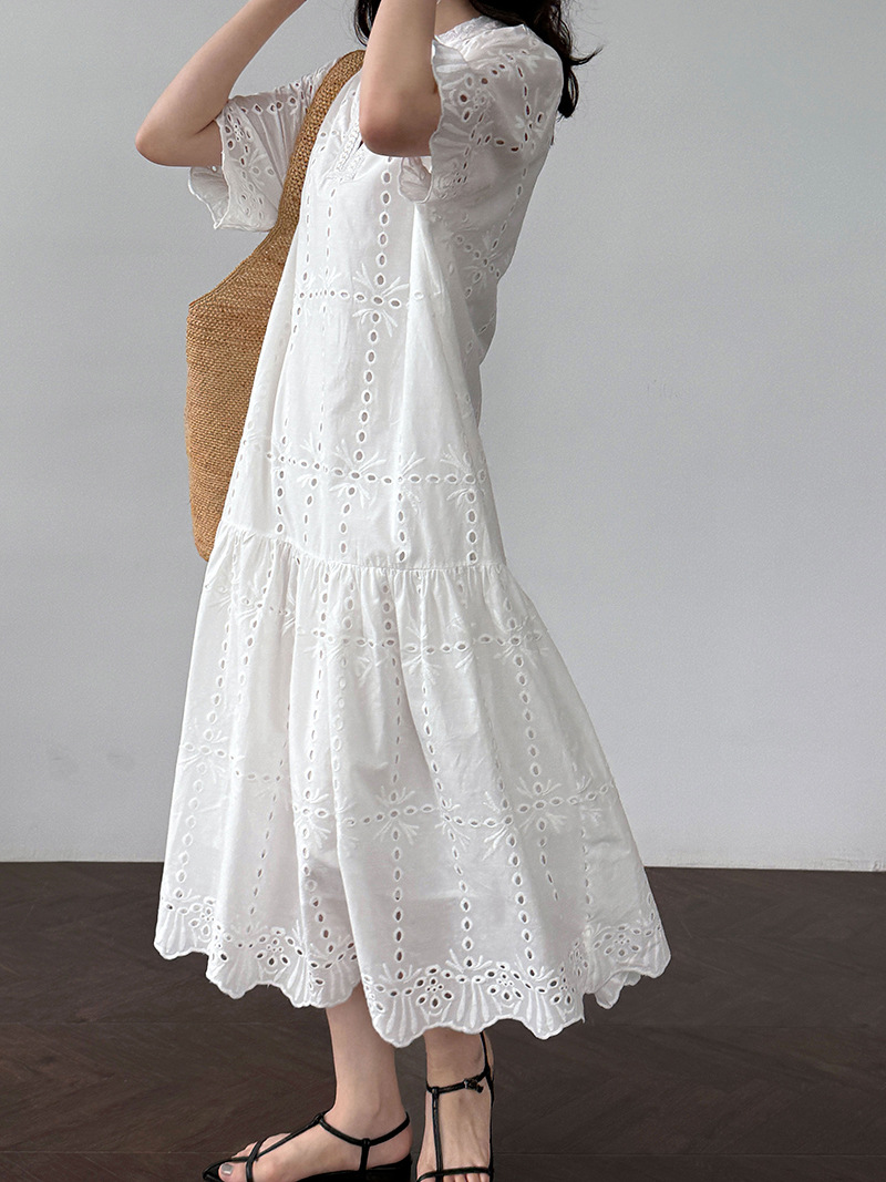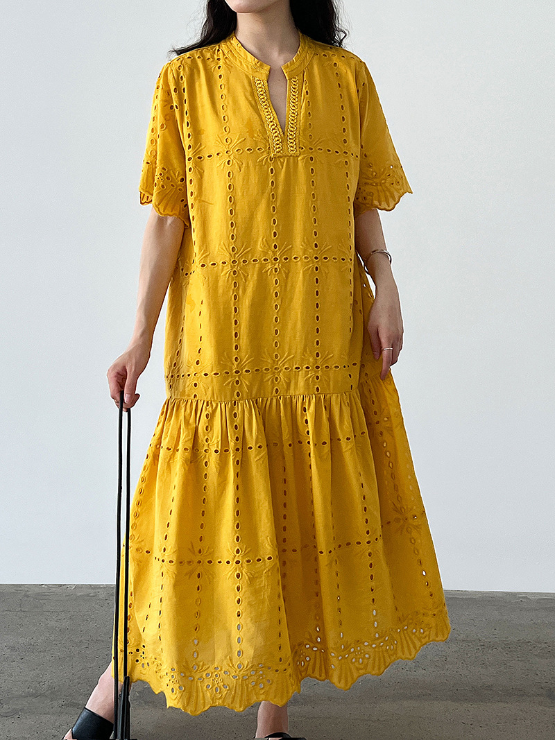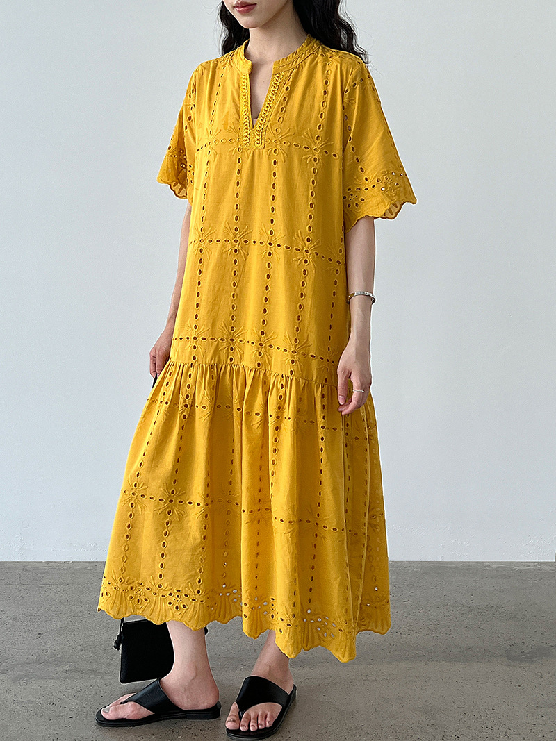 【ワンピース】夏 透かし彫り レース 刺繍 Vネック 半袖 ワンピース【SNシリーズ】