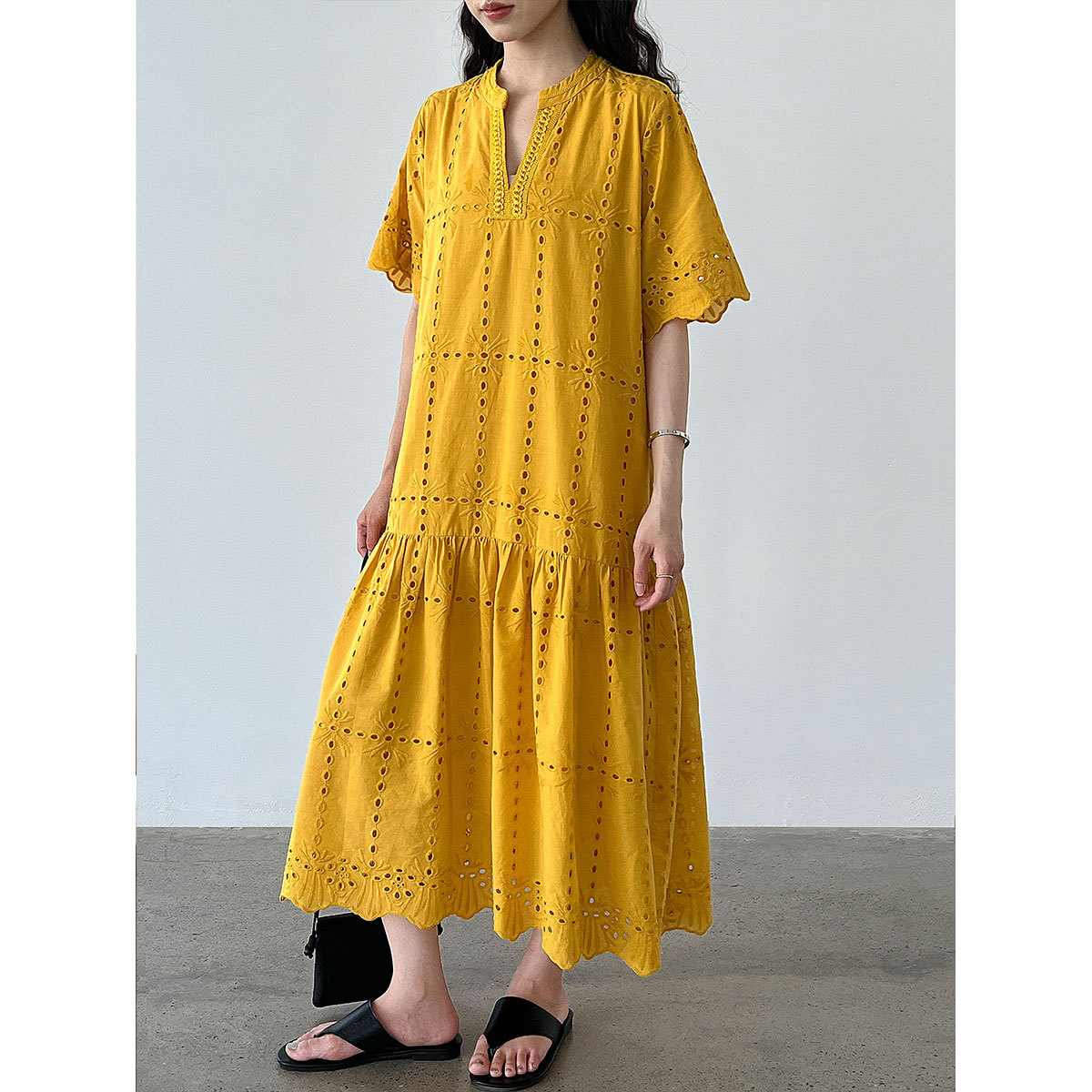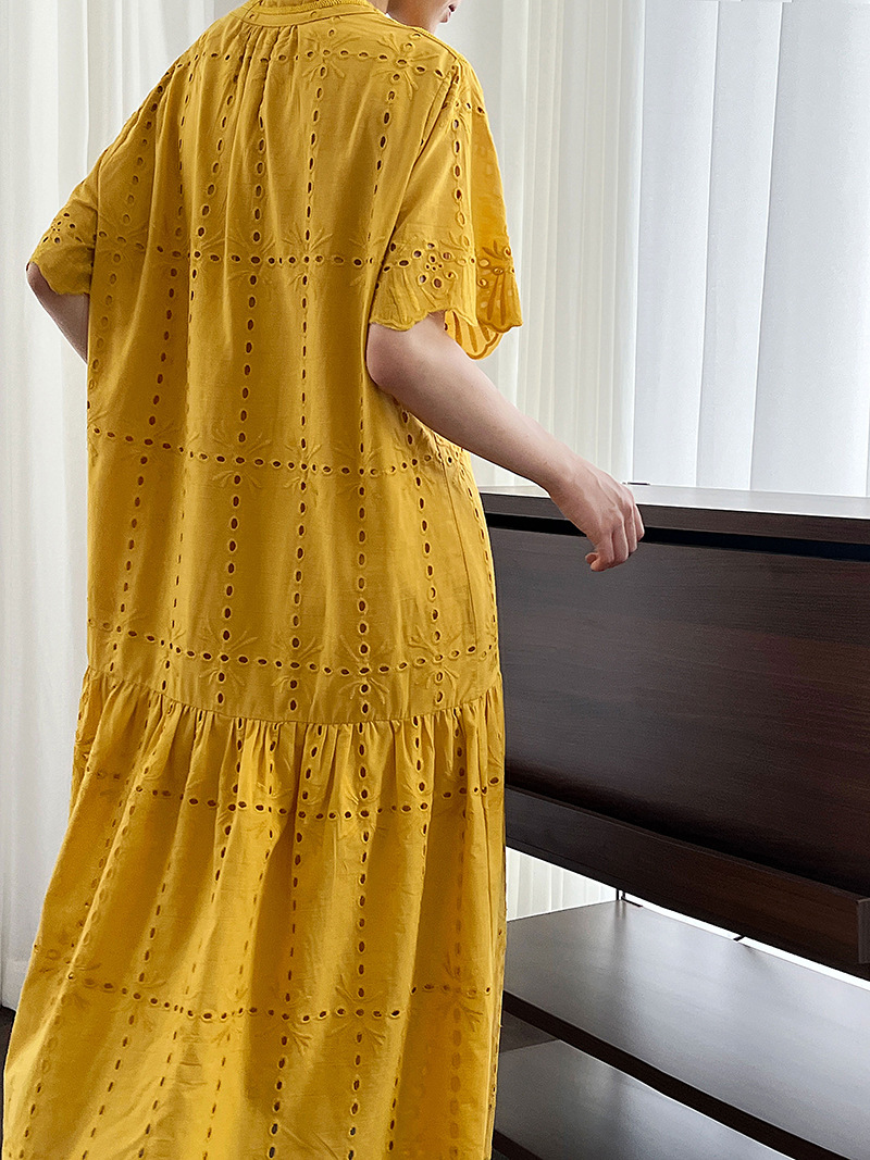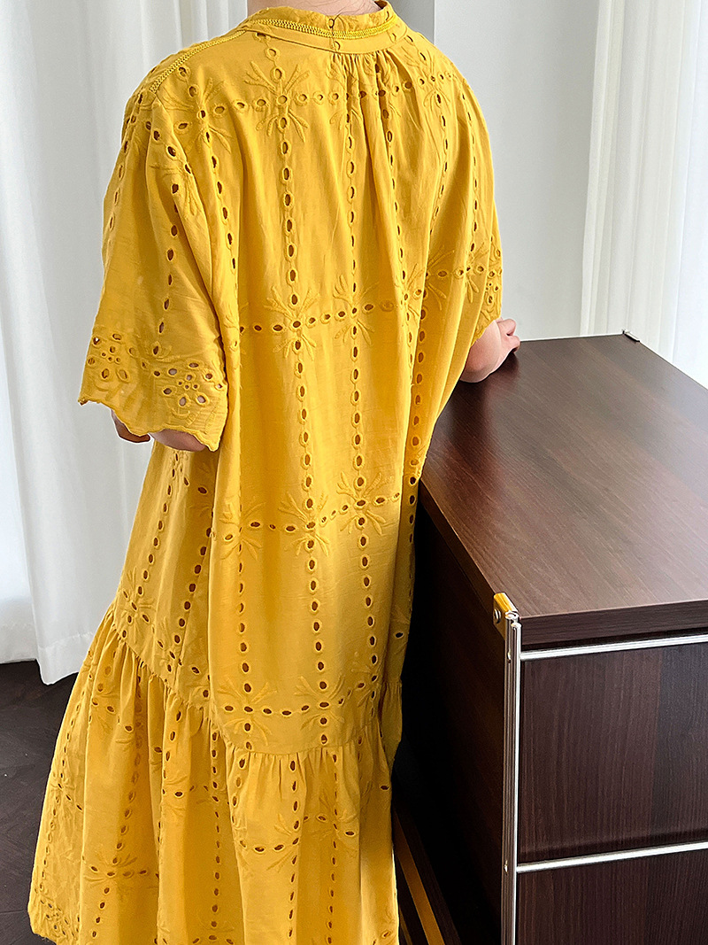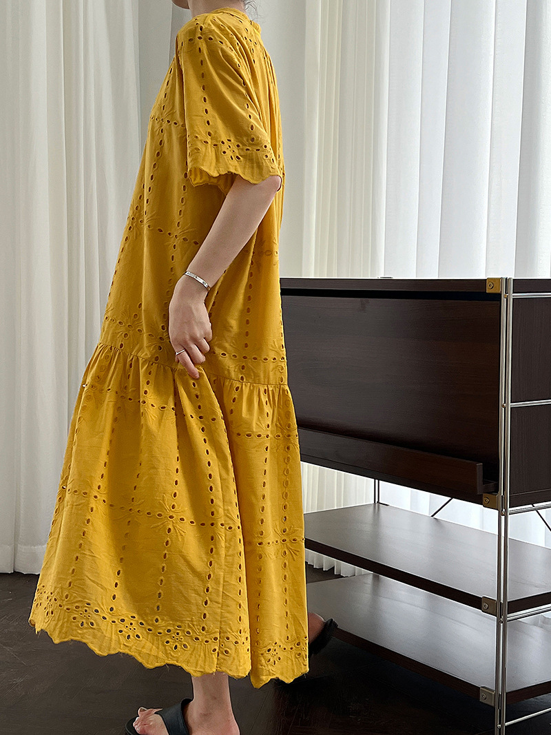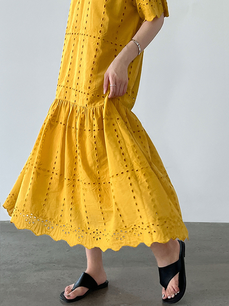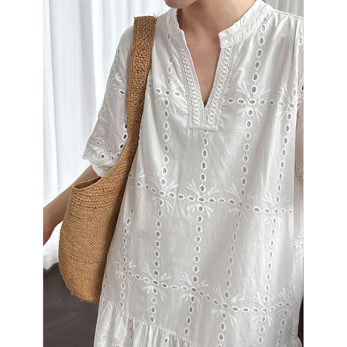 【ワンピース】夏 透かし彫り レース 刺繍 Vネック 半袖 ワンピース【SNシリーズ】