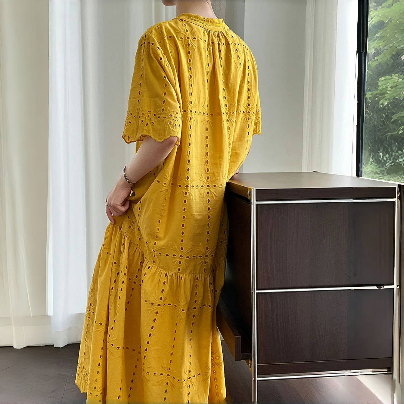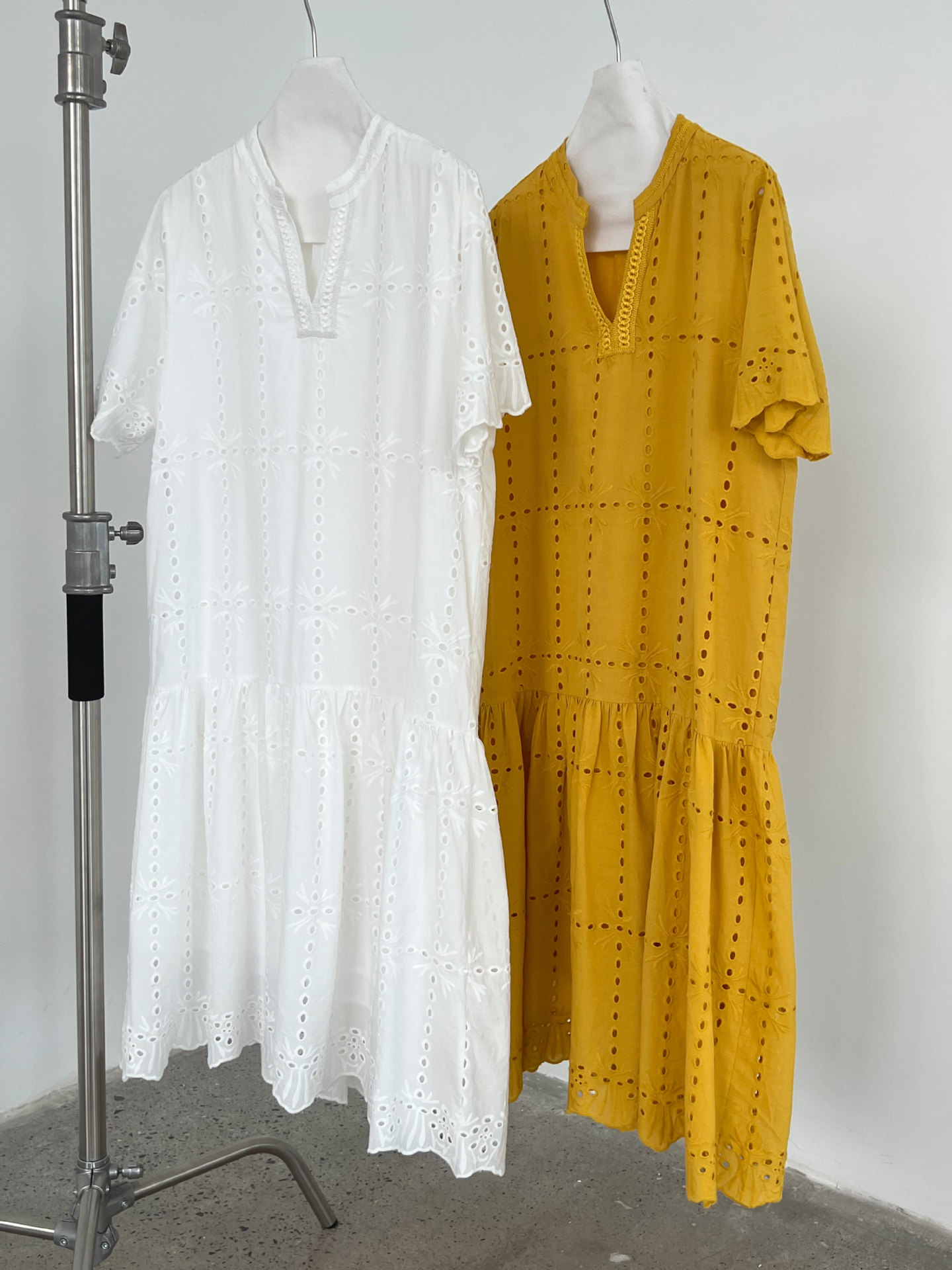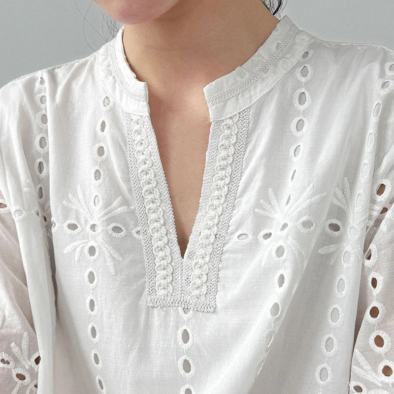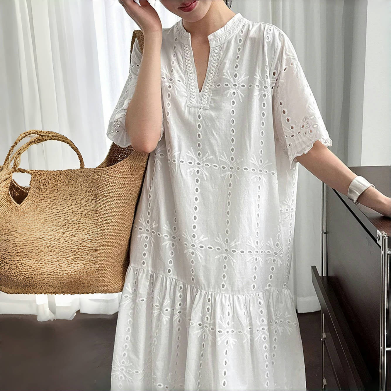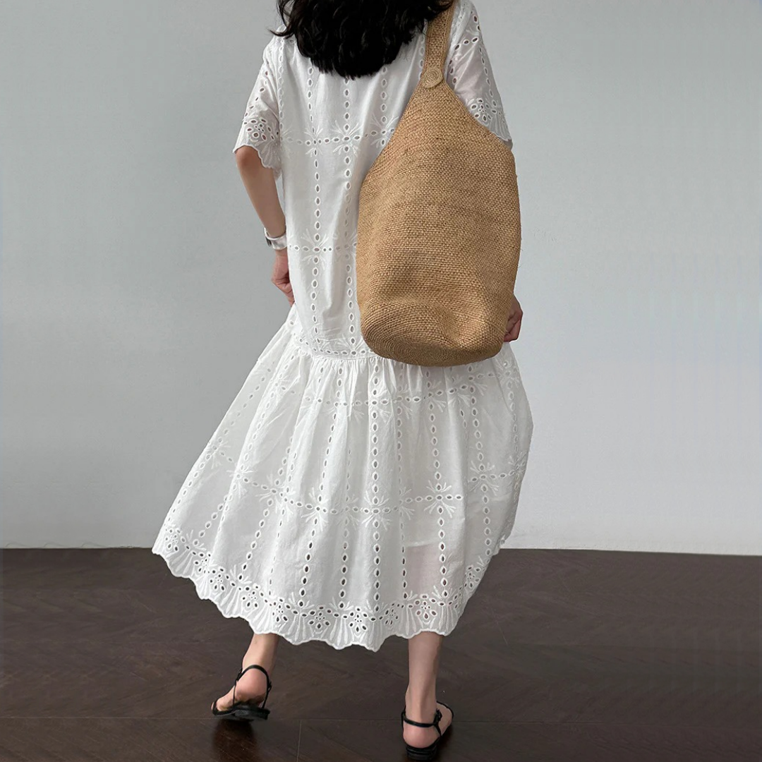 【ワンピース】夏 透かし彫り レース 刺繍 Vネック 半袖 ワンピース【SNシリーズ】