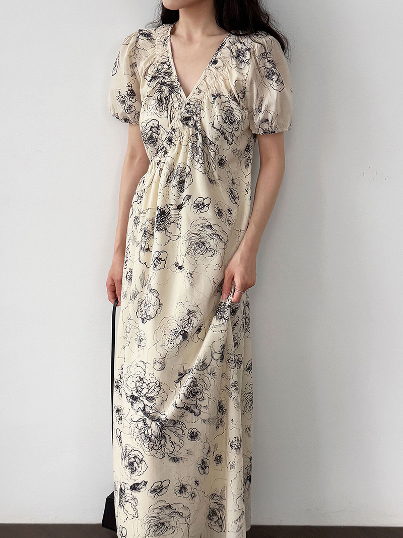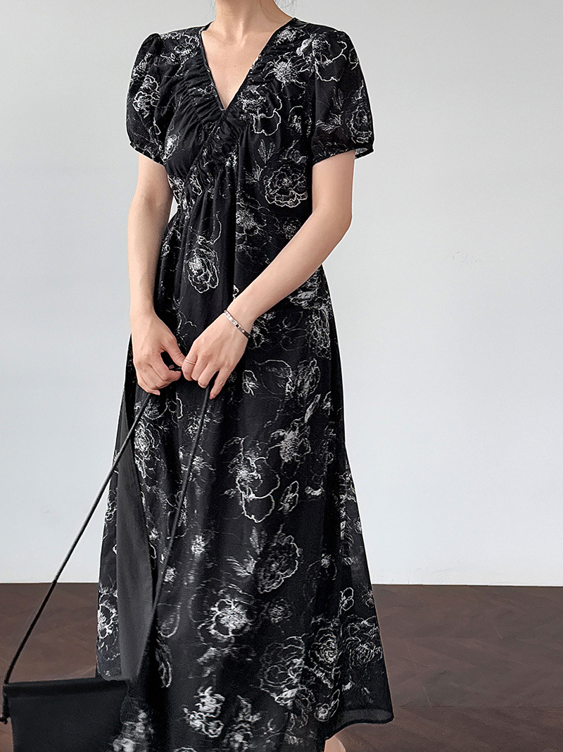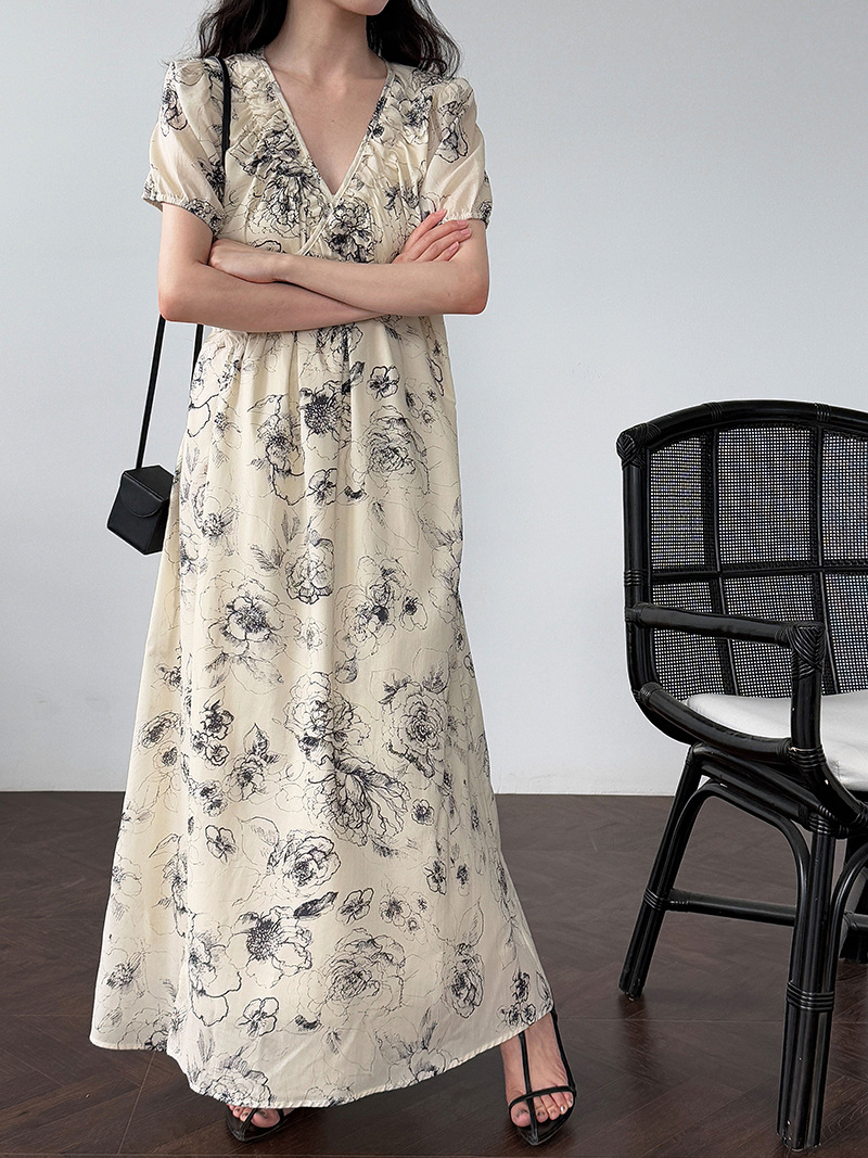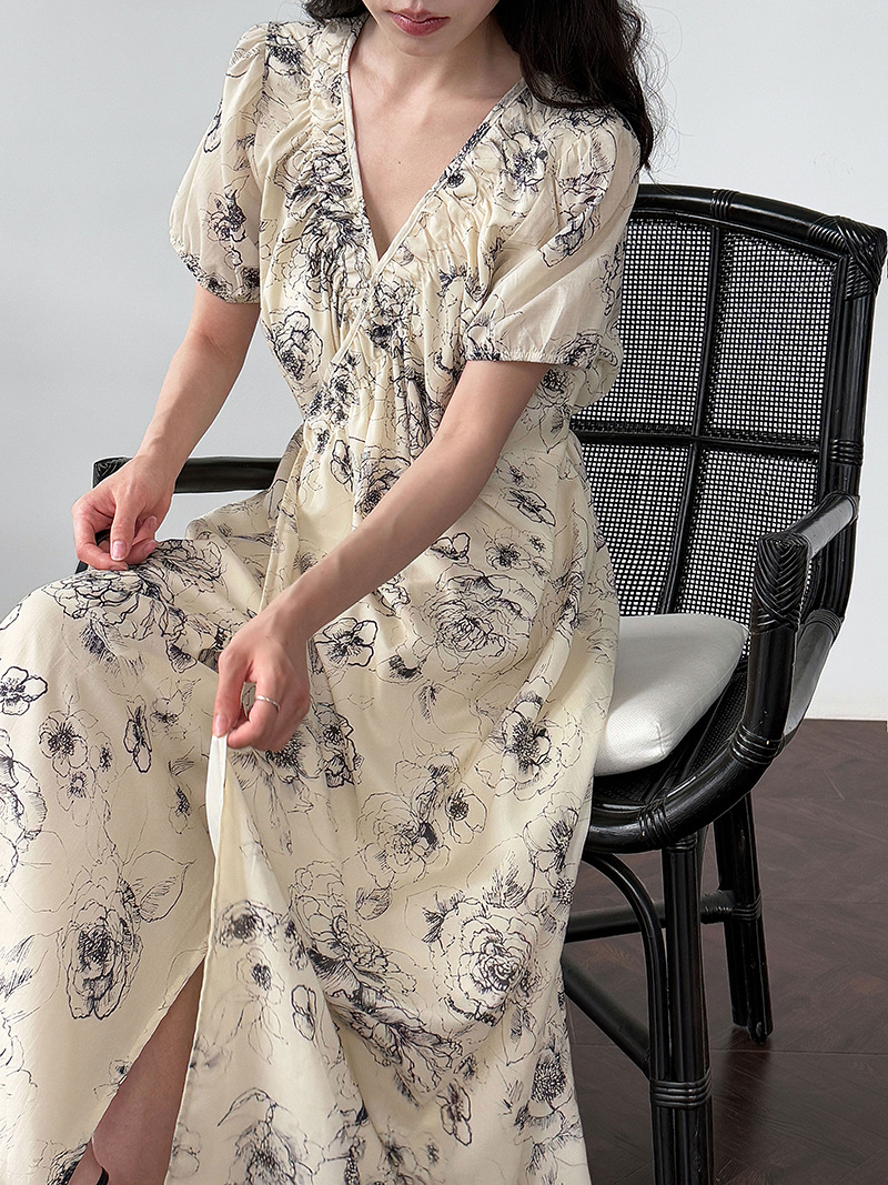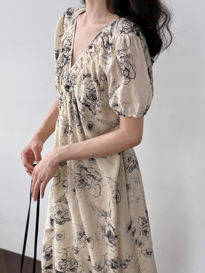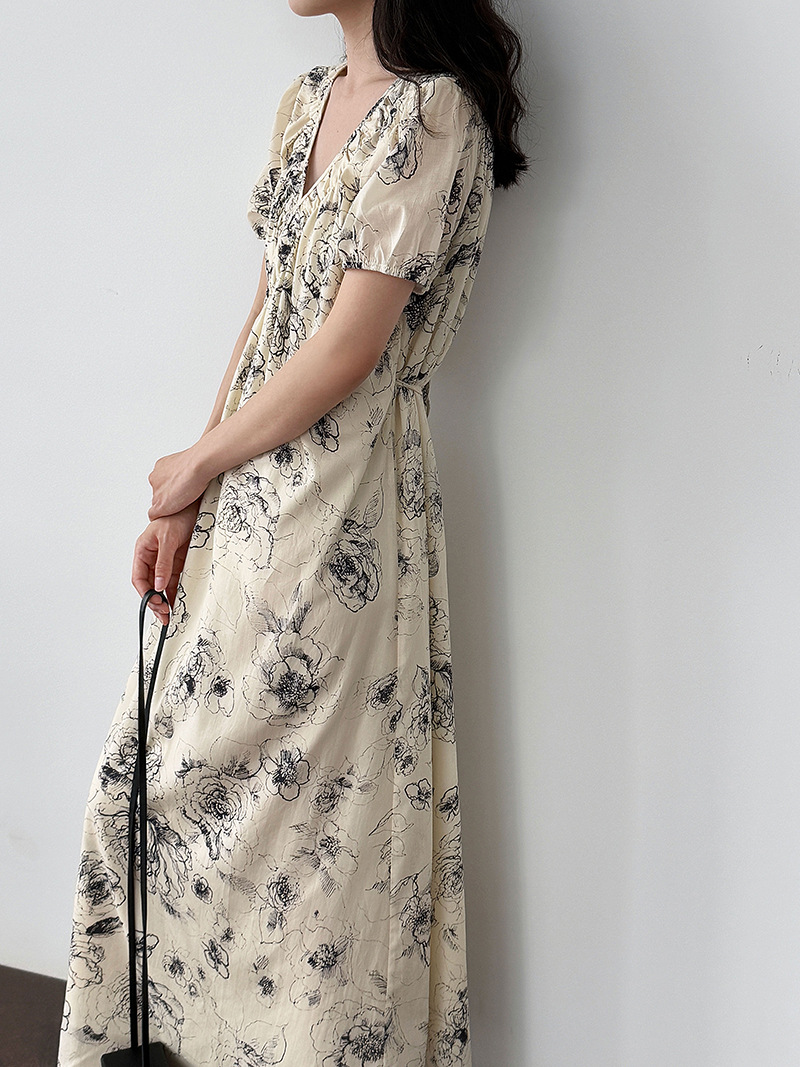 【商品名】【ワンピース】フレンチ夏新作 上品クラシック水墨画風 花柄ラップ半袖ワンピース【SHシリーズ】【JZシリーズ】