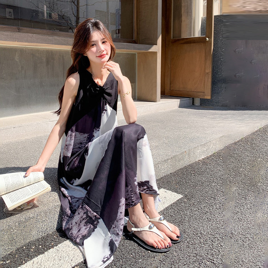 【ワンピース】夏新作 レトロ水墨風プリント リラックス感Vネック ノースリーブワンピース【SHシリーズ】