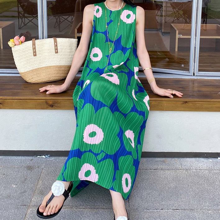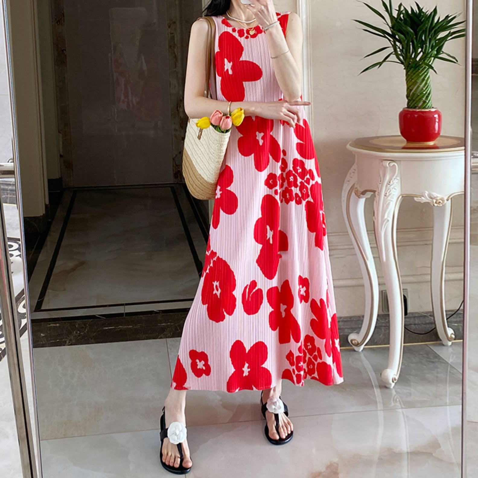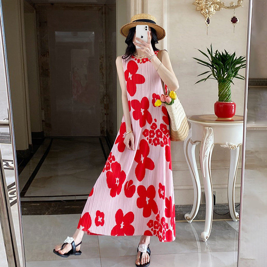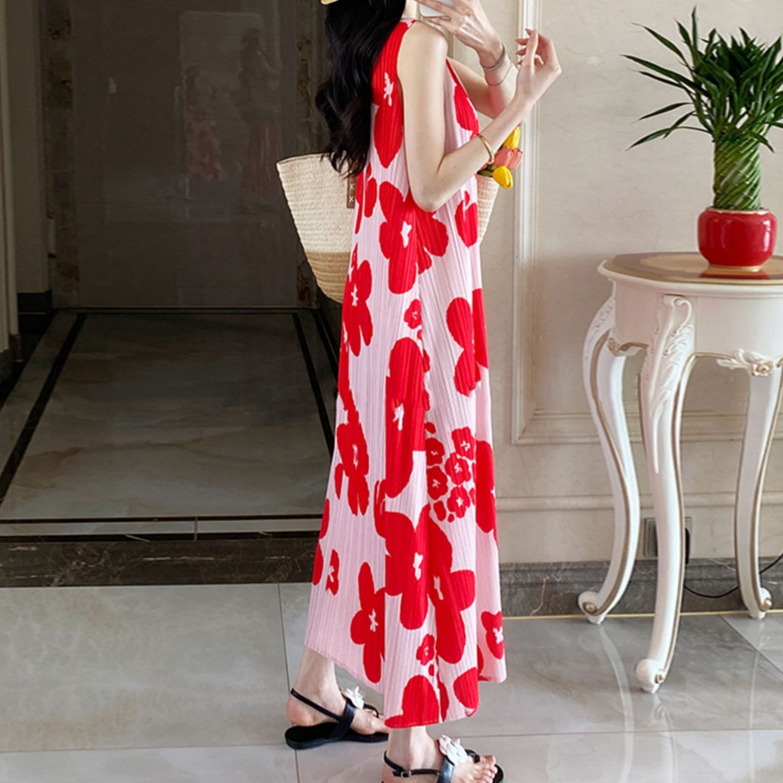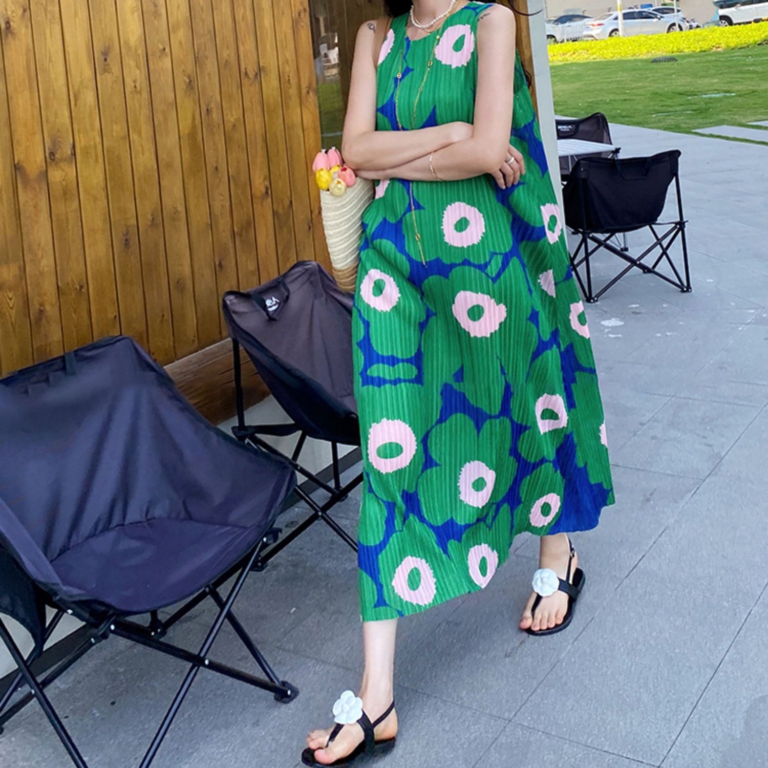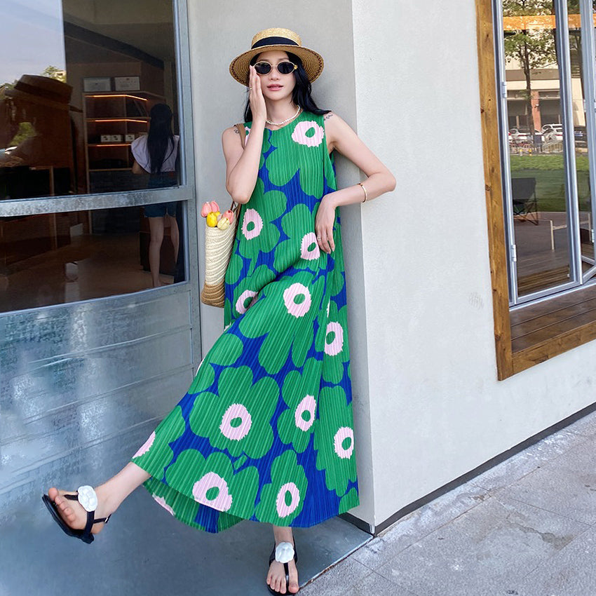 【ワンピース】フレンチ 海辺リゾート ビーチ プリーツプリント ノースリーブワンピース【SHシリーズ】