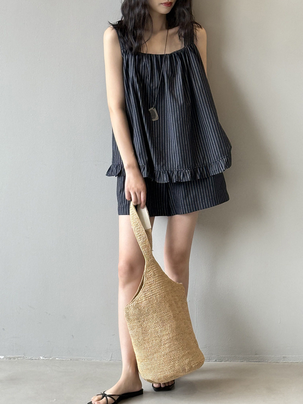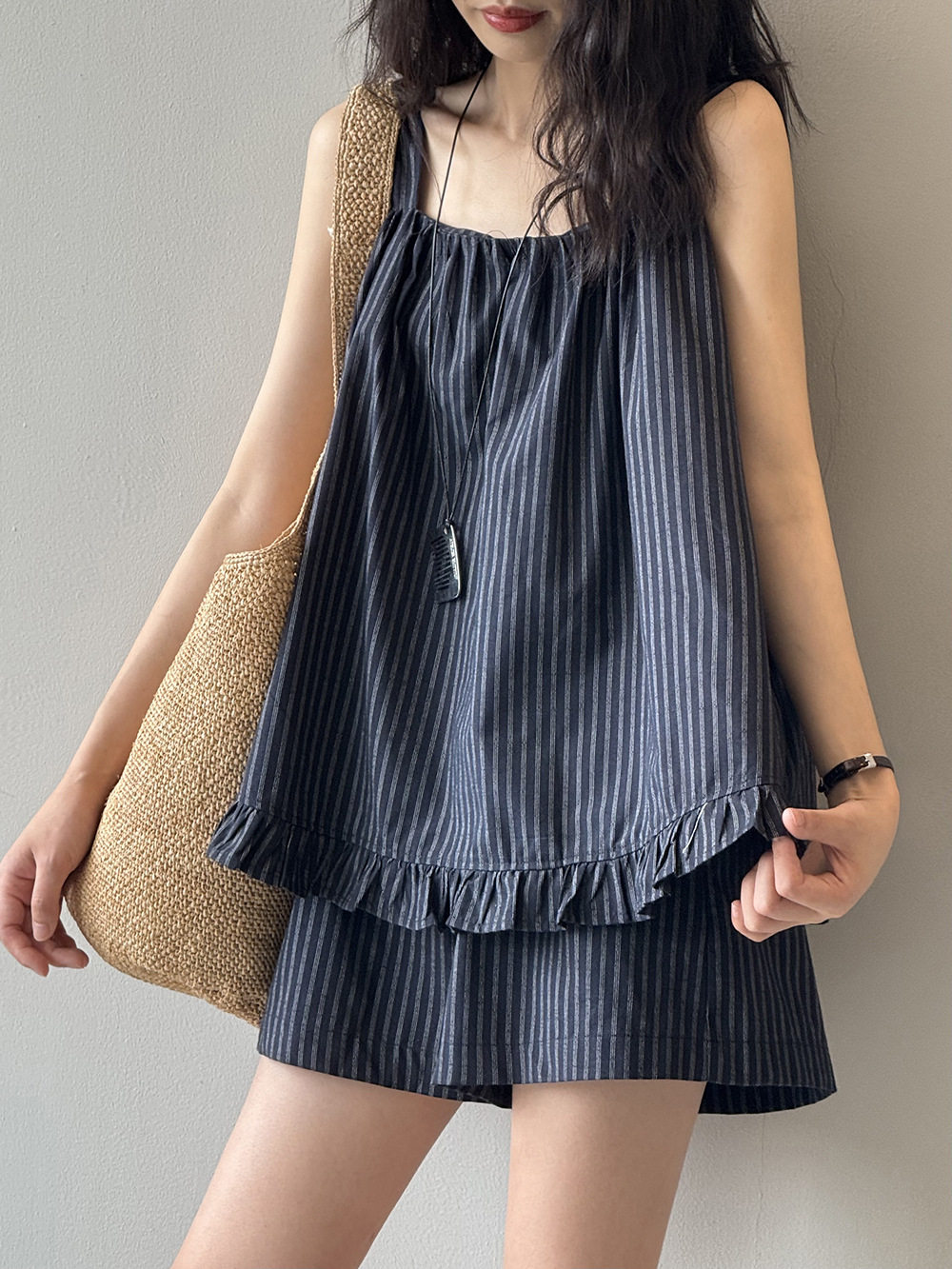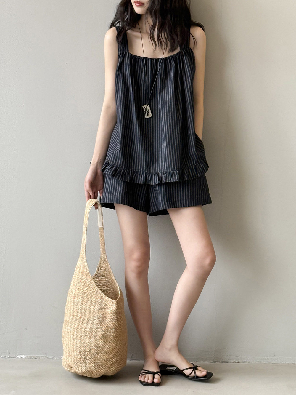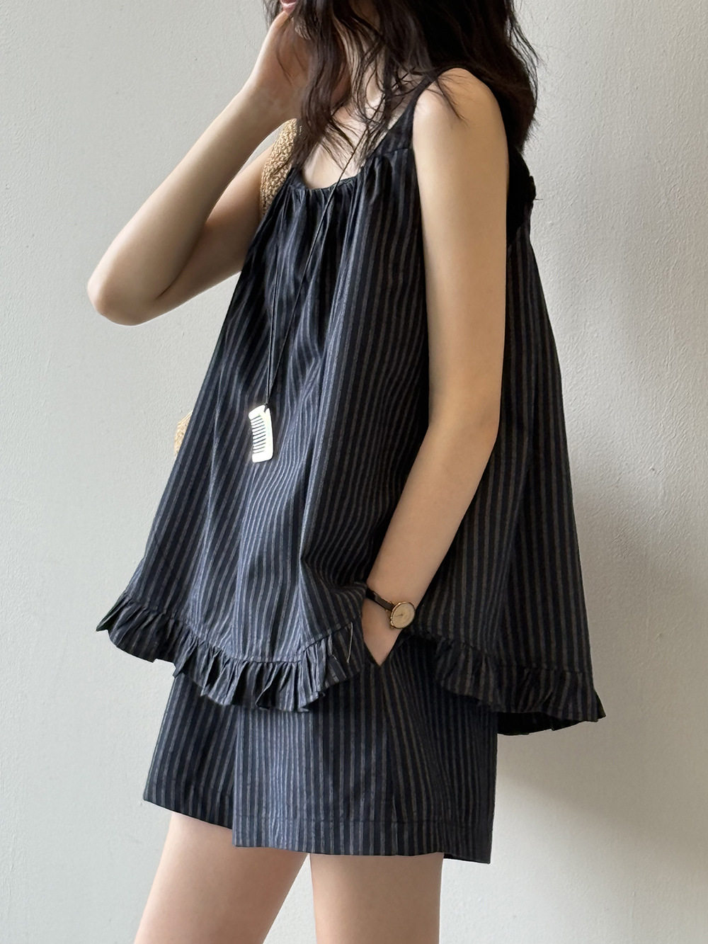 【商品名】【ボトムス】ストライプタンクトップシャツ+ゆったりスリム効果のあるショートパンツ 上下セット【JZシリーズ】