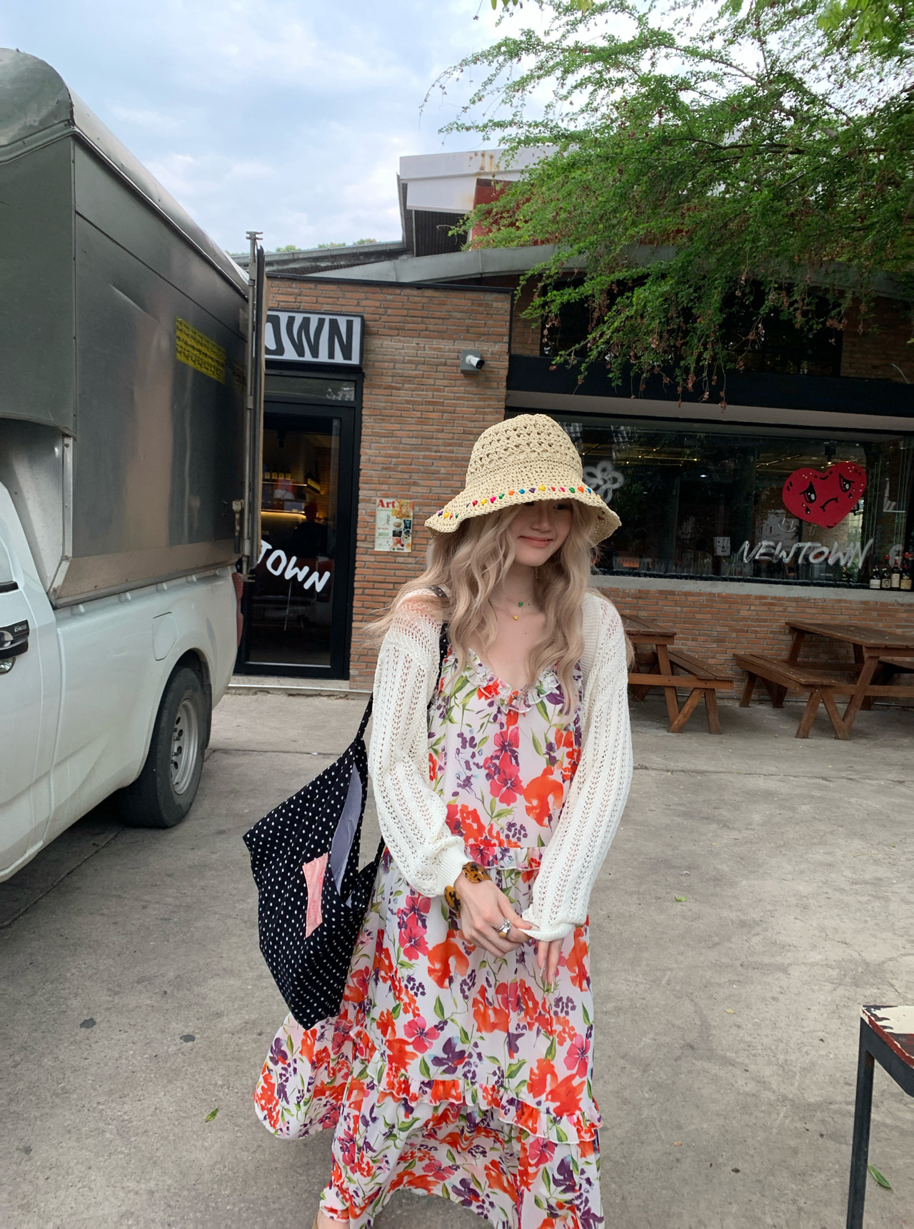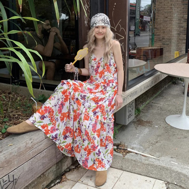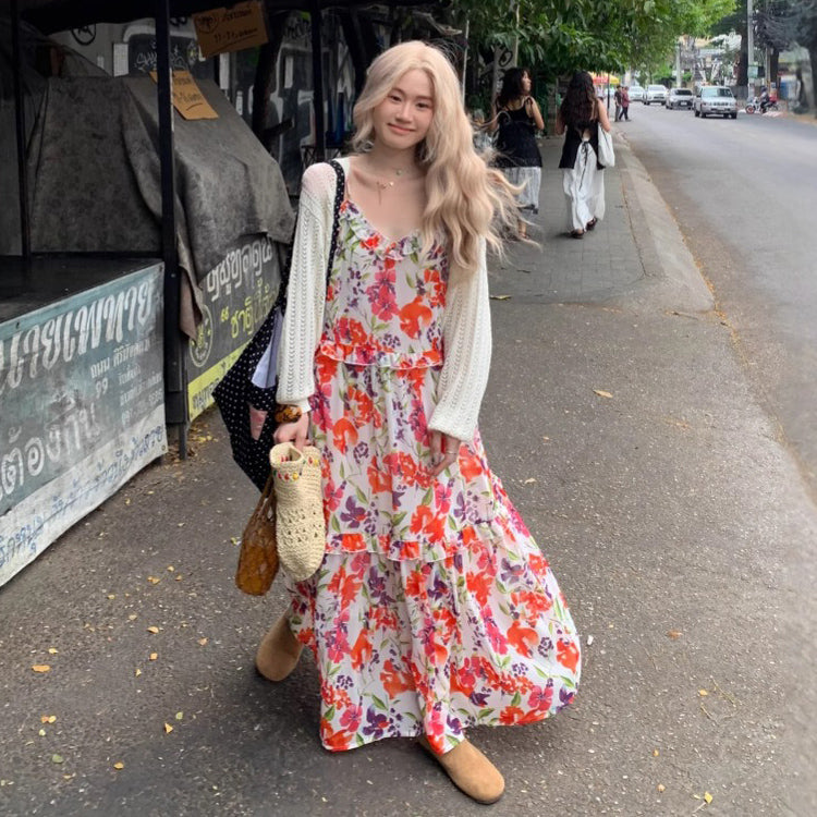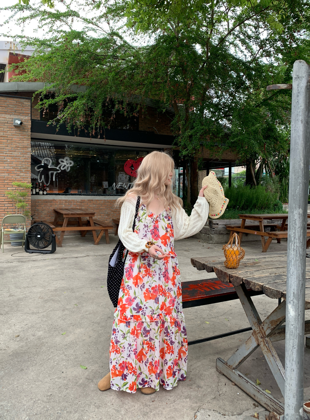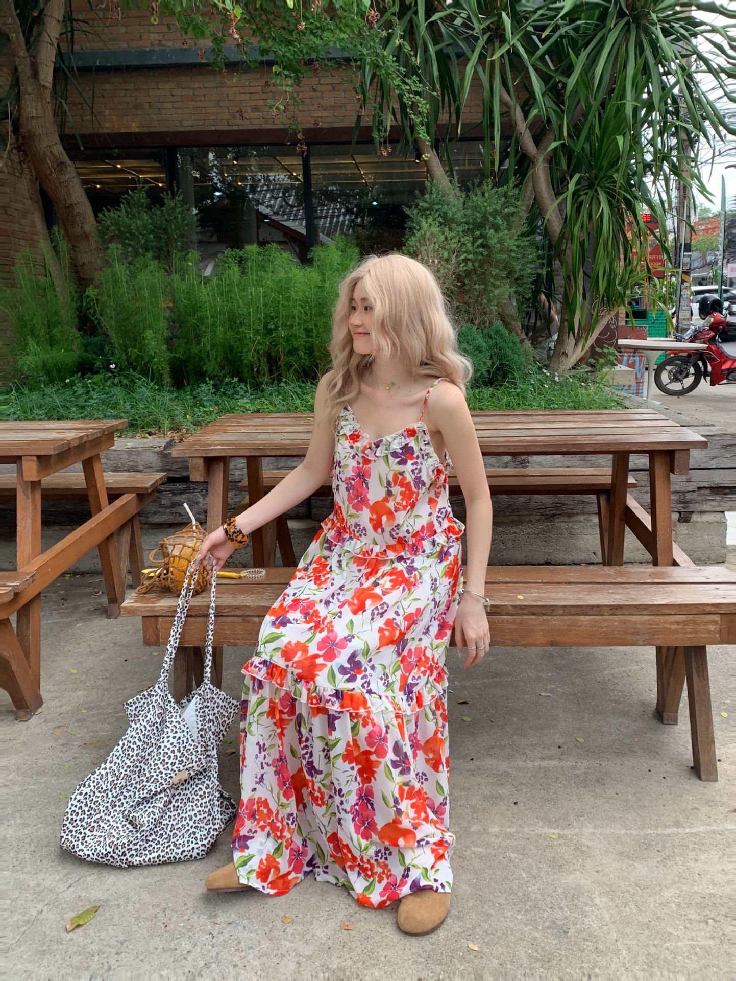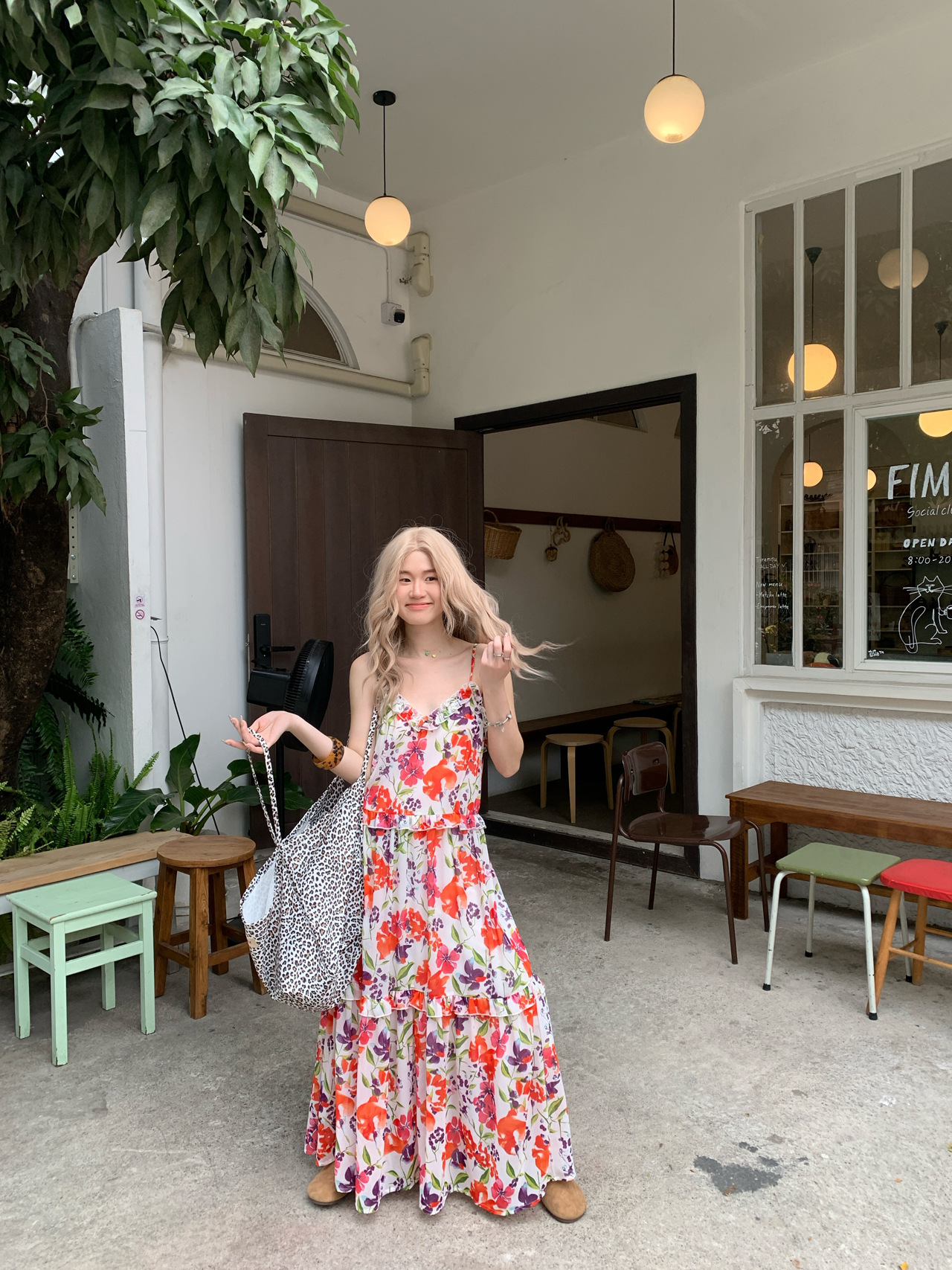 【ワンピース】夏 涼しげ 通気性 Vネック フリル付き 花柄 ノースリーブ キャミワンピース【SHシリーズ】