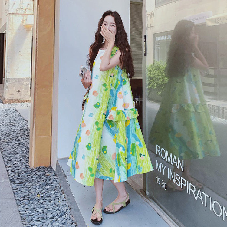 【ワンピース】韓国風 春秋新作 ゆったり大きめサイズ 体型カバー 花柄長袖ミディアムワンピース【SHシリーズ】