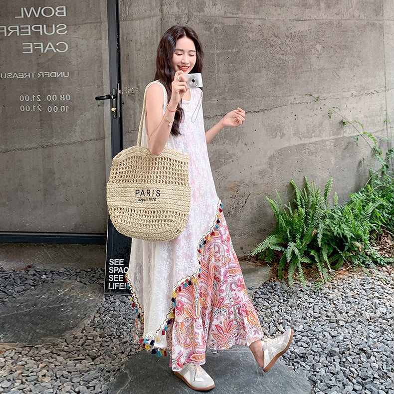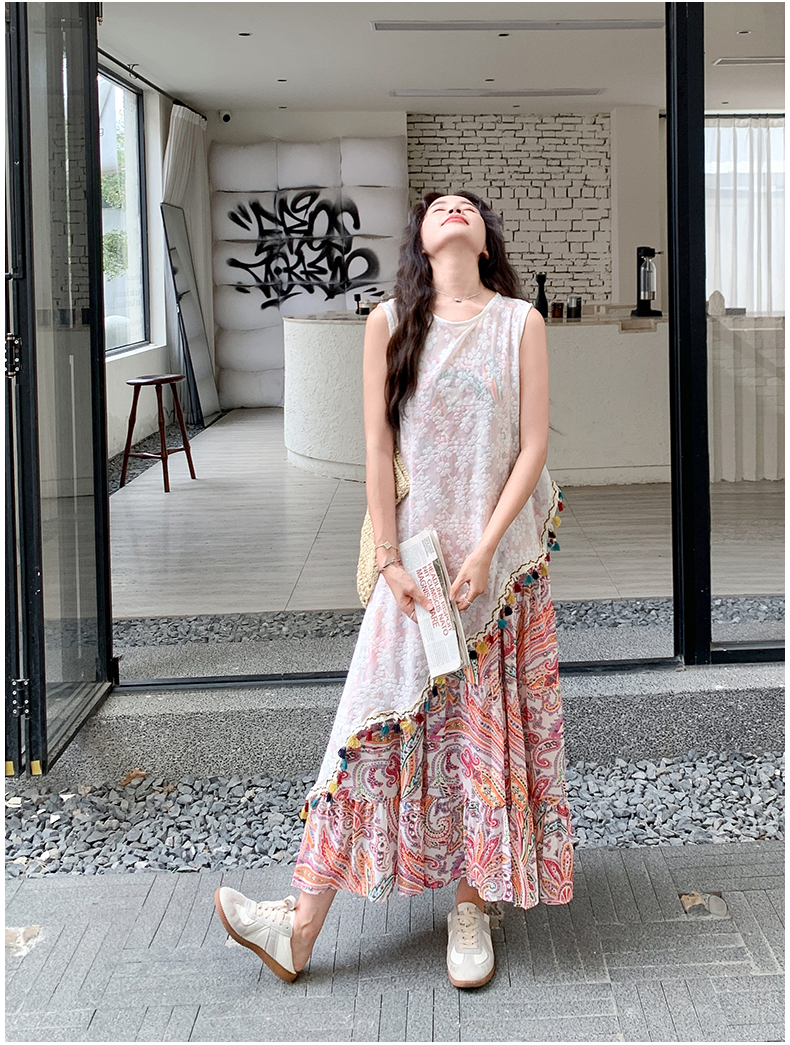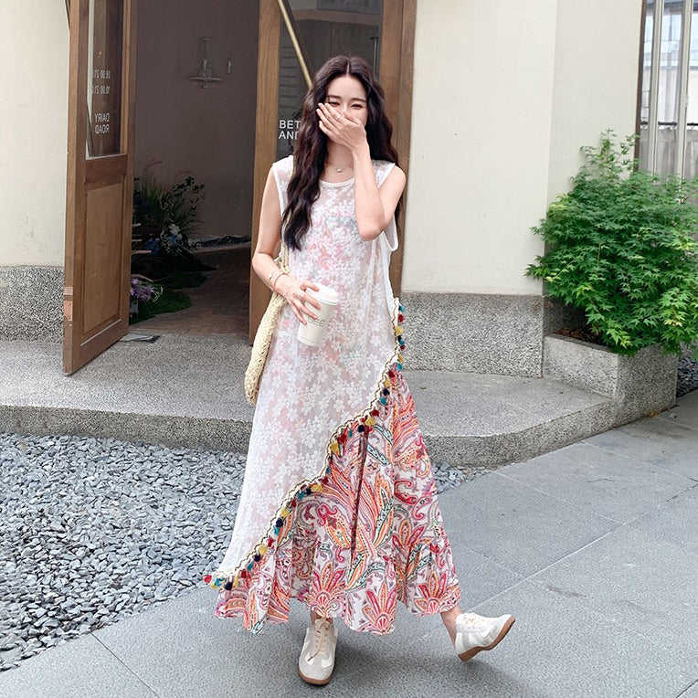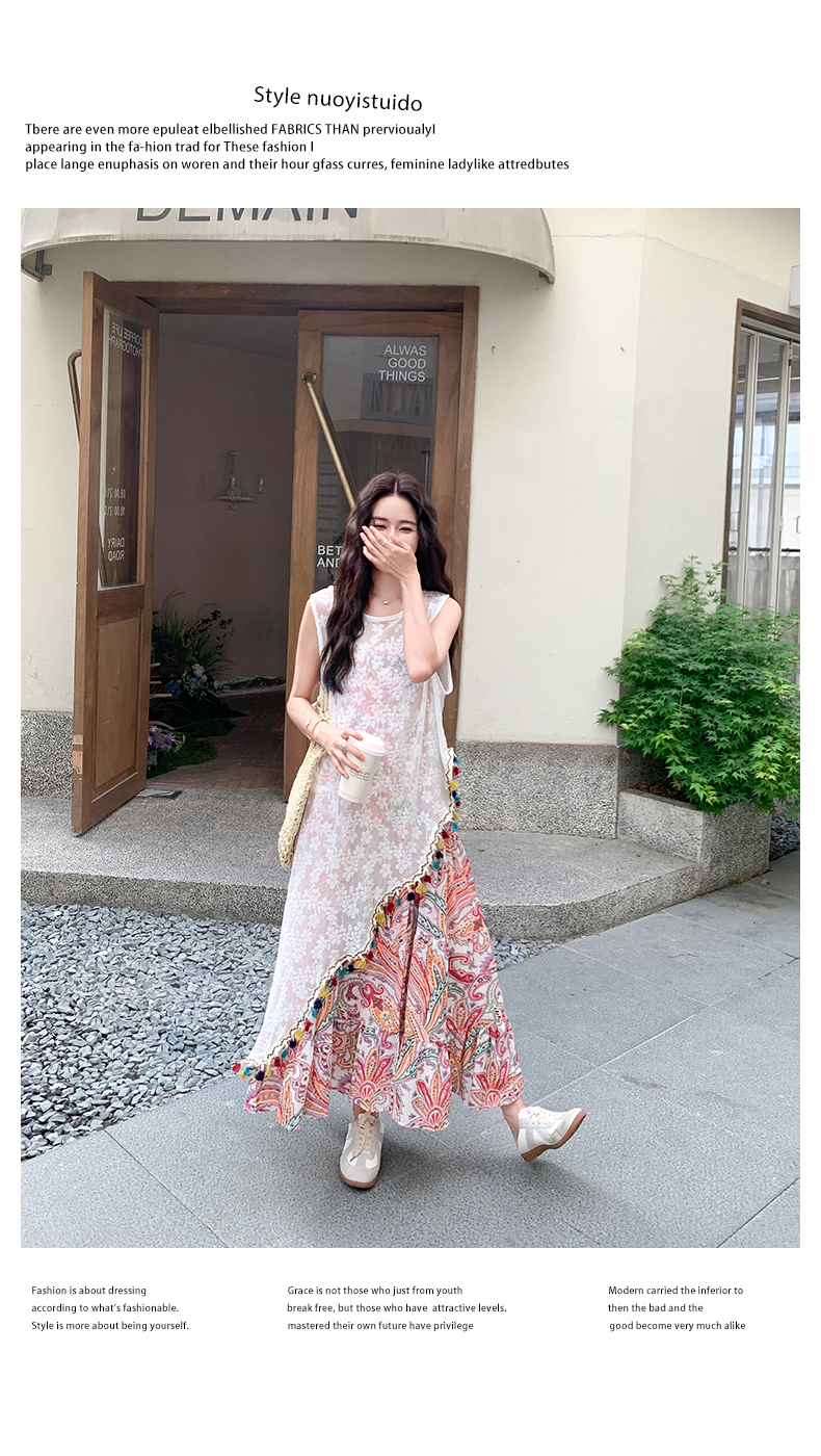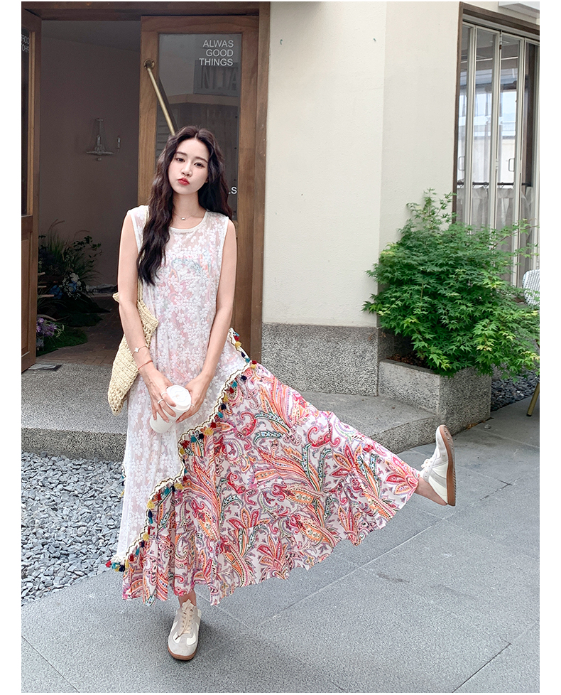 2点セット!【セットアップ】ボヘミアンレース刺繍シアーカーデ+花柄ノースリーブワンピース レイヤード風上下セット【SHシリーズ】
