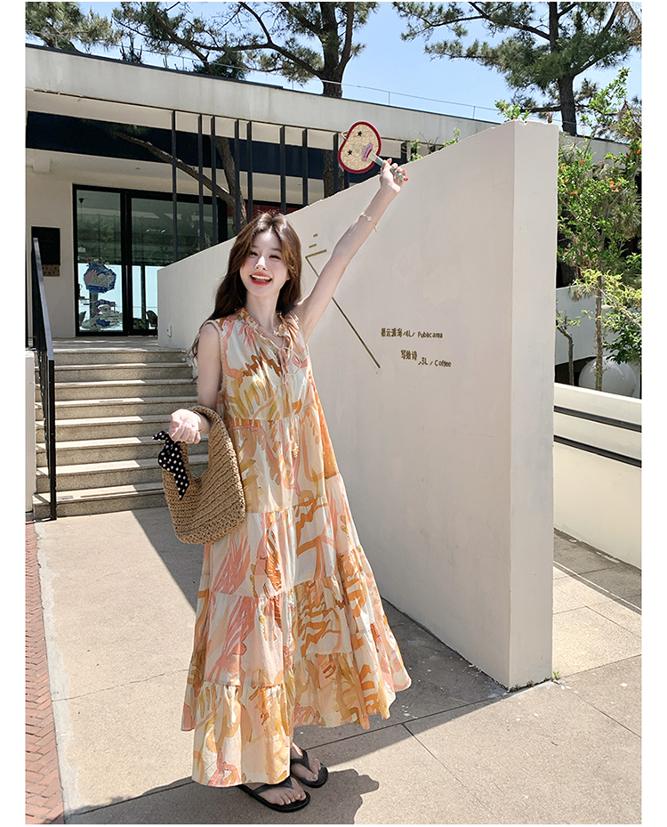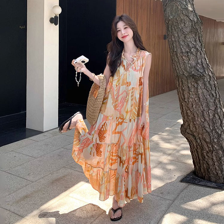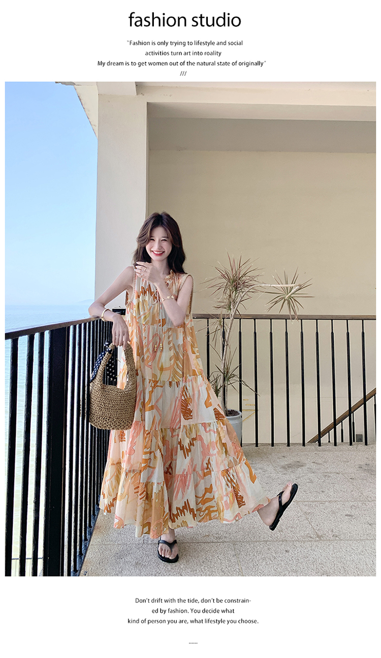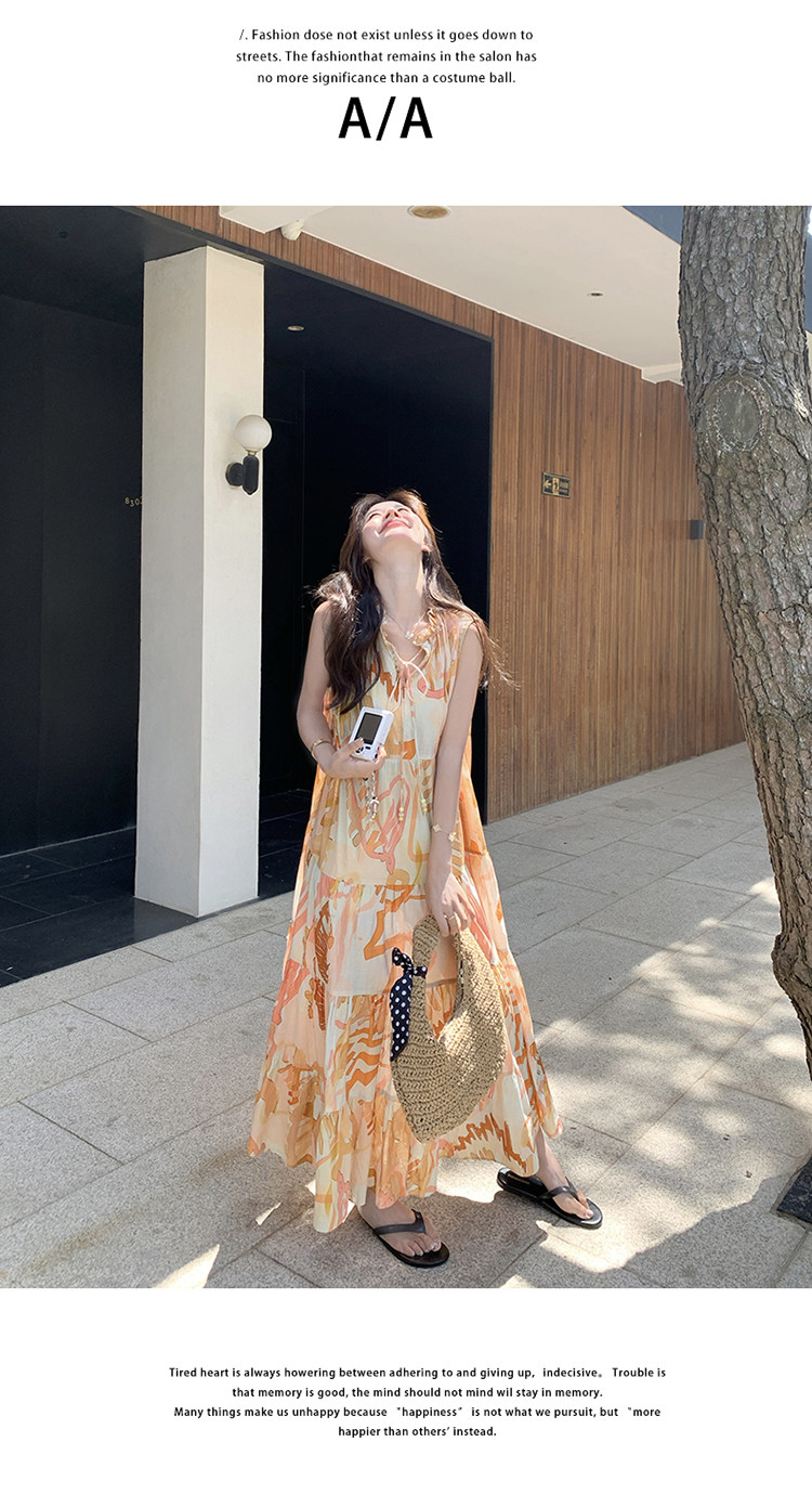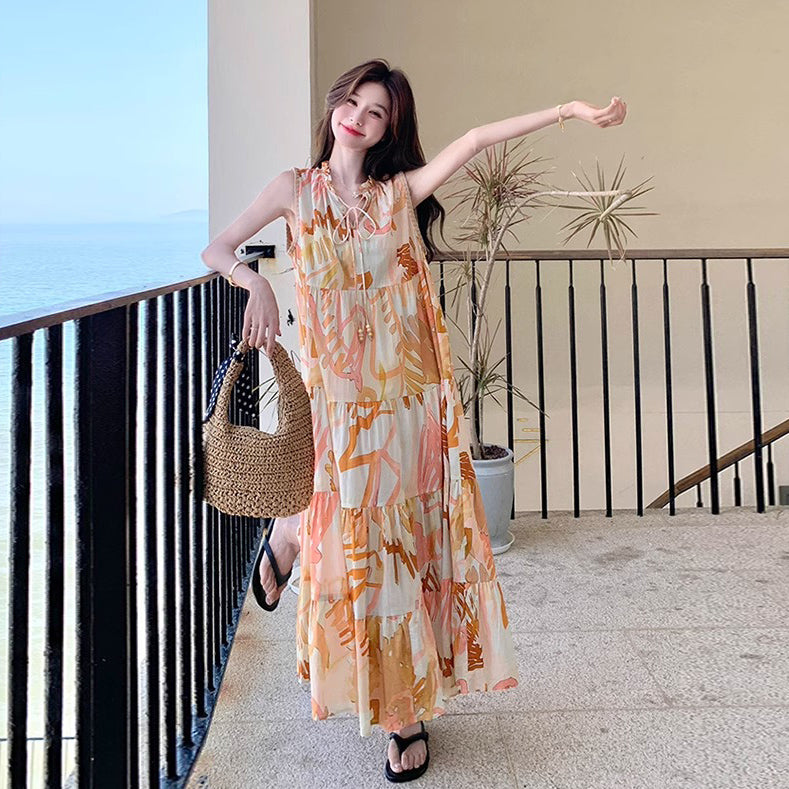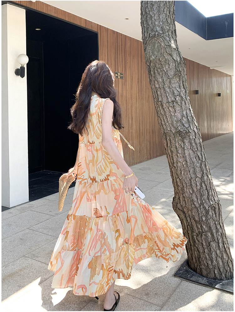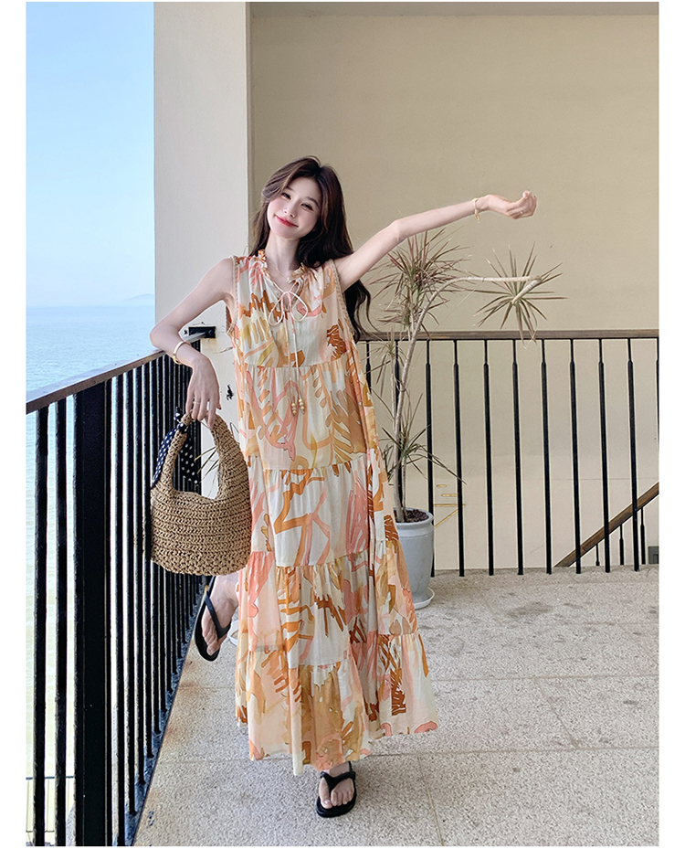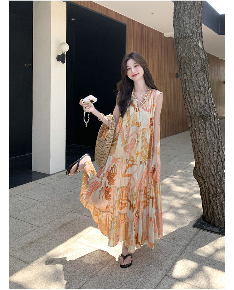 【ワンピース】高級感あふれるロマンティックリゾート風 シフォン花柄ノースリーブワンピース【SHシリーズ】
