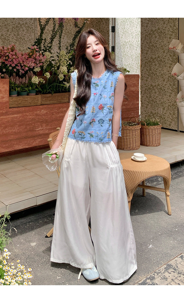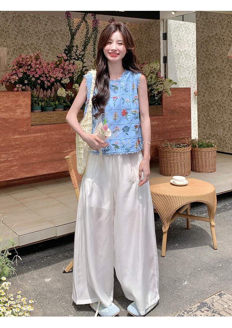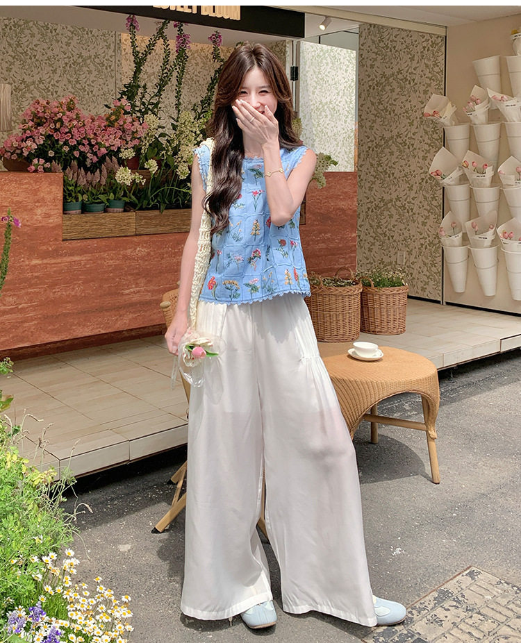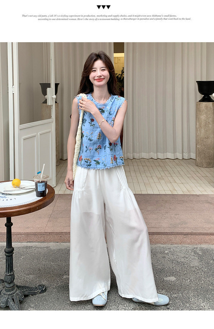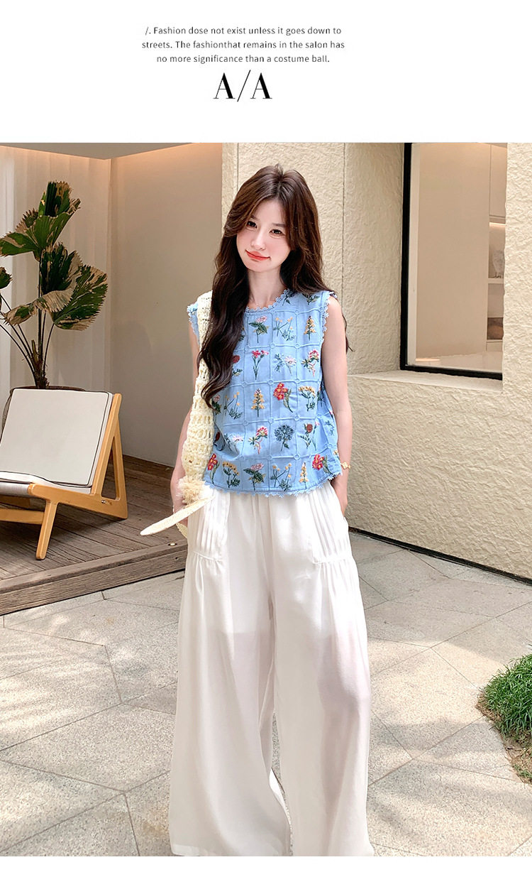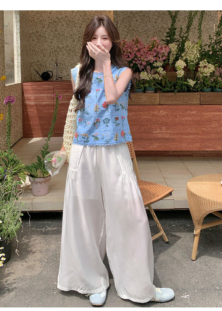 【商品名】2点セット!【ボトムス】フレンチレトロ 重厚感フラワー刺繍 ノースリーブブラウス+ワイドパンツ 上下セット【SHシリーズ】