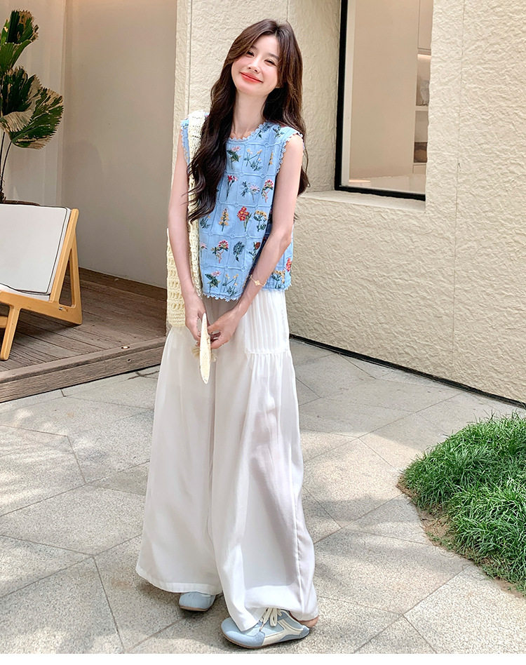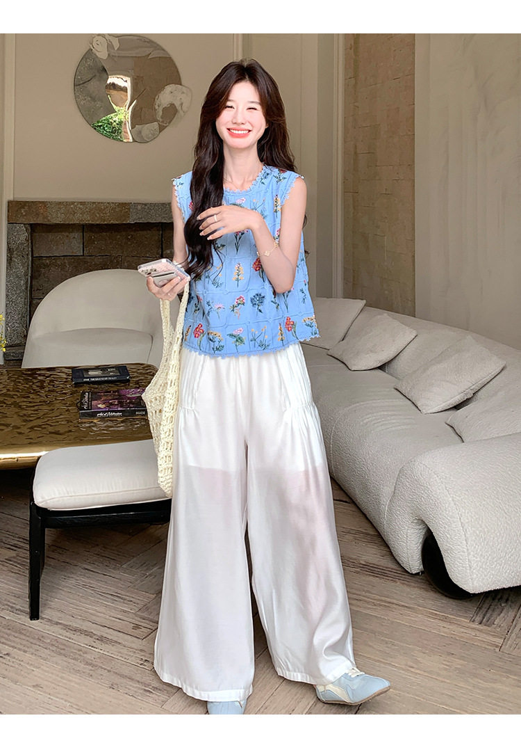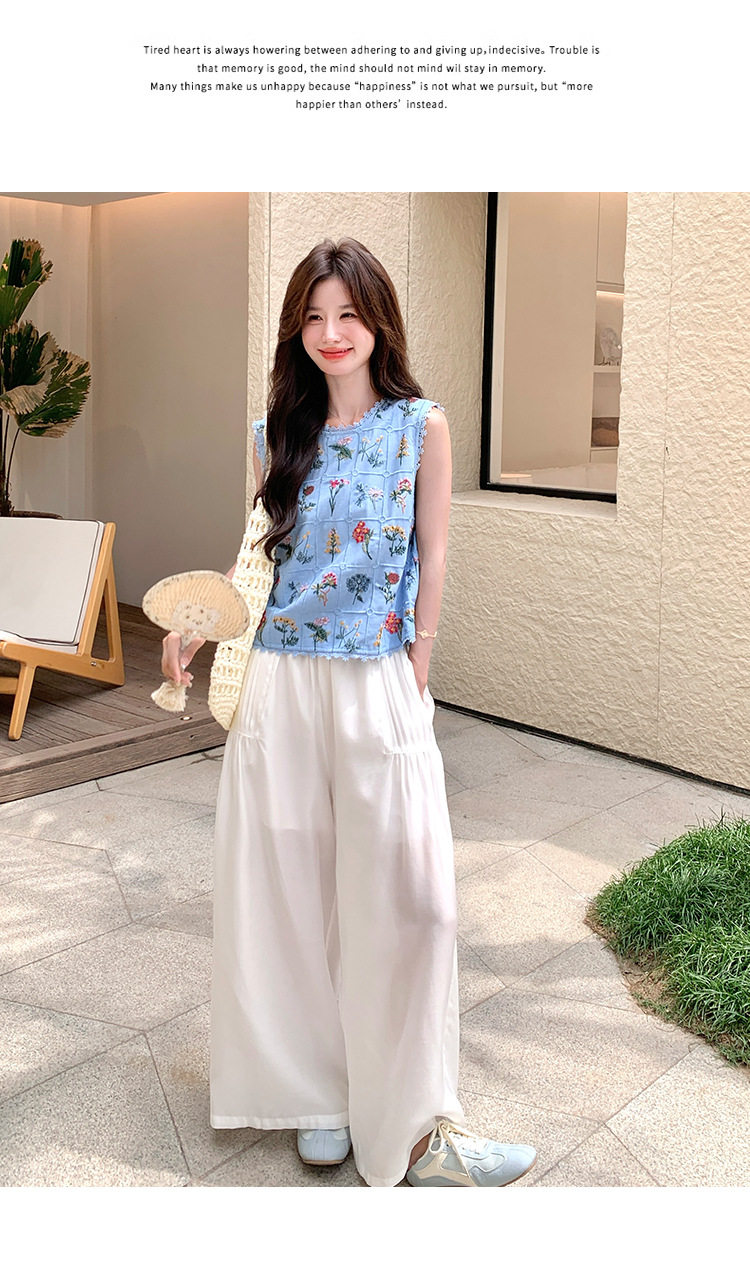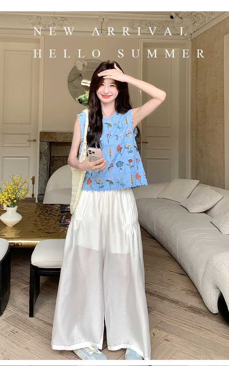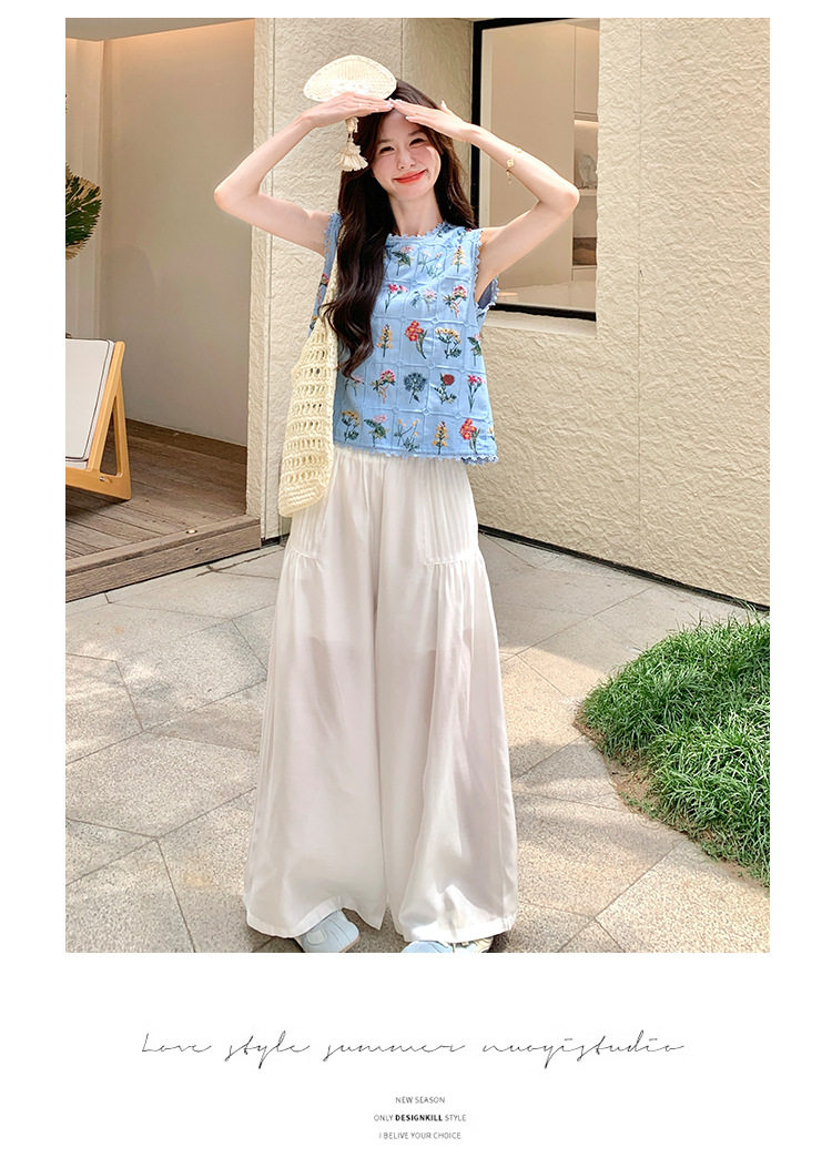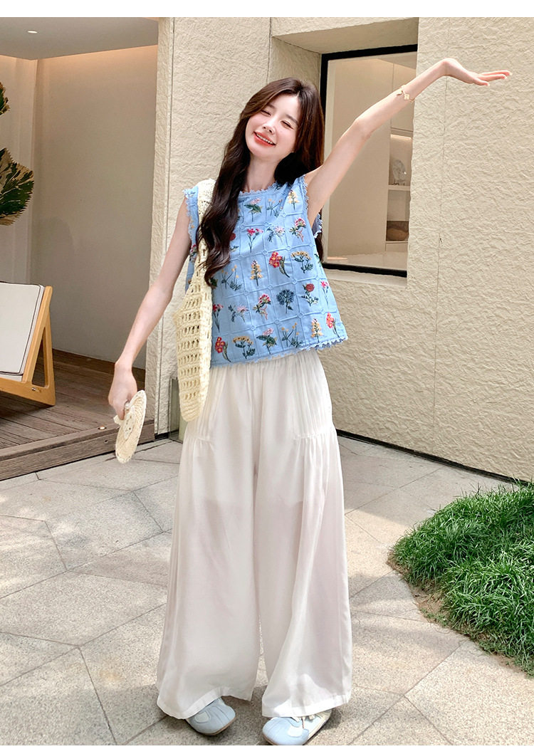 【商品名】2点セット!【ボトムス】フレンチレトロ 重厚感フラワー刺繍 ノースリーブブラウス+ワイドパンツ 上下セット【SHシリーズ】
