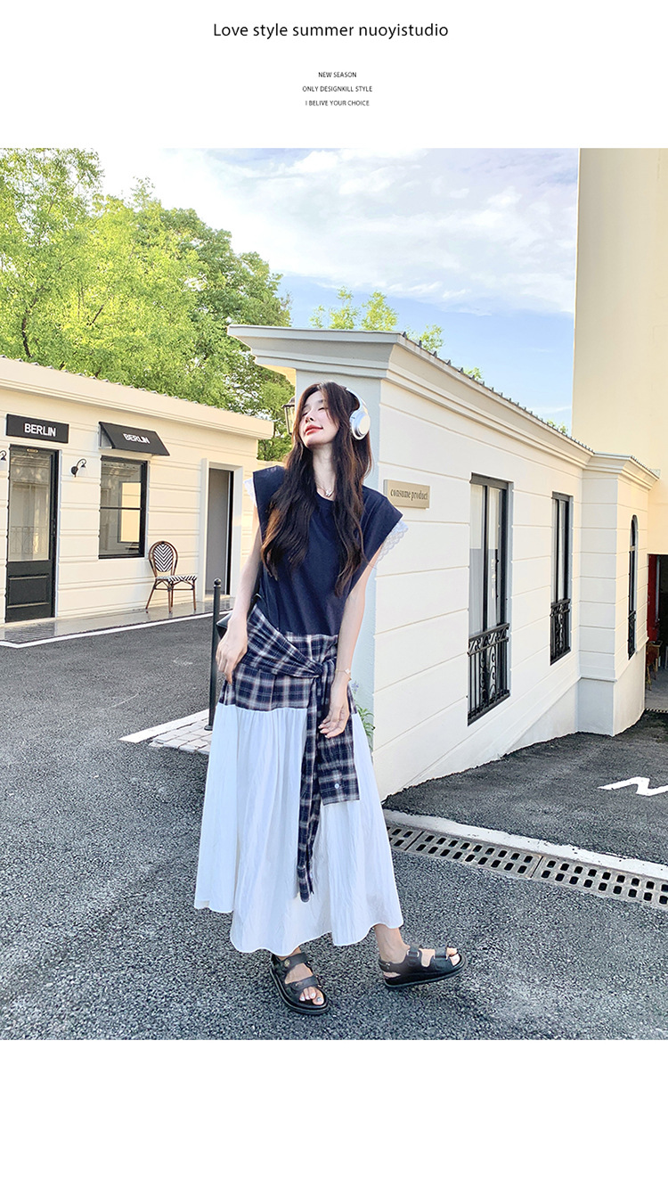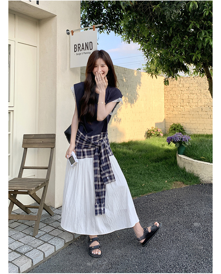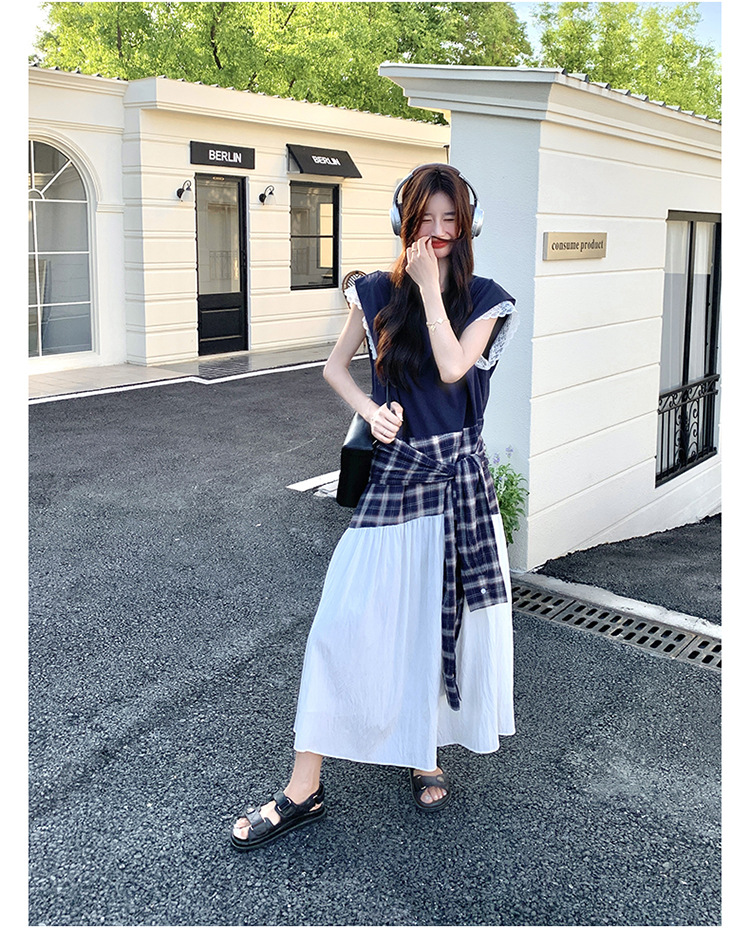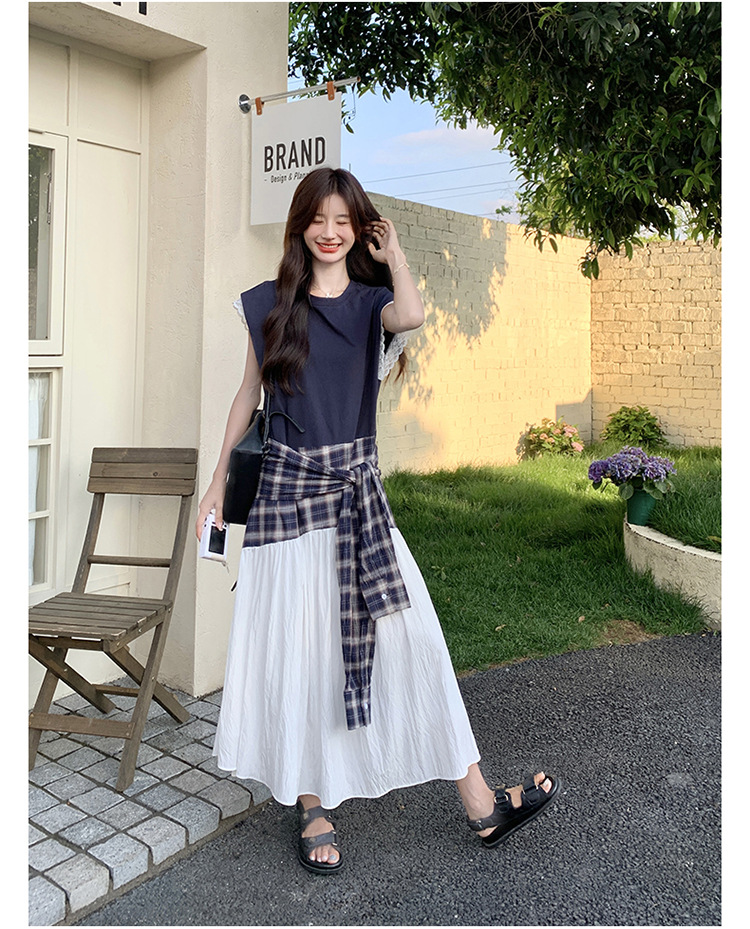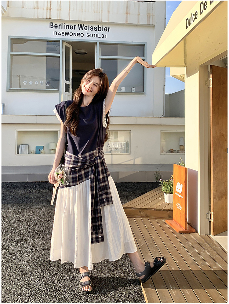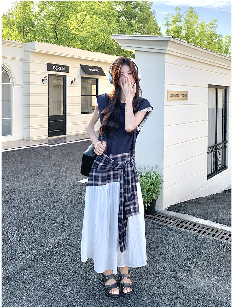 【ワンピース】夏 韓国風カジュアルな雰囲気コーデ チェック柄×レース切り替え ノースリーブワンピース【SHシリーズ】