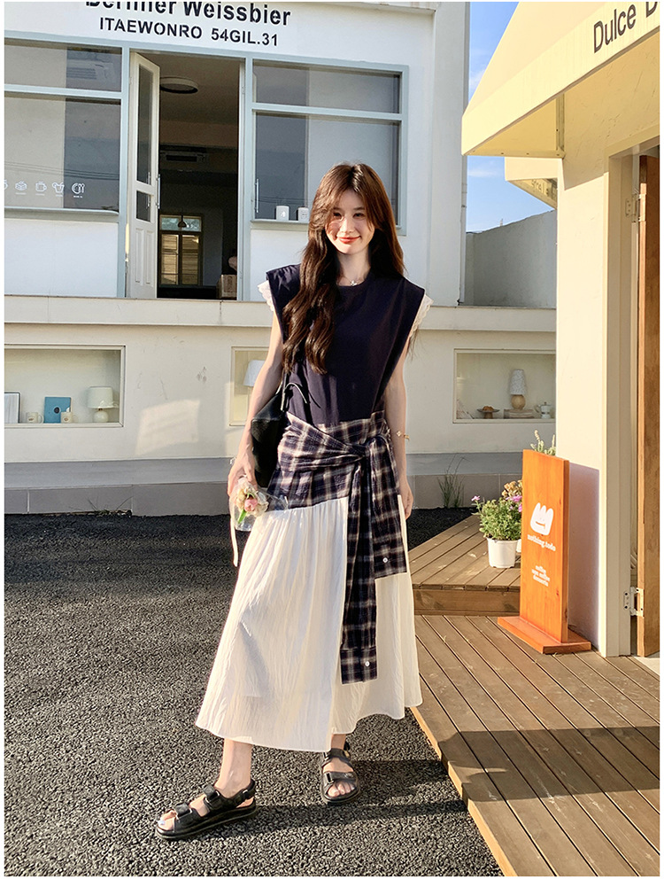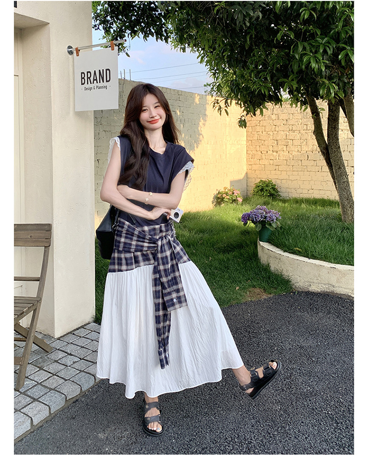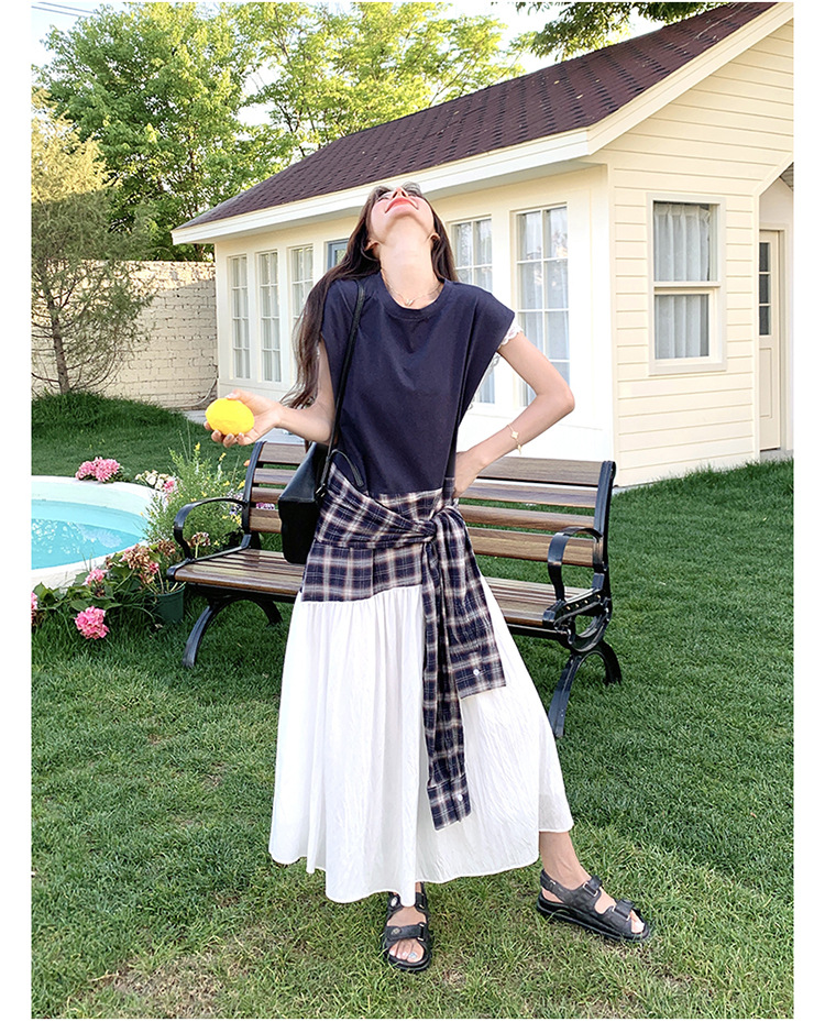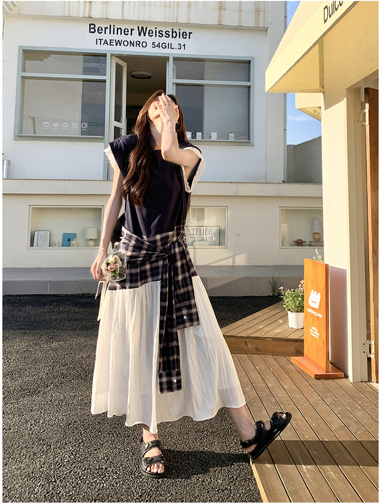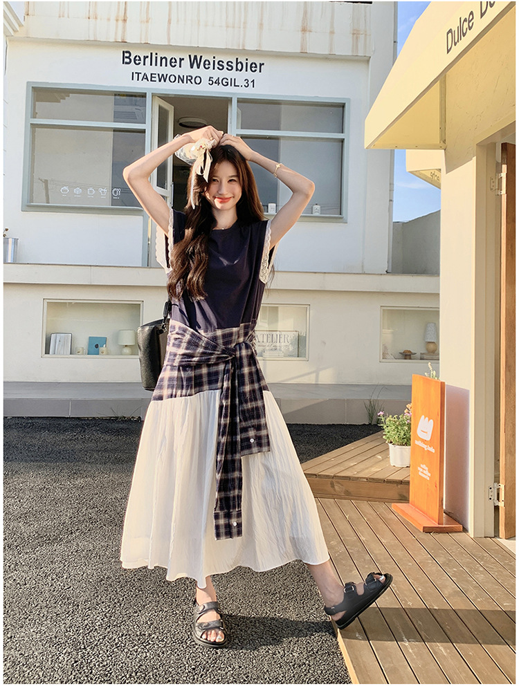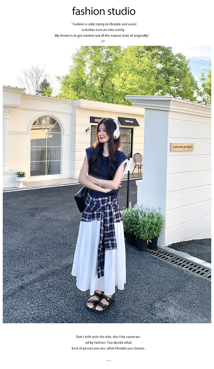 【ワンピース】夏 韓国風カジュアルな雰囲気コーデ チェック柄×レース切り替え ノースリーブワンピース【SHシリーズ】