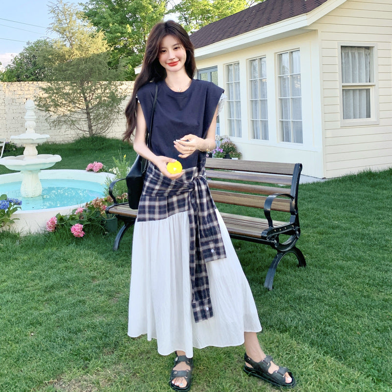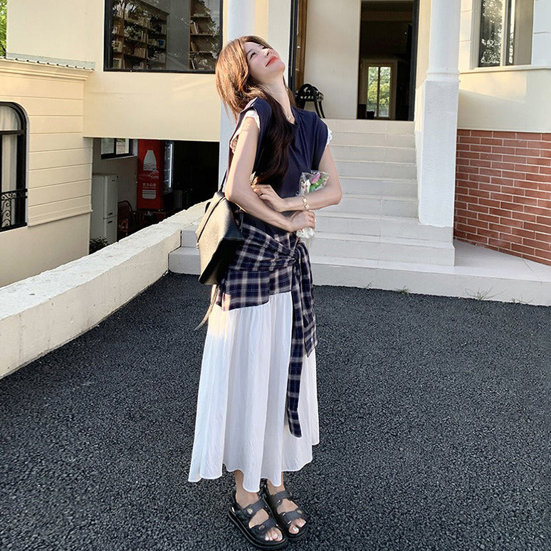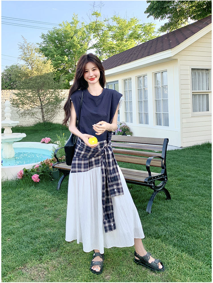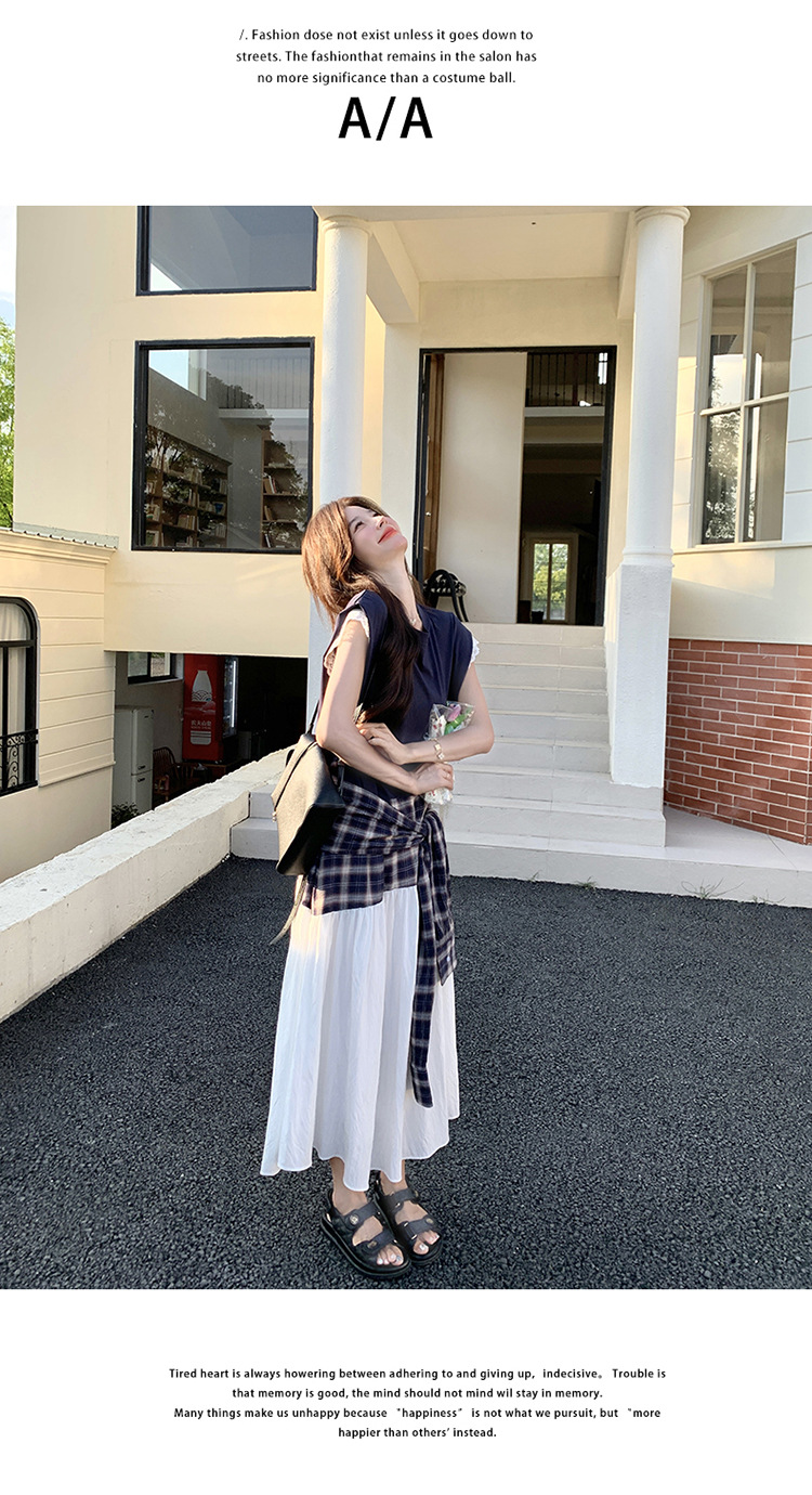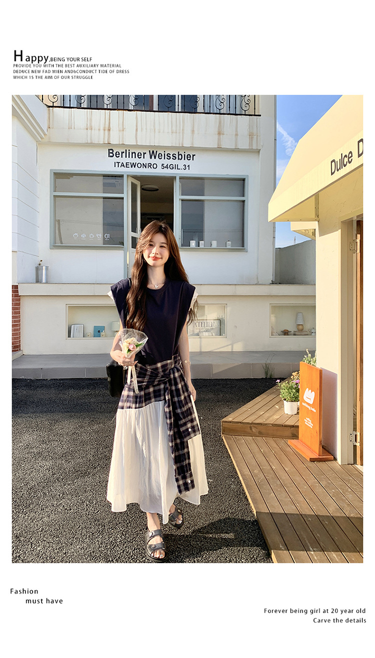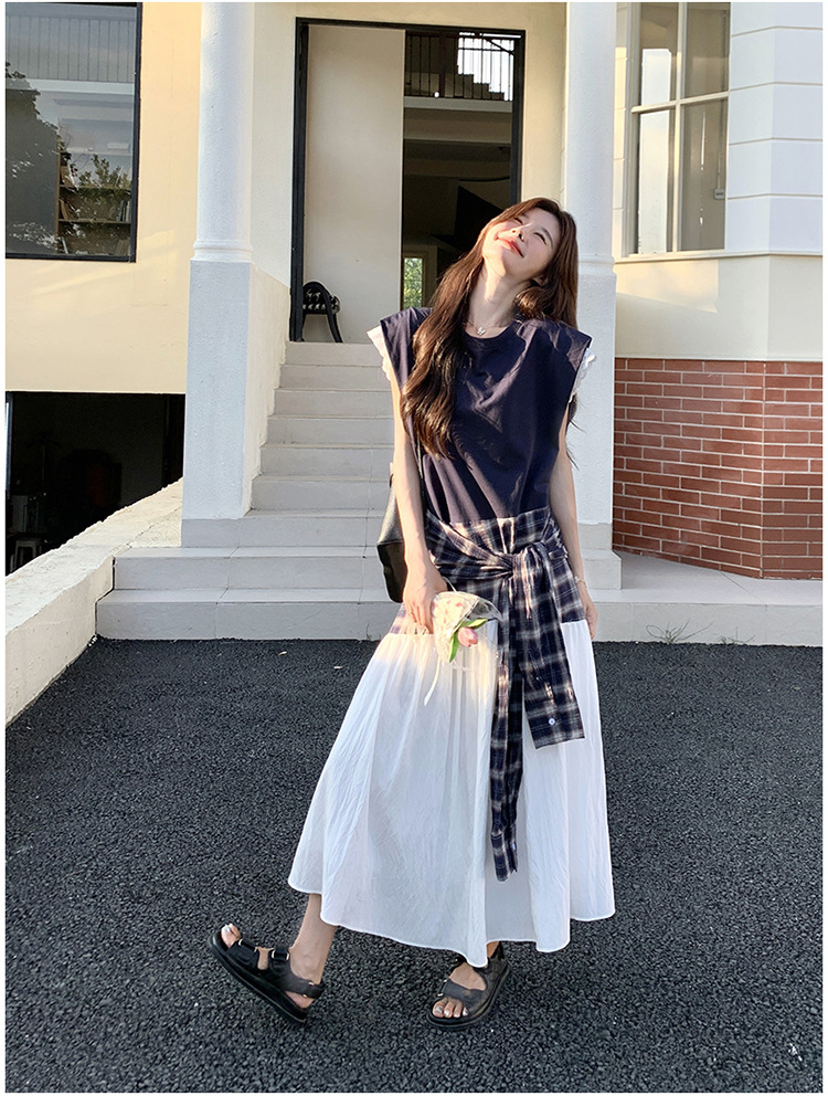 【ワンピース】夏 韓国風カジュアルな雰囲気コーデ チェック柄×レース切り替え ノースリーブワンピース【SHシリーズ】