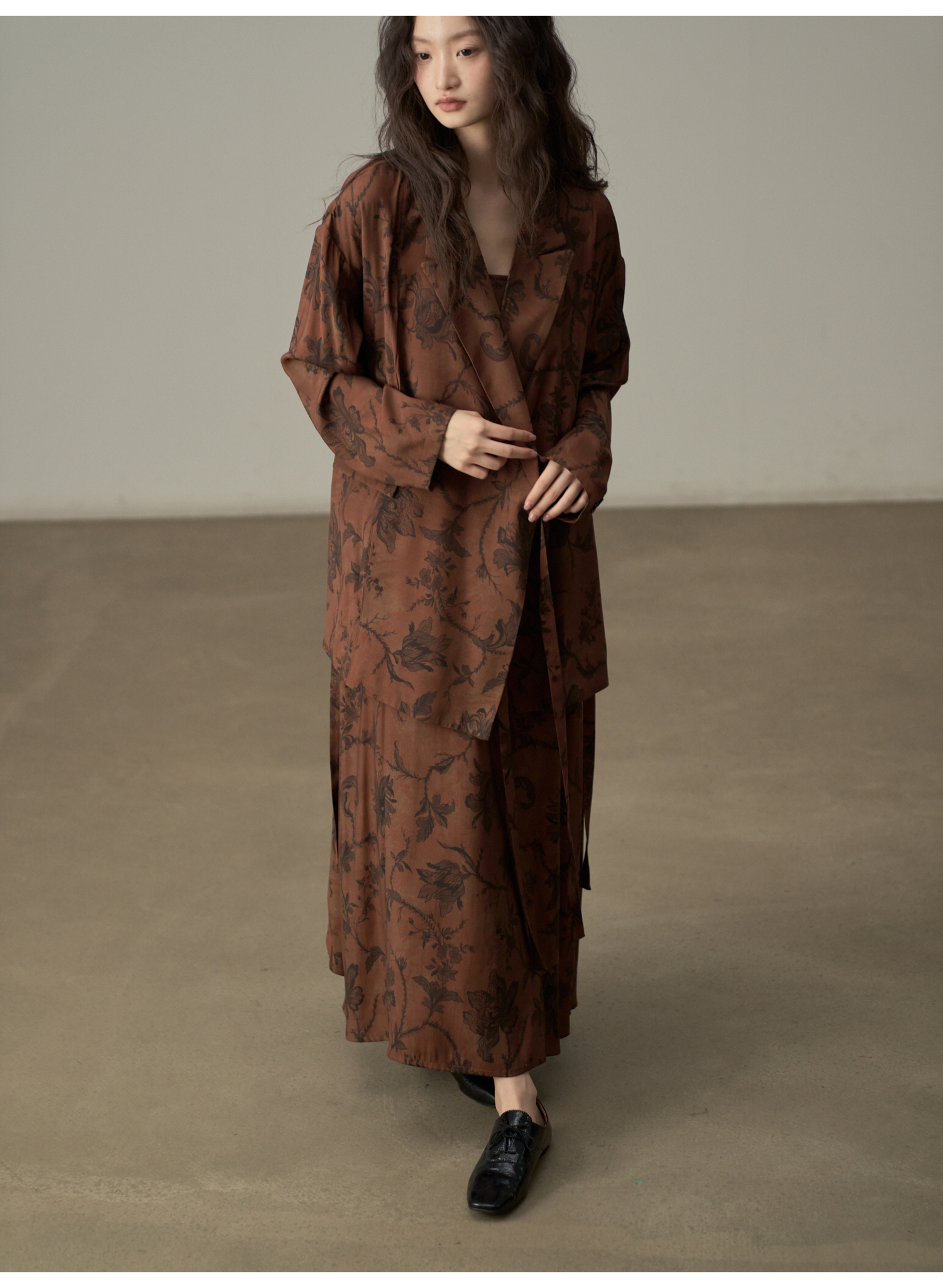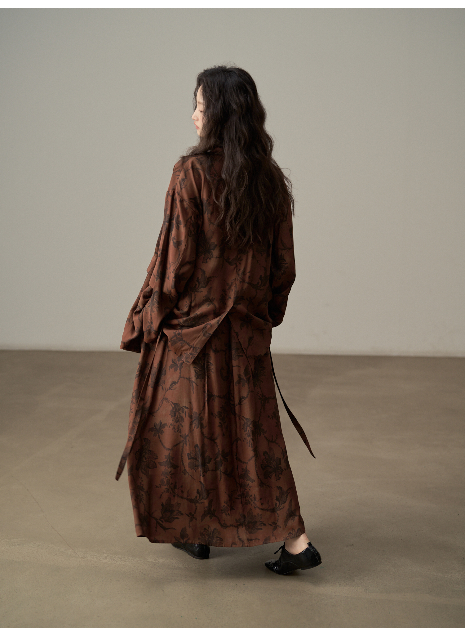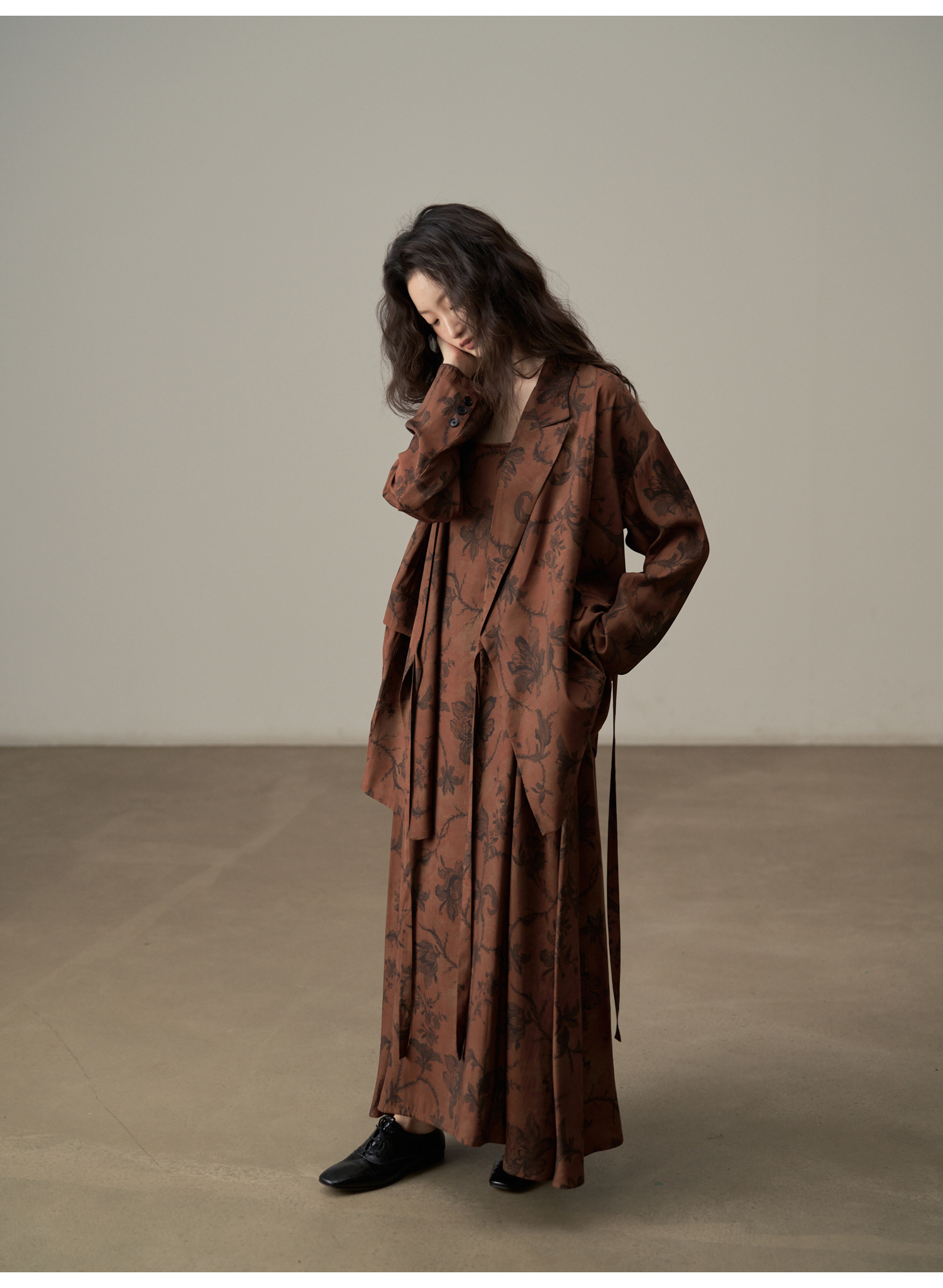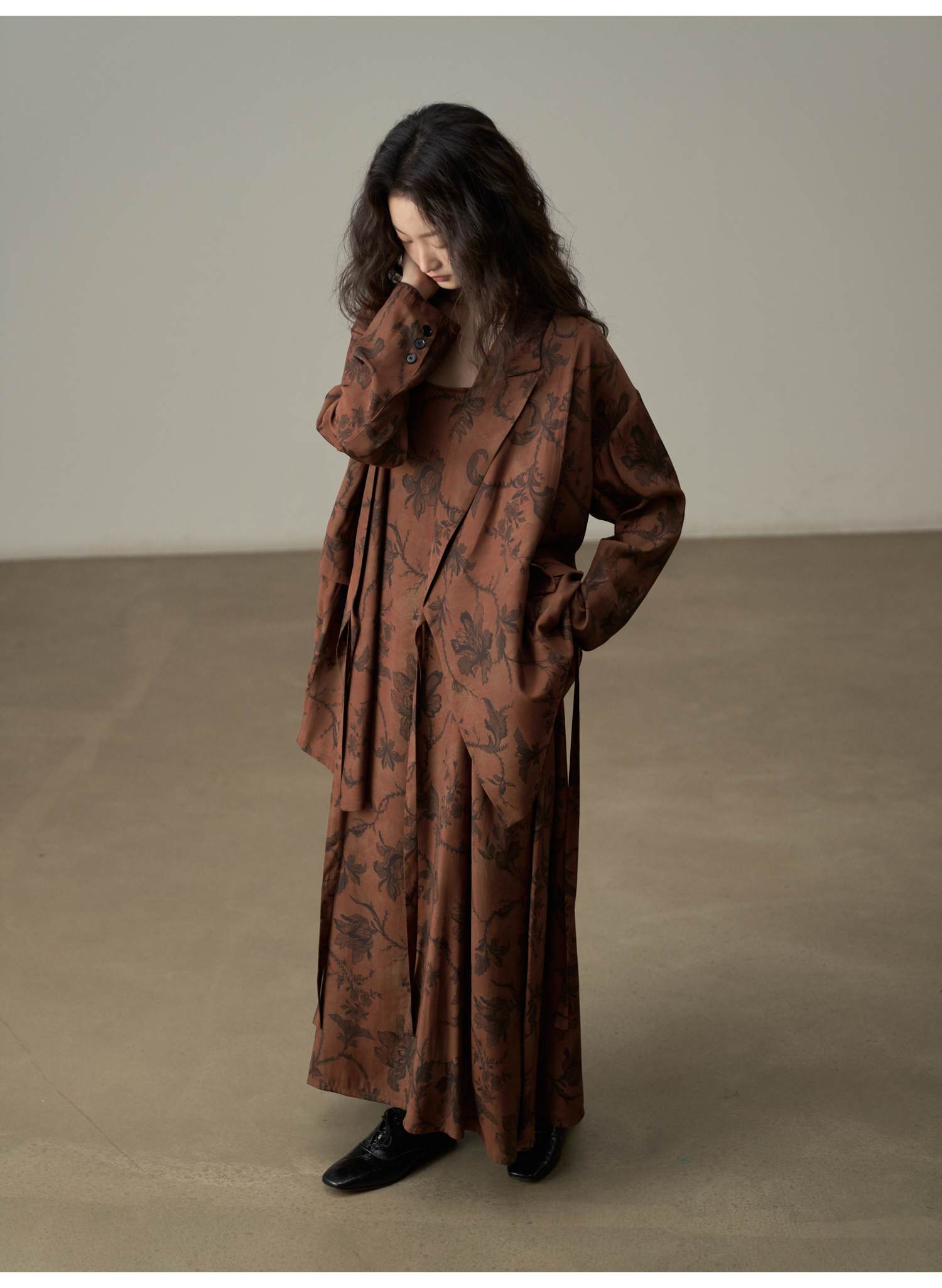 【ワンピース】韓国風 春秋新作 ゆったり大きめサイズ 体型カバー 花柄長袖ミディアムワンピース【SHシリーズ】