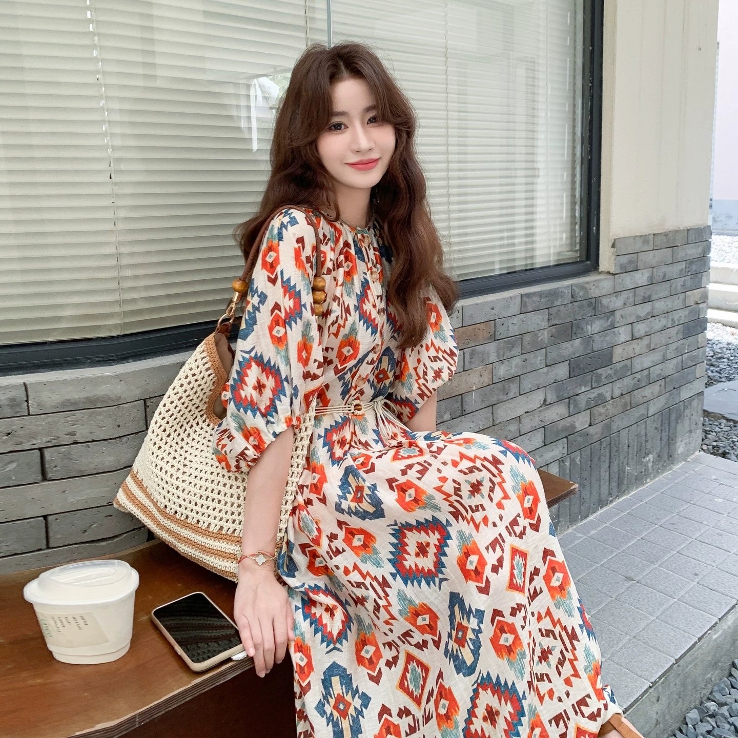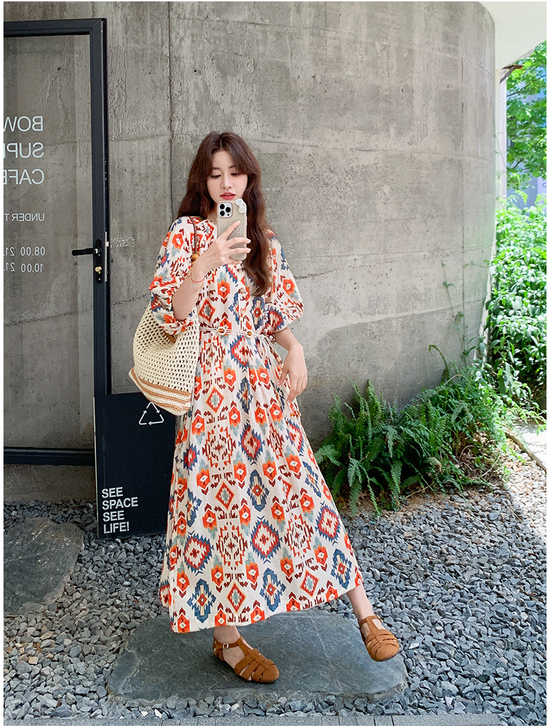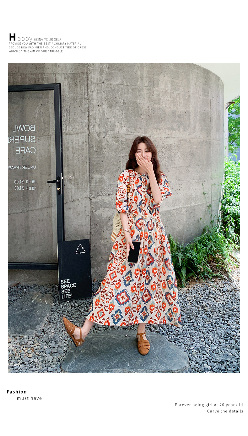 【商品名】【ワンピース】夏 フレンチ風 旅行リゾート風 プリント パフスリーブ 半袖ワンピース【SHシリーズ】