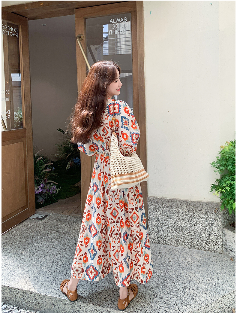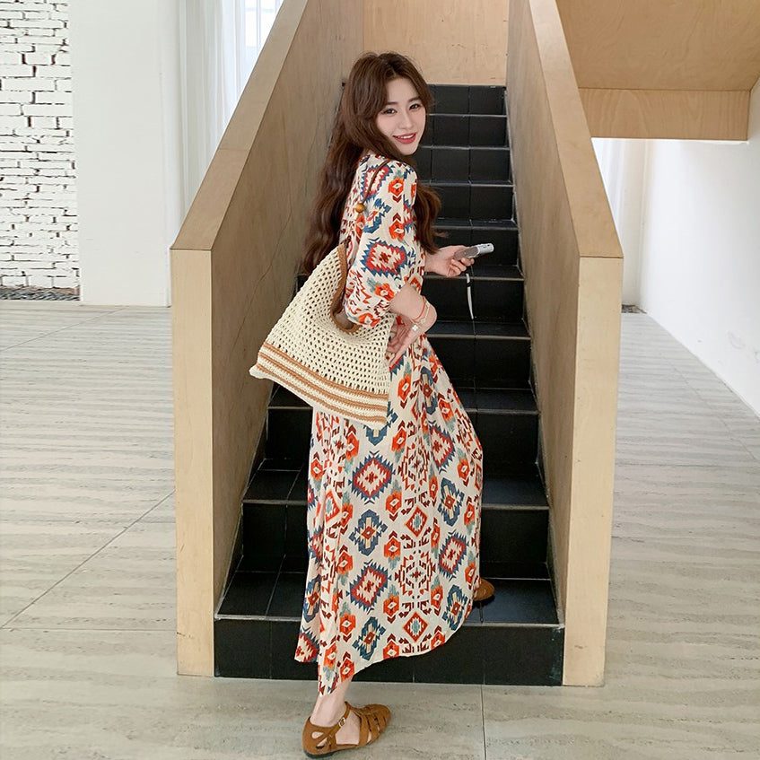 【ワンピース】韓国風 春秋新作 ゆったり大きめサイズ 体型カバー 花柄長袖ミディアムワンピース【SHシリーズ】