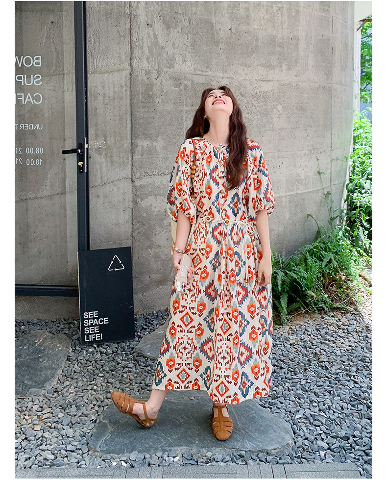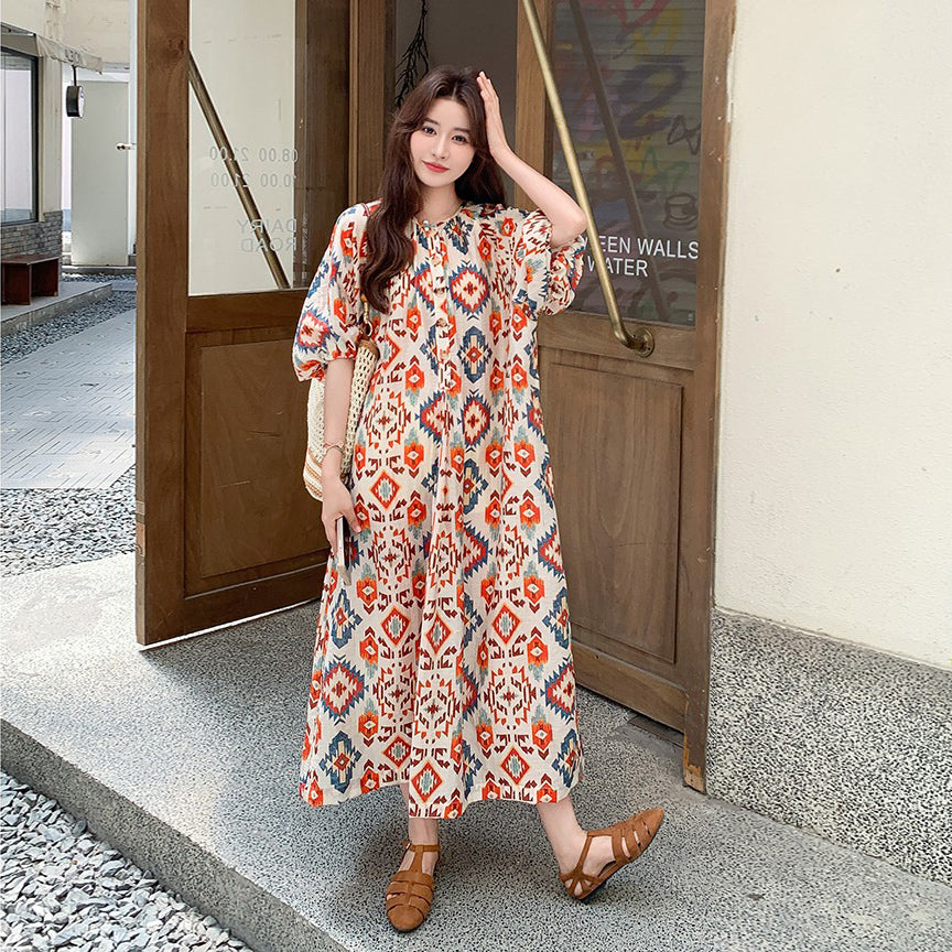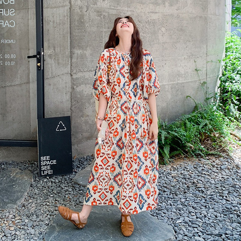 【ワンピース】夏 フレンチ風 旅行リゾート風 プリント パフスリーブ 半袖ワンピース【SHシリーズ】