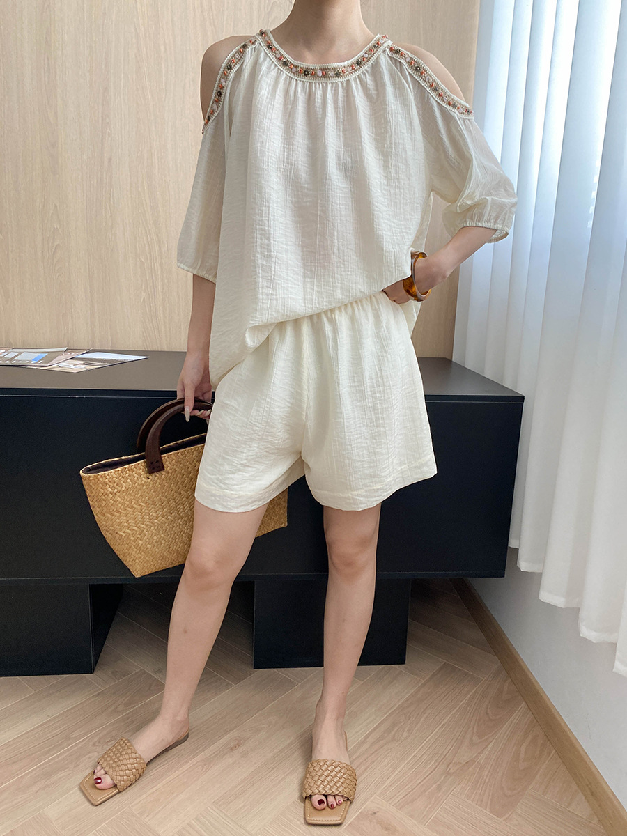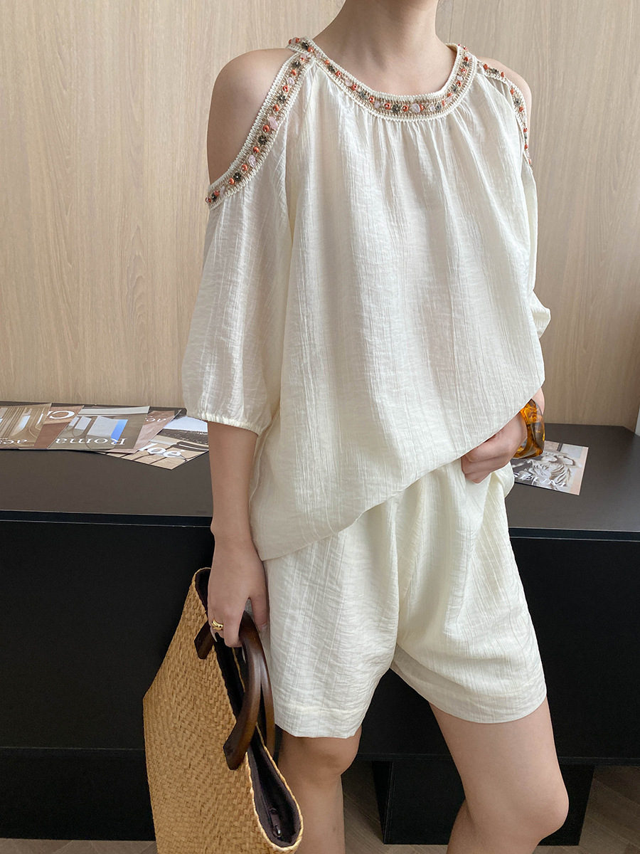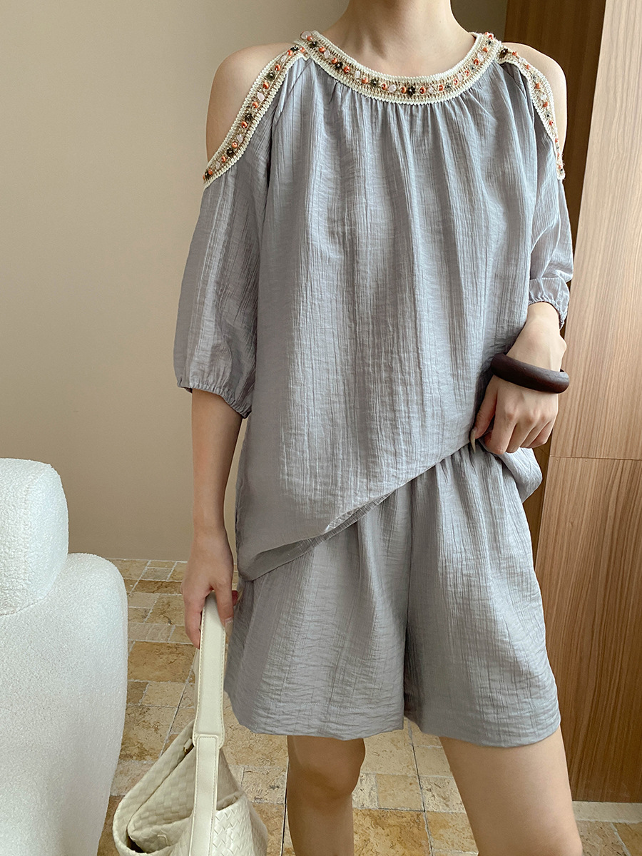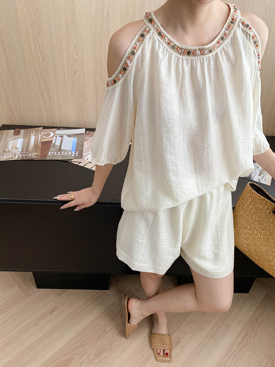 2点セット!【セットアップ】編み込みビーズ オフショルダーブラウス+ワイドレッグショートパンツ 上下セット【JZシリーズ】