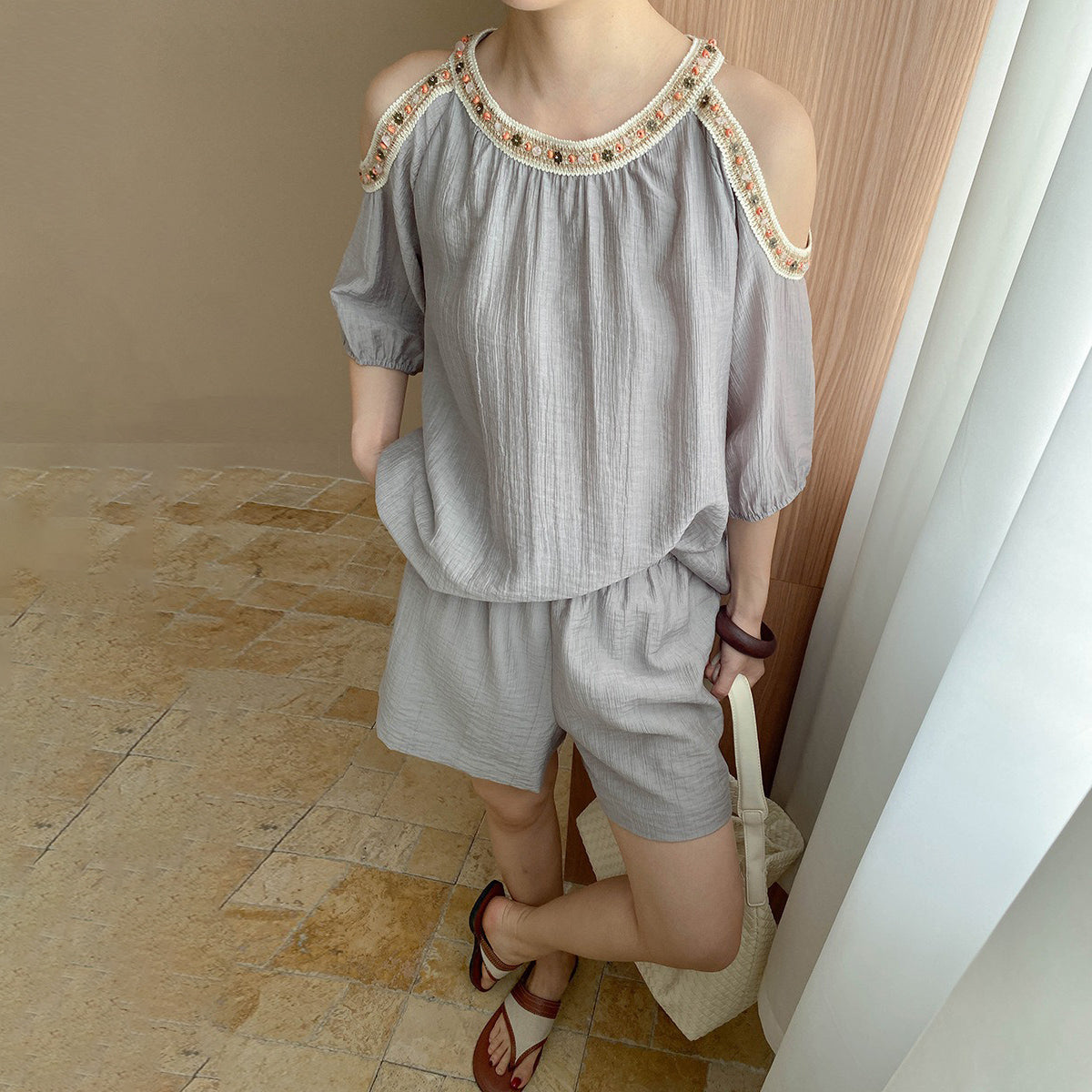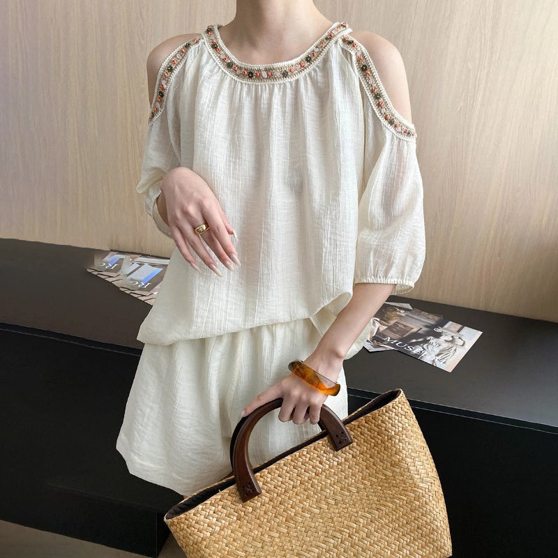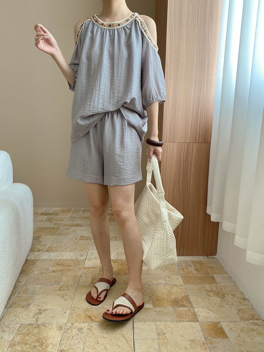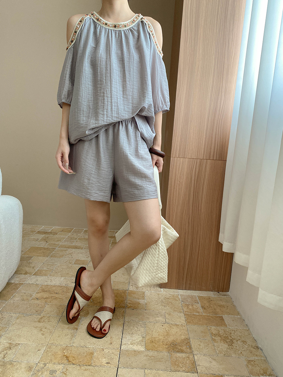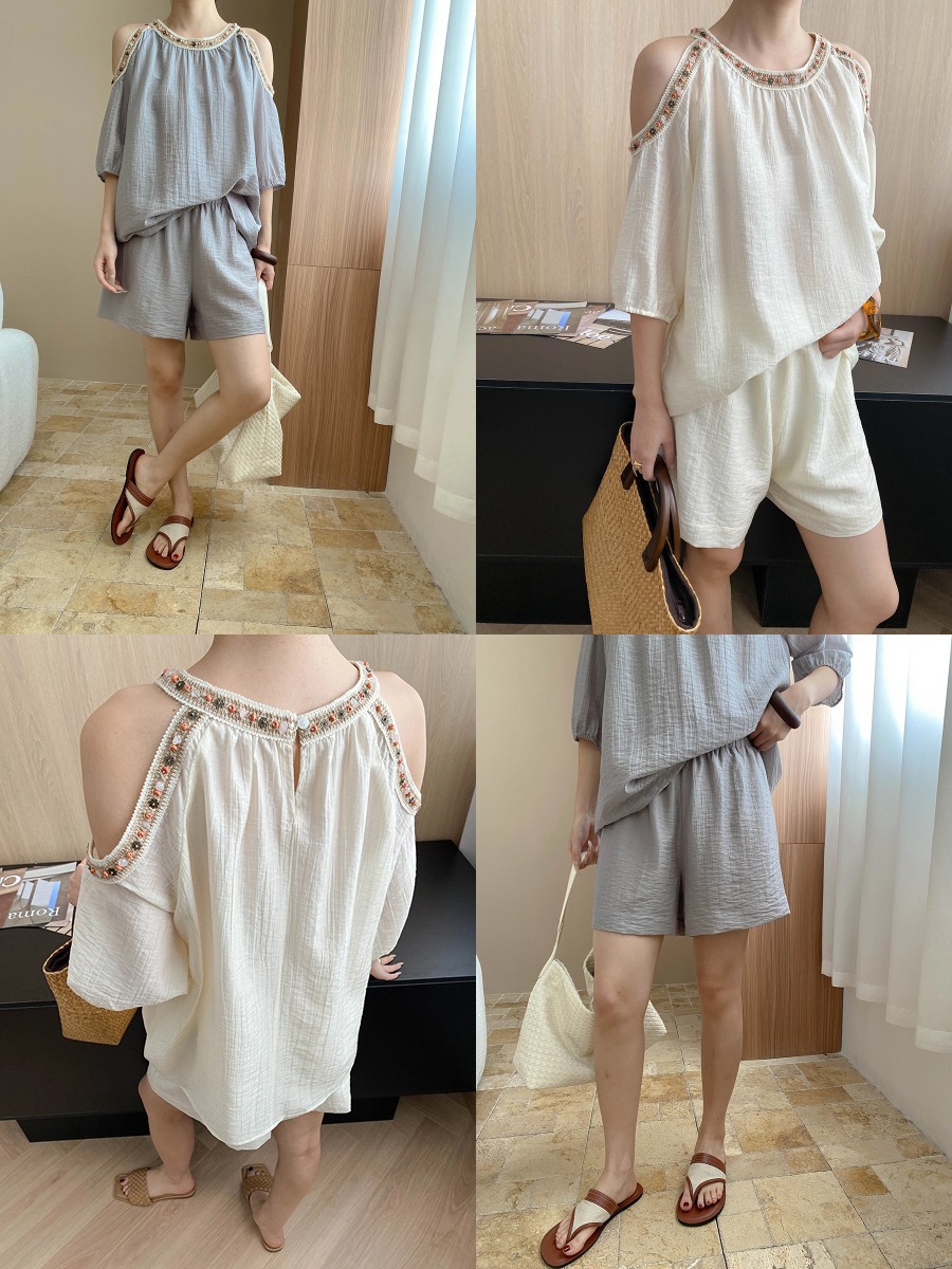 2点セット!【セットアップ】編み込みビーズ オフショルダーブラウス+ワイドレッグショートパンツ 上下セット【JZシリーズ】