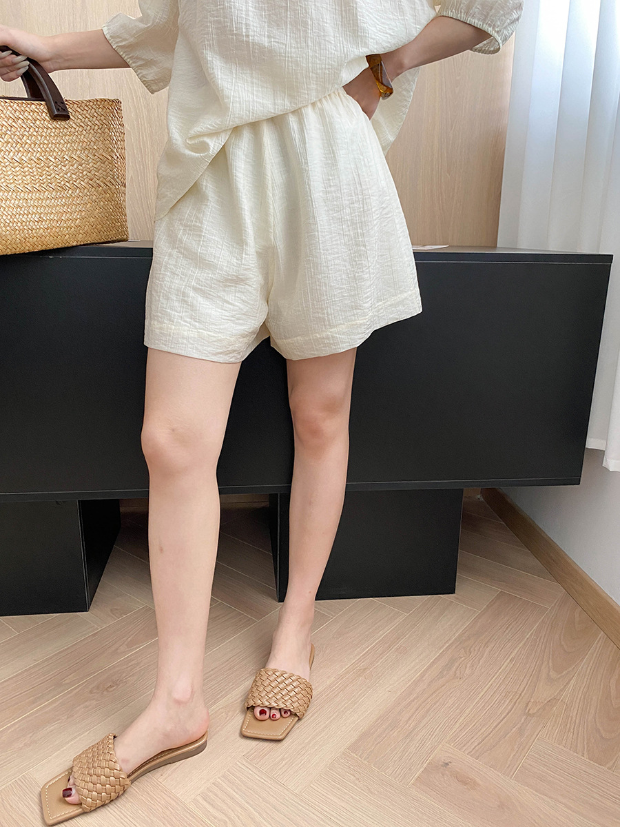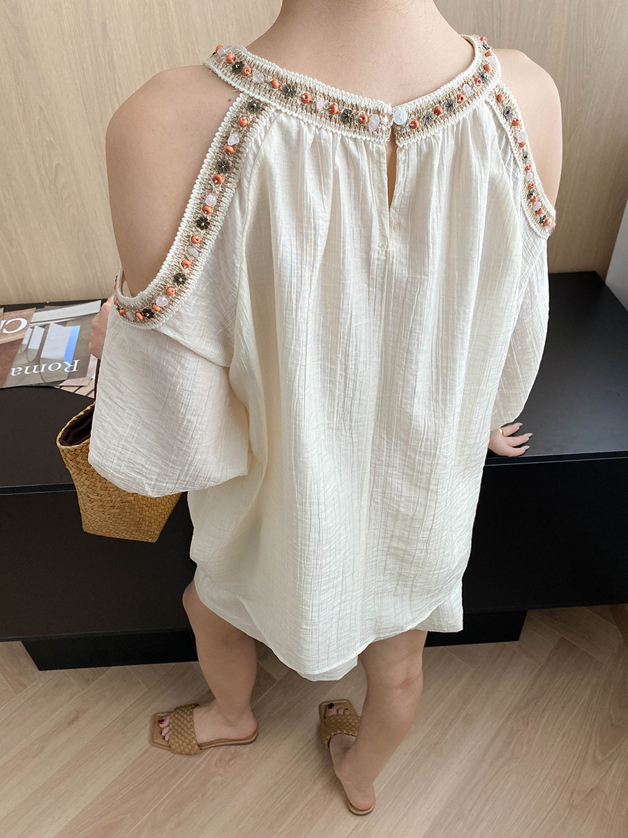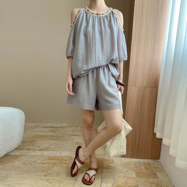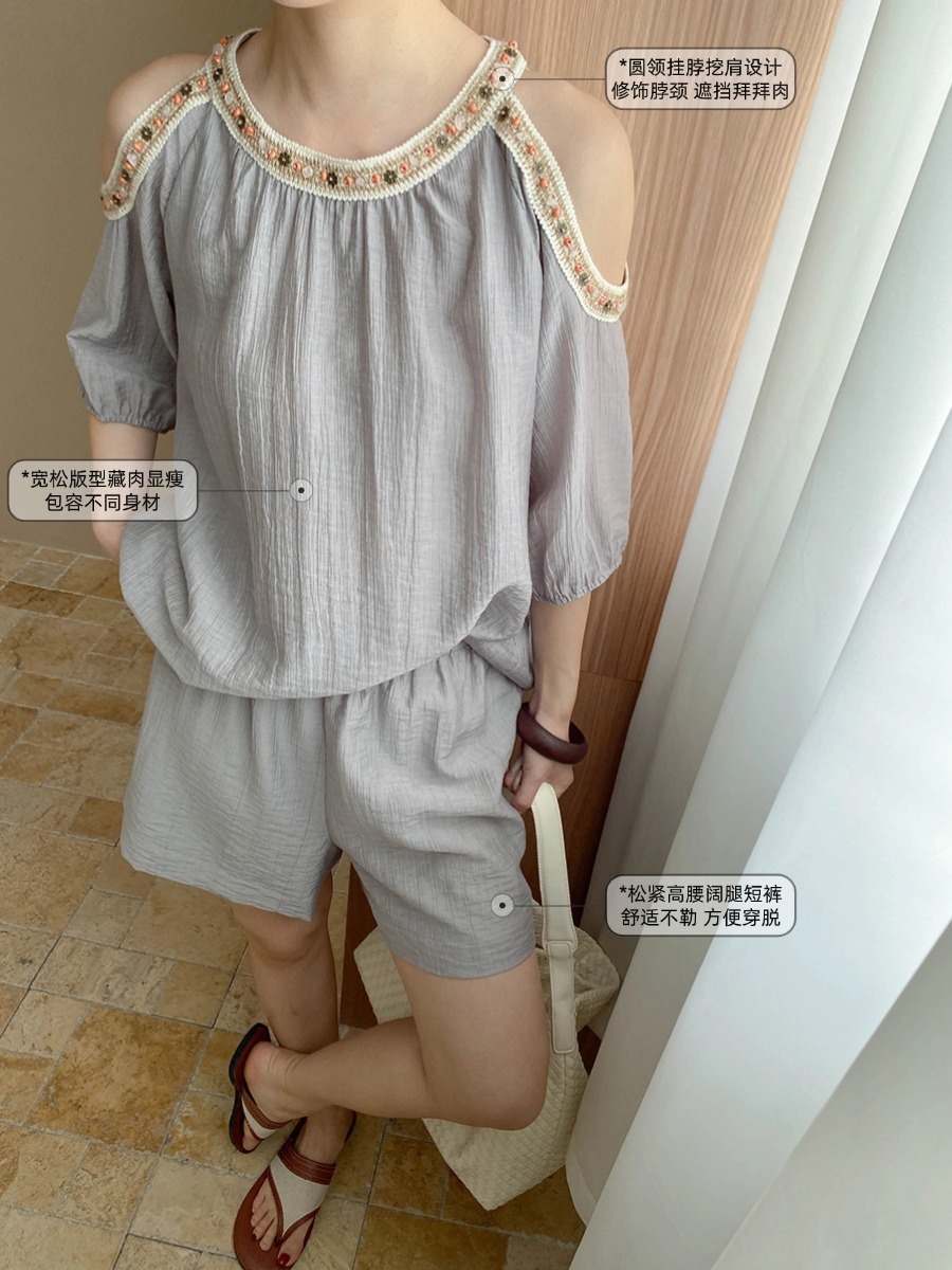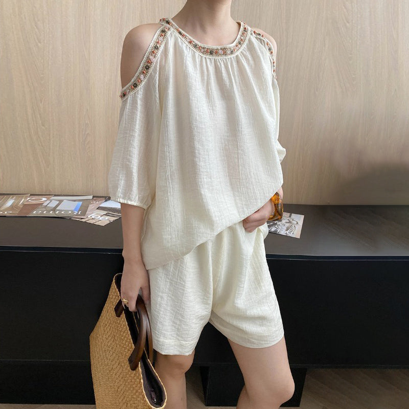 2点セット!【セットアップ】編み込みビーズ オフショルダーブラウス+ワイドレッグショートパンツ 上下セット【JZシリーズ】