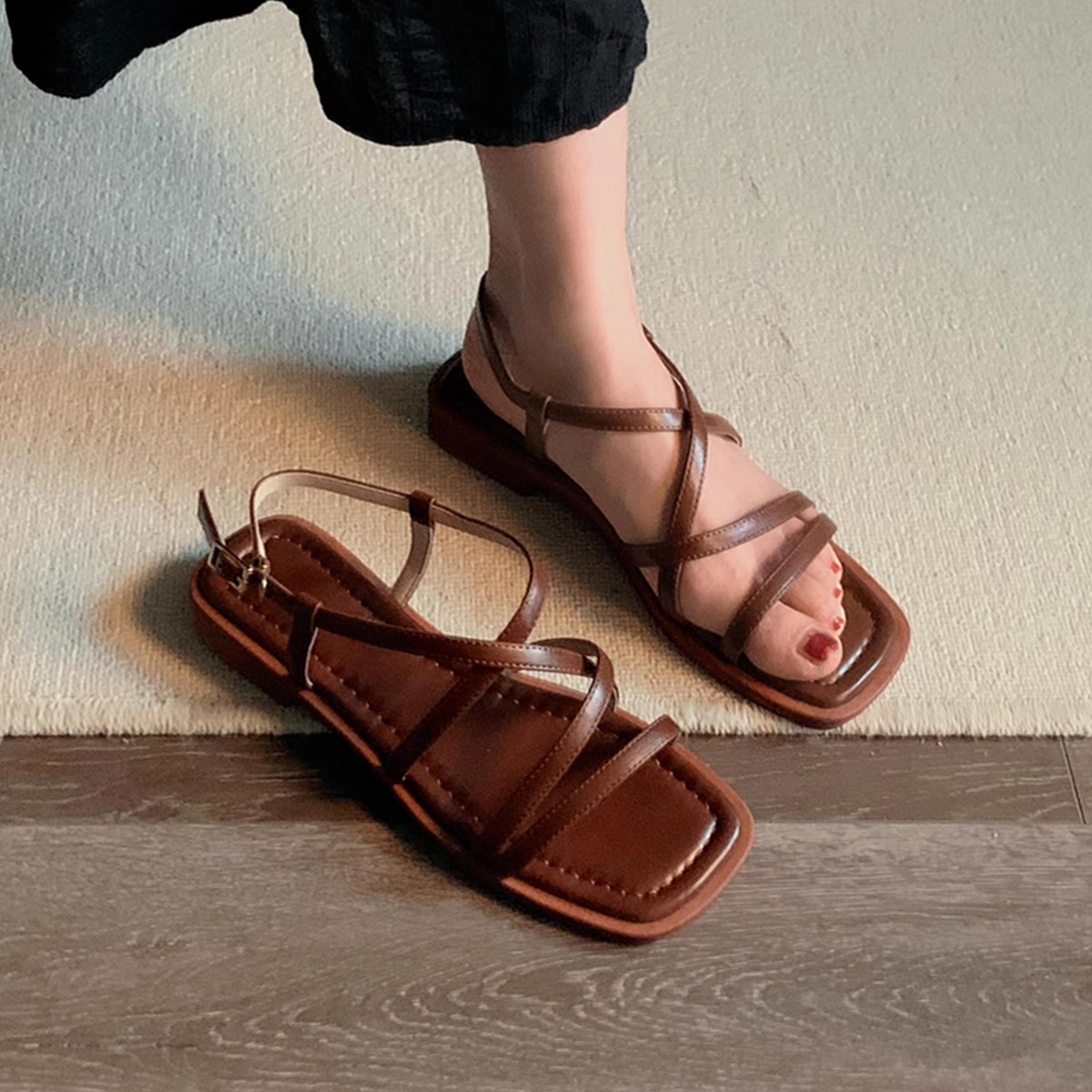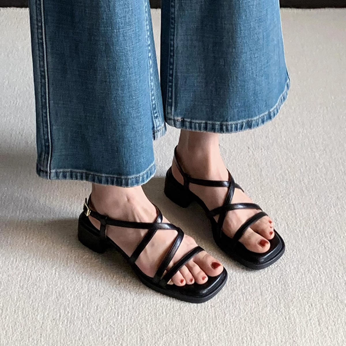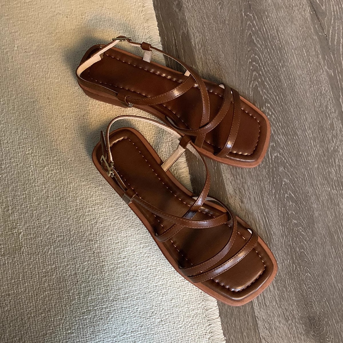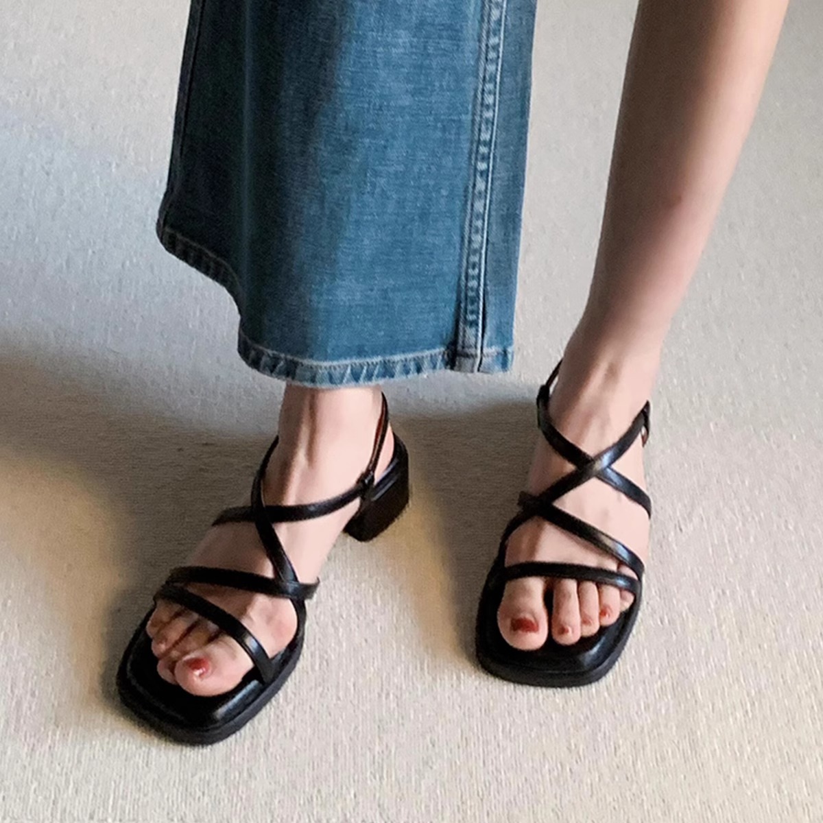 【シューズ】フレンチヴィンテージ クロスストラップ スクエアトゥサンダル 太ヒール ローマ風 新作