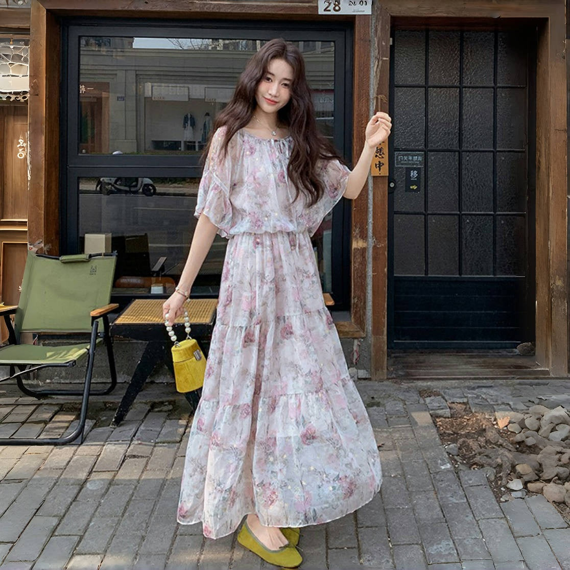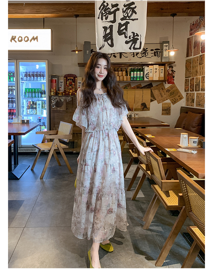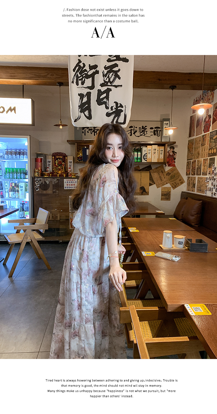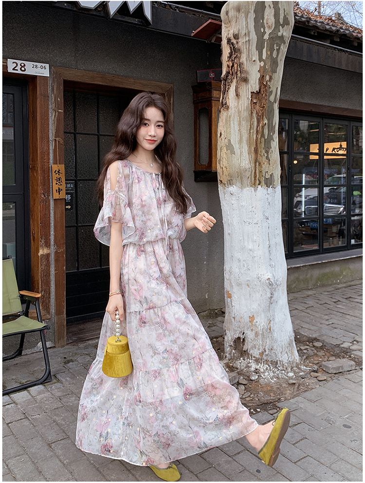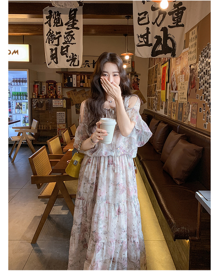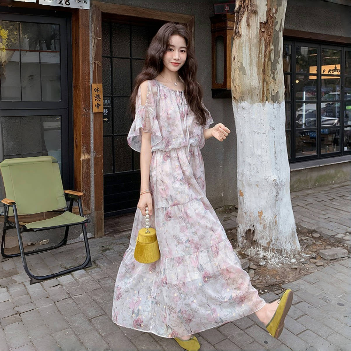 【ワンピース】フレンチ オフショルダー フリルスリーブ 花柄ワンピース 夏 高見え ロングドレス【SHシリーズ】