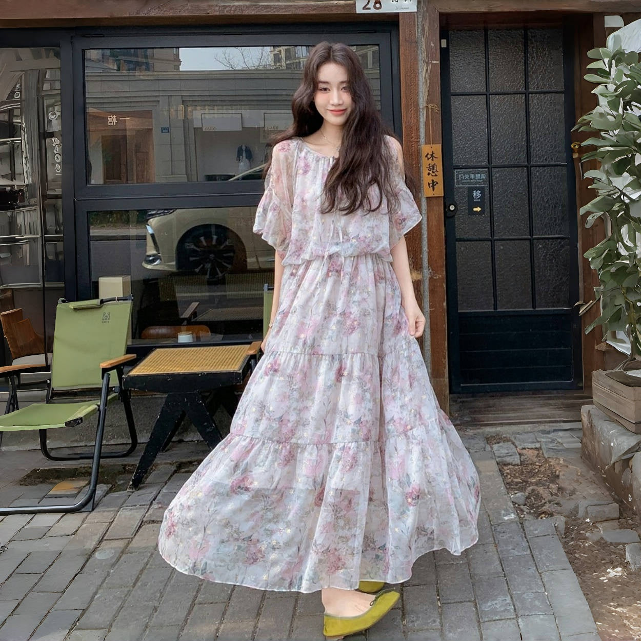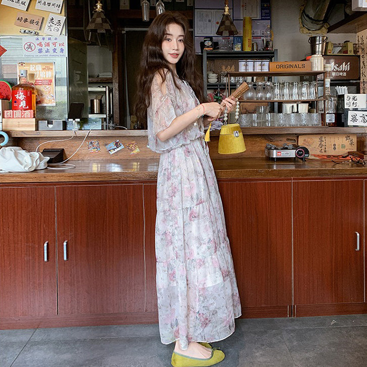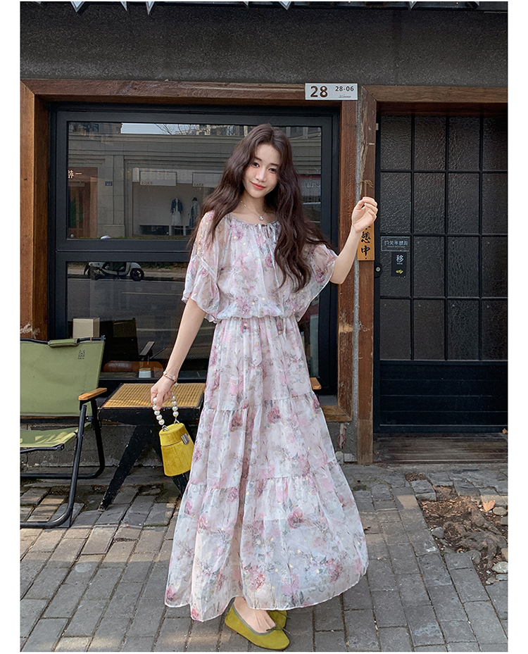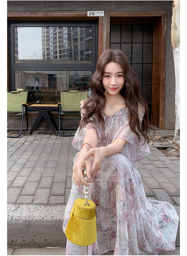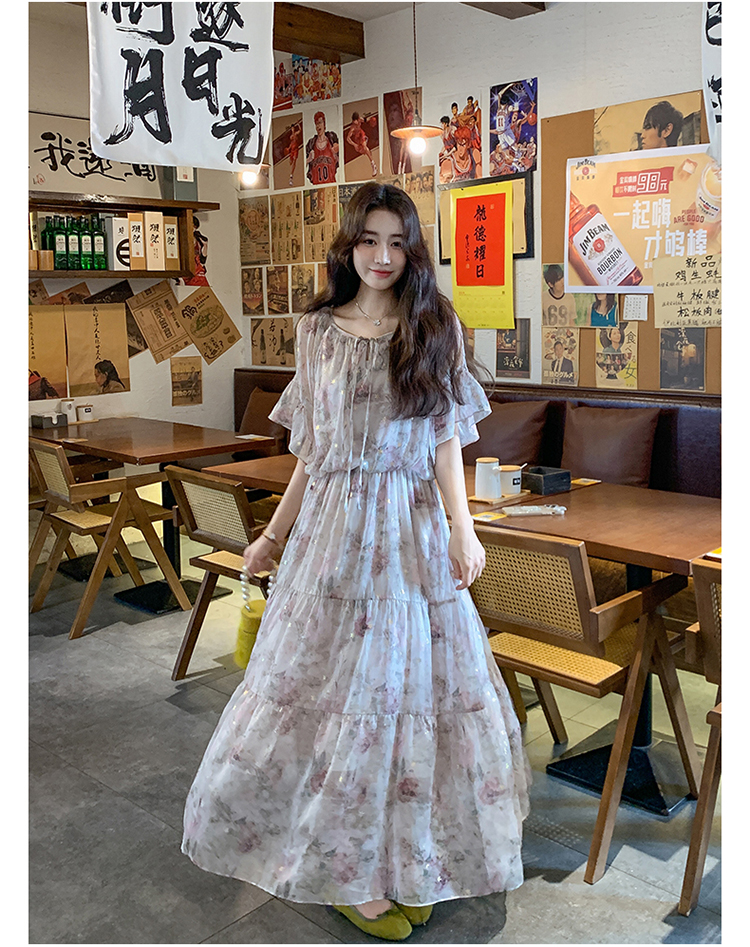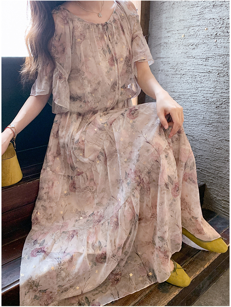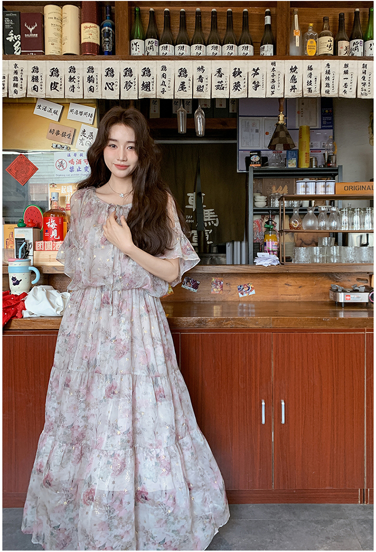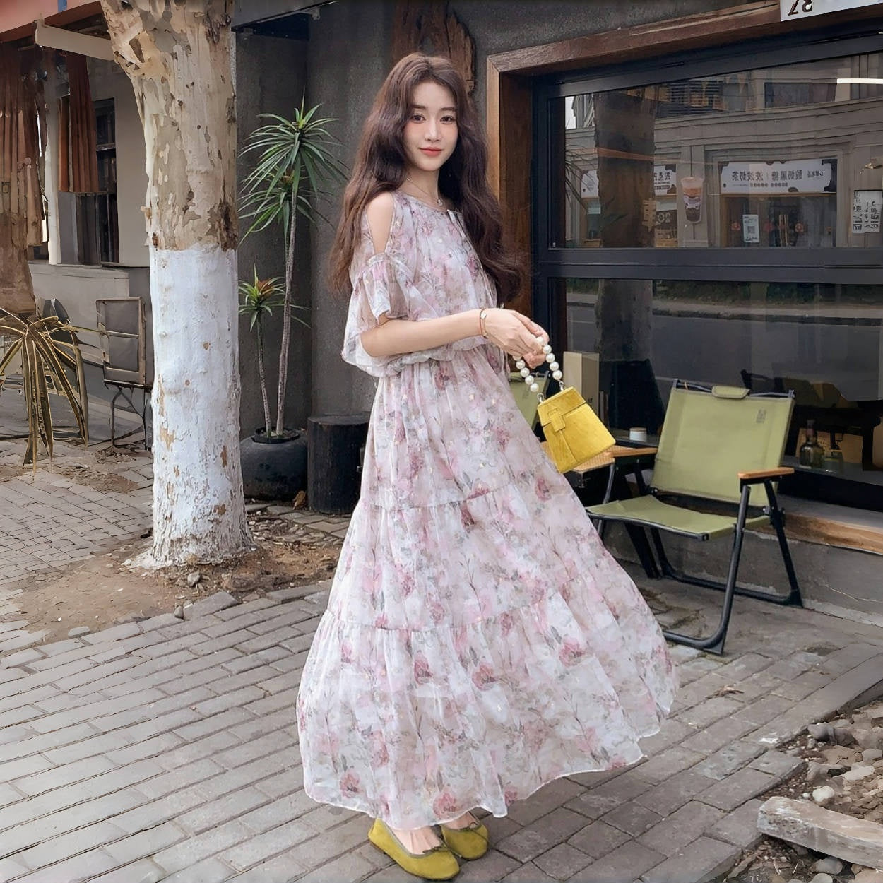 【ワンピース】フレンチ オフショルダー フリルスリーブ 花柄ワンピース 夏 高見え ロングドレス【SHシリーズ】