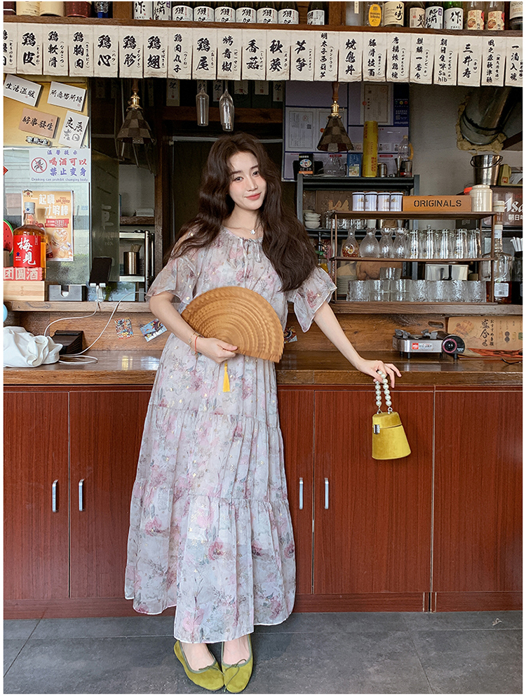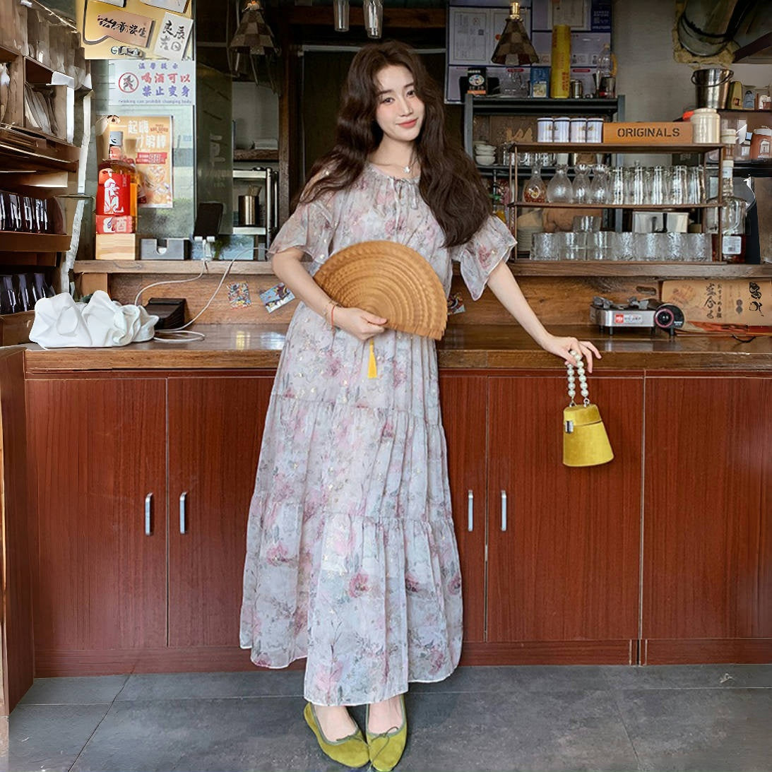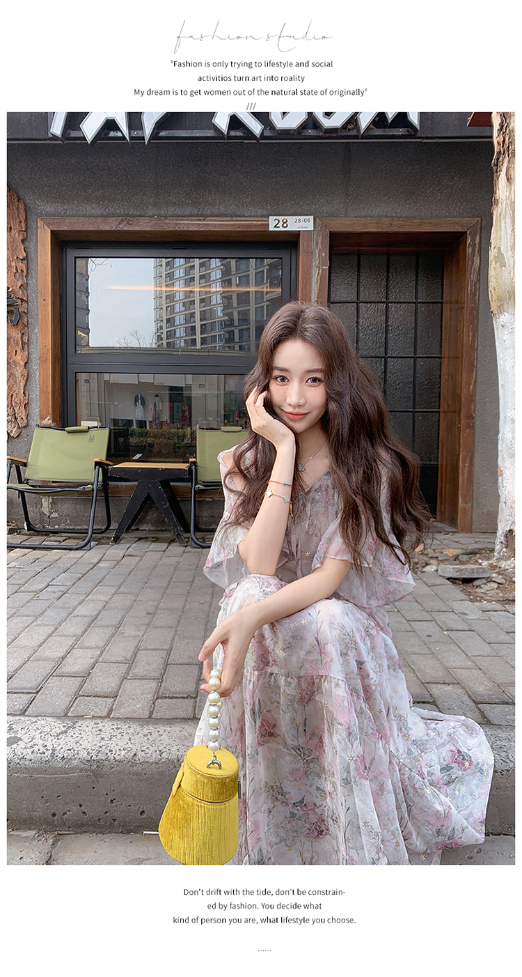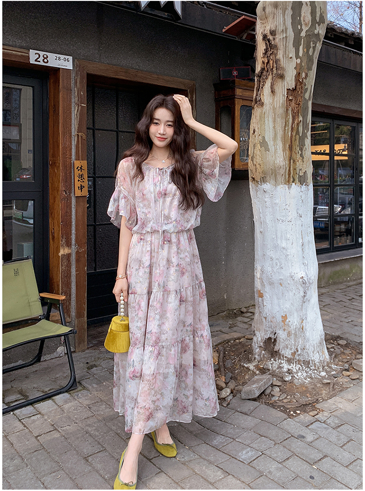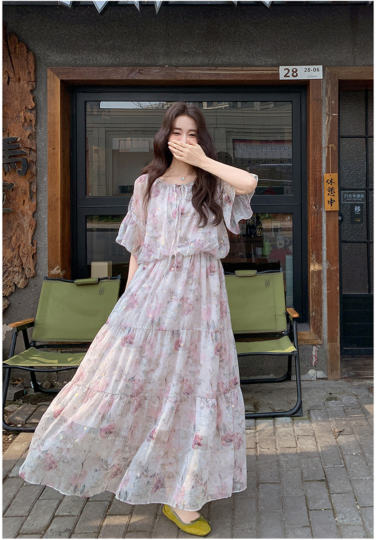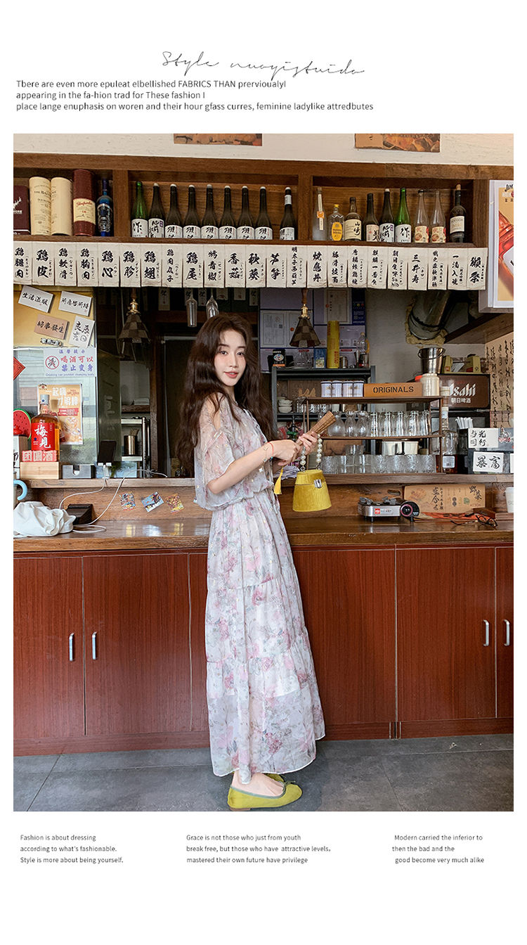 【ワンピース】フレンチ オフショルダー フリルスリーブ 花柄ワンピース 夏 高見え ロングドレス【SHシリーズ】