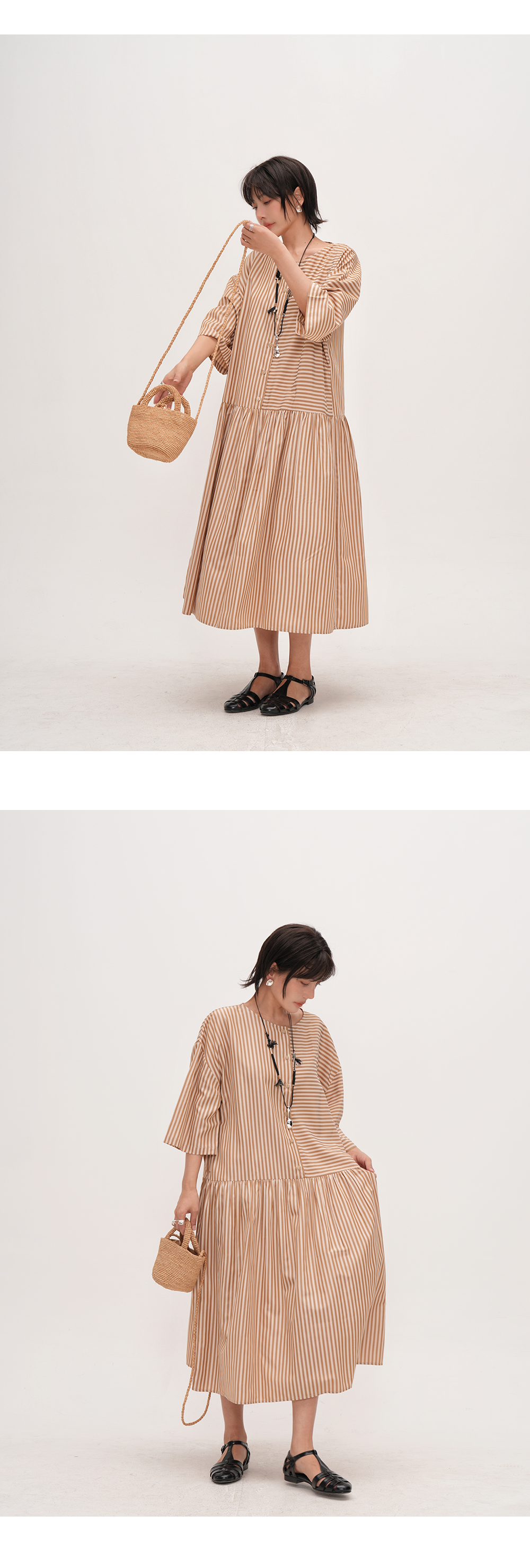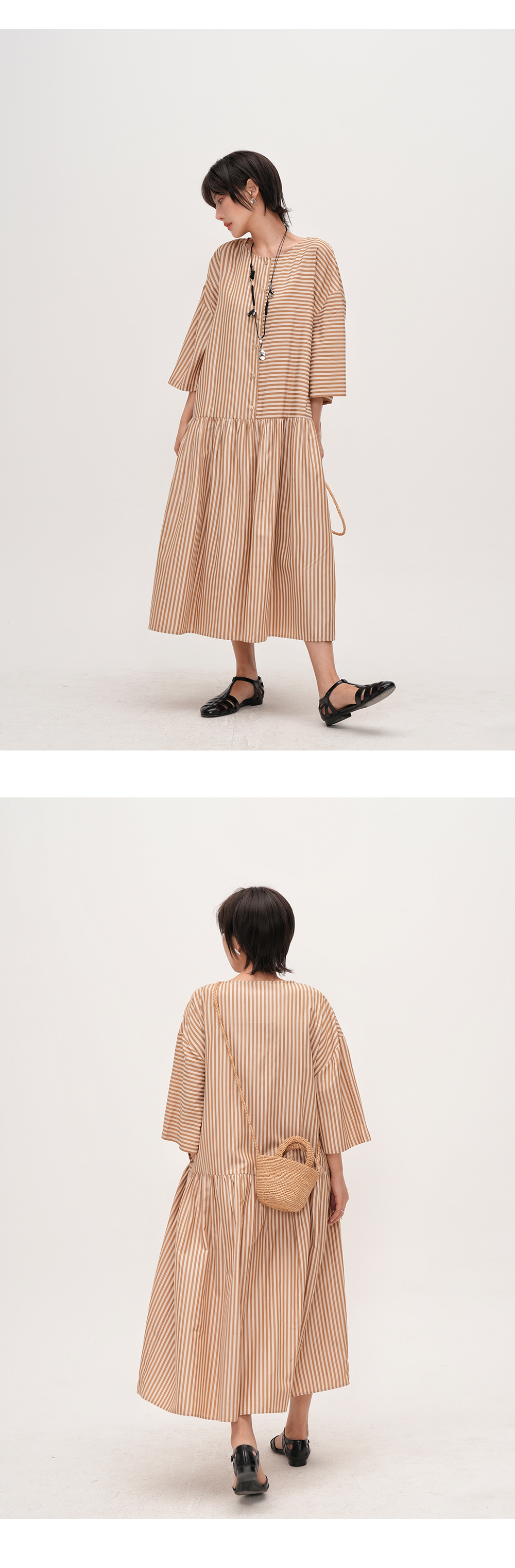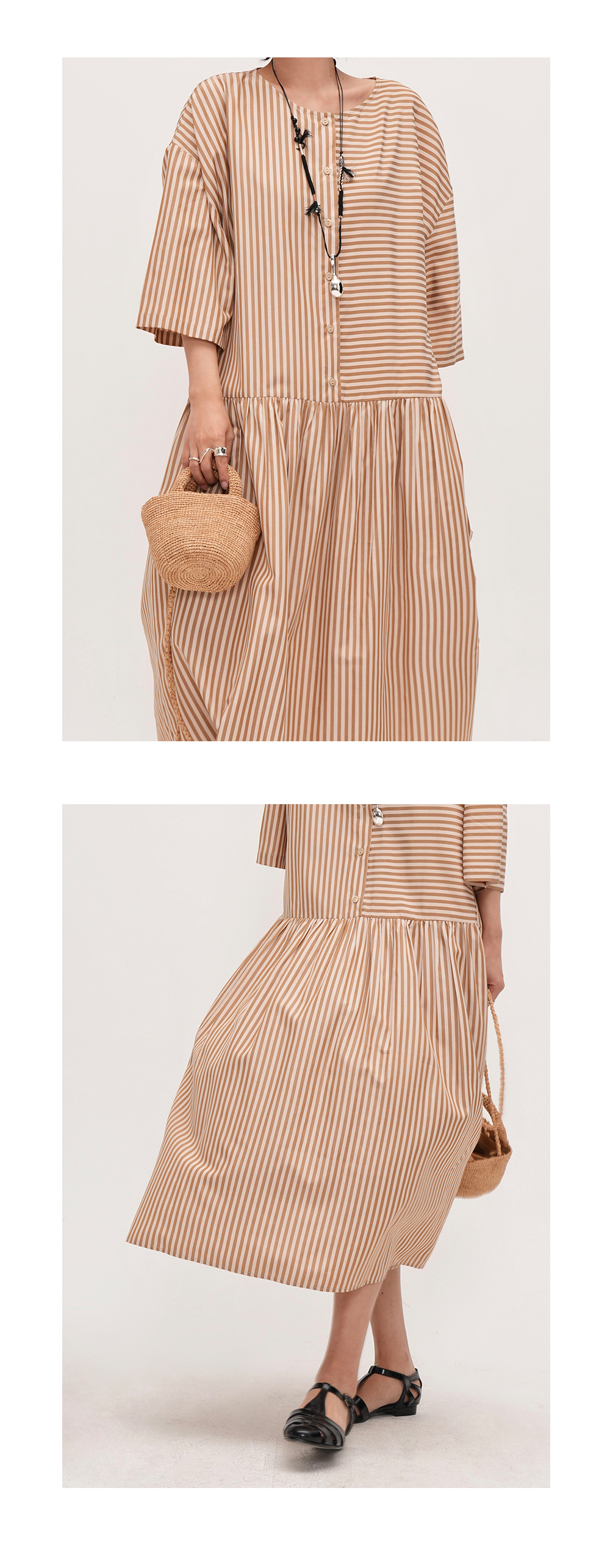 【ワンピース】夏新作 ストライプ切り替え ラウンドネックワンピース 七分袖 ゆったり着痩せロングドレス【JZシリーズ】【SHシリーズ】