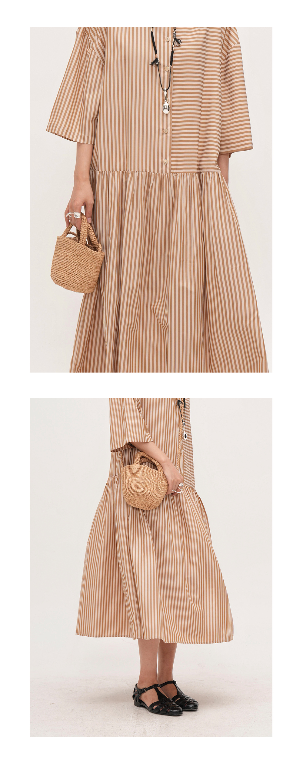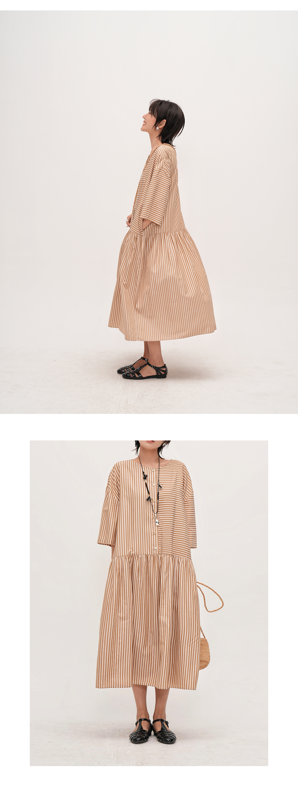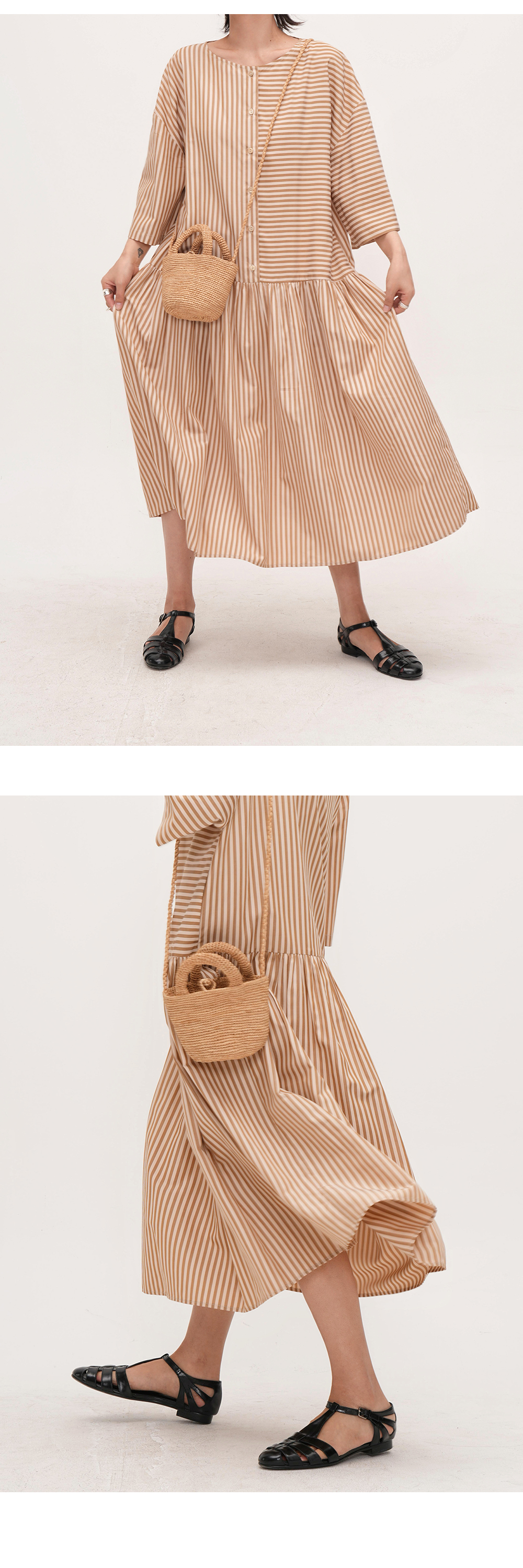【ワンピース】夏新作 ストライプ切り替え ラウンドネックワンピース 七分袖 ゆったり着痩せロングドレス【JZシリーズ】【SHシリーズ】