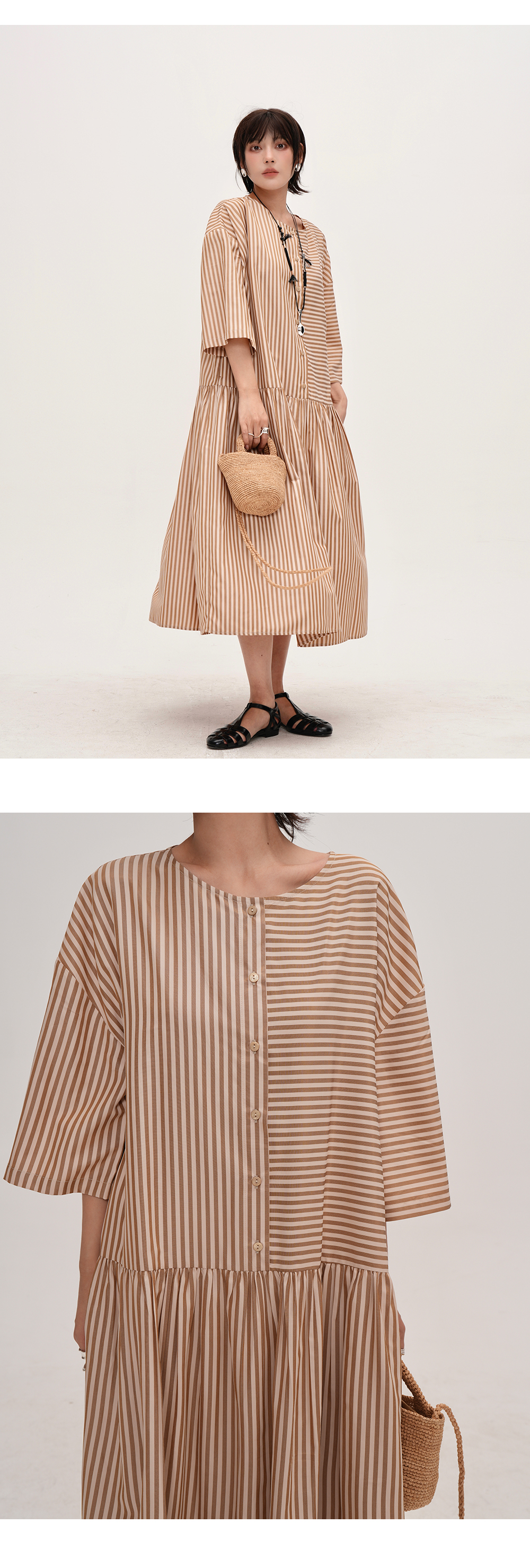 【商品名】【ワンピース】夏新作 ストライプ切り替え ラウンドネックワンピース 七分袖 ゆったり着痩せロングドレス【JZシリーズ】