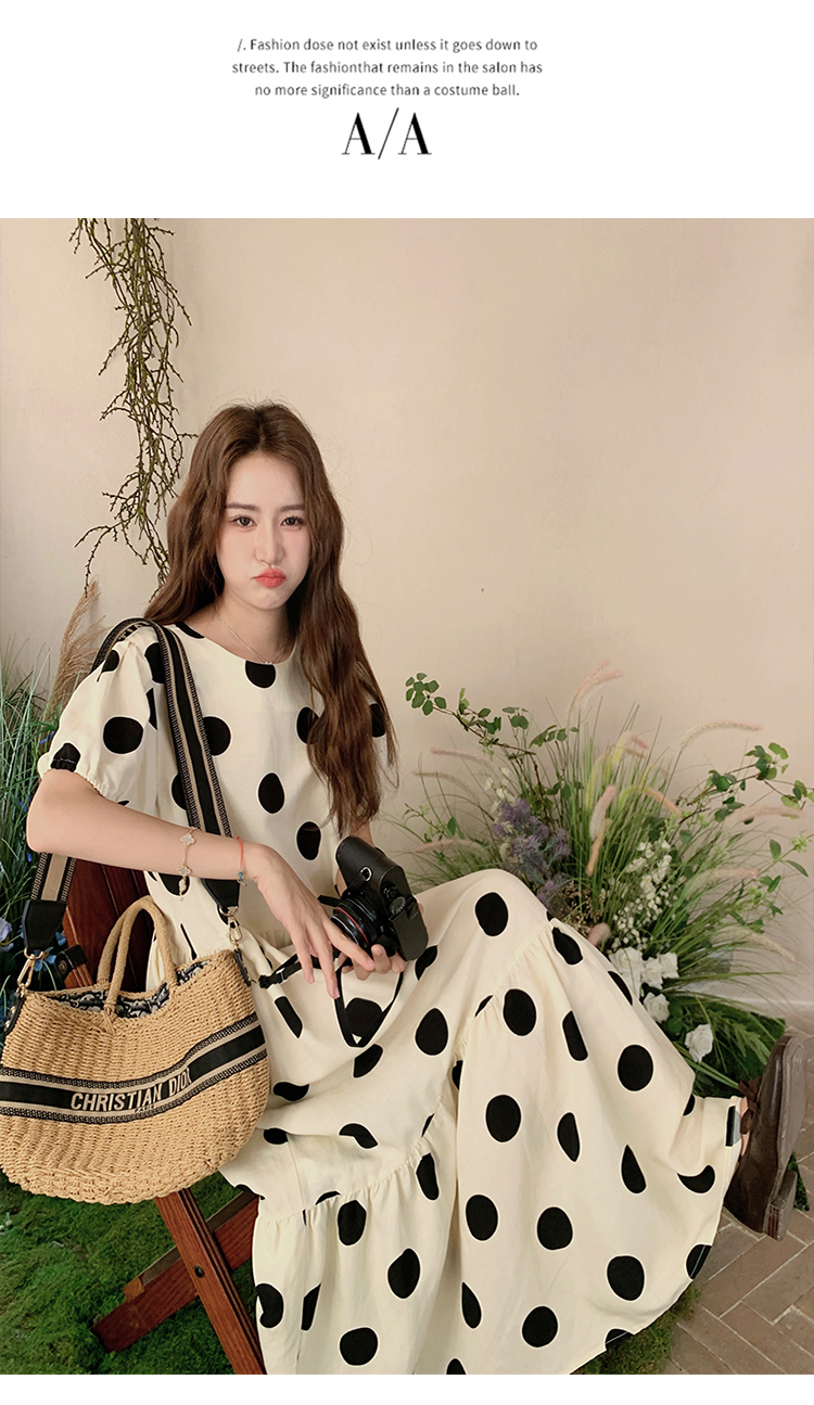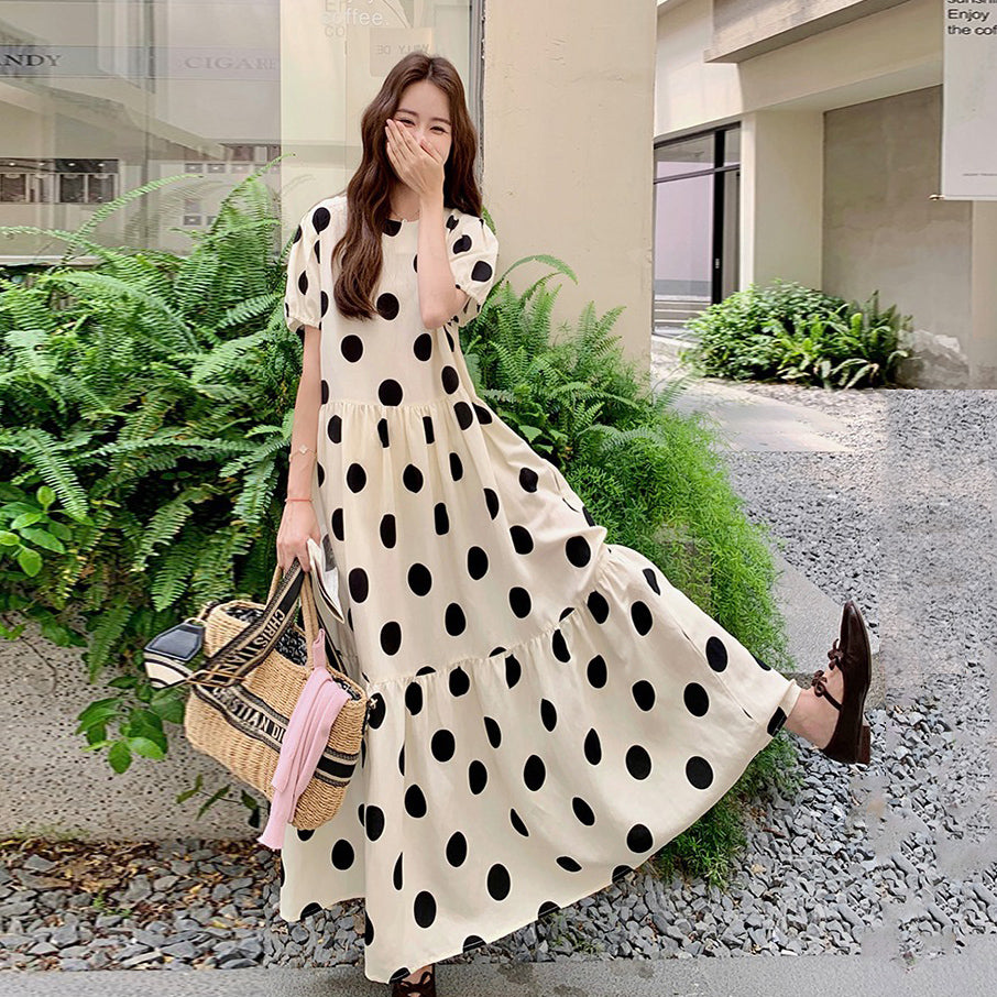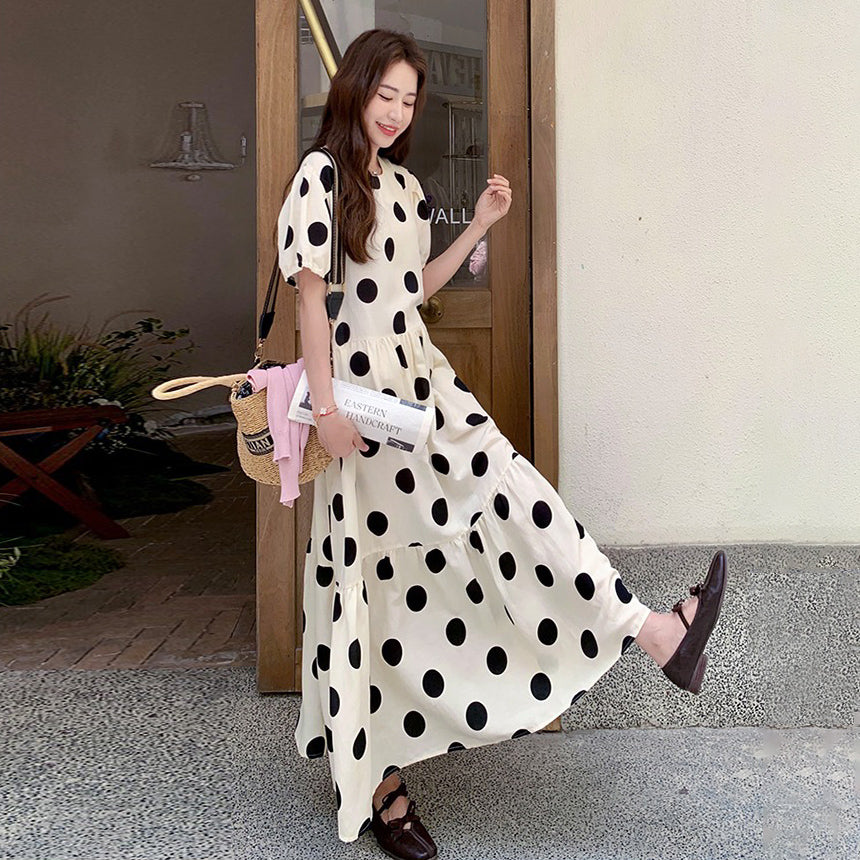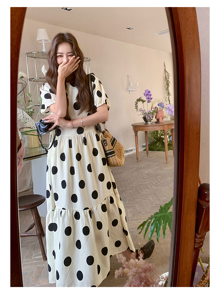 【ワンピース】大きめドット パフスリーブ ワンピース 夏 トレンド感 上品 半袖 マーメイド ロングドレス【SHシリーズ】