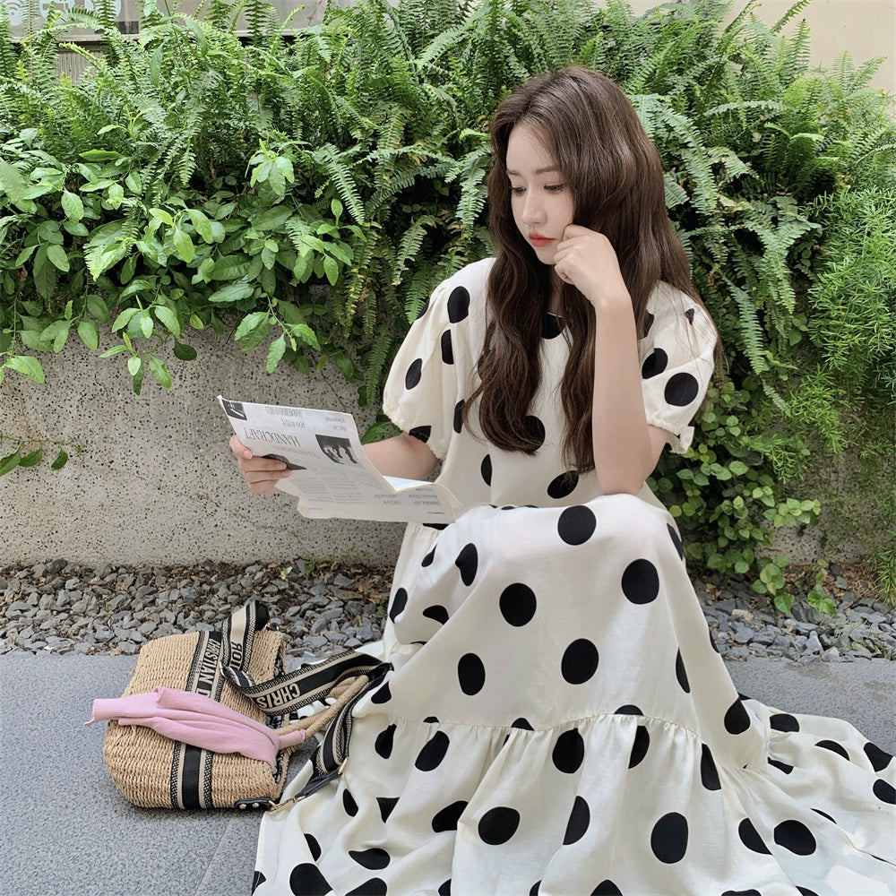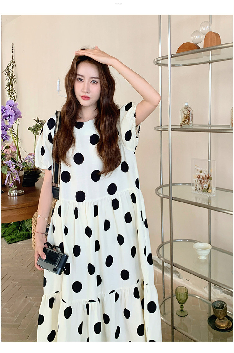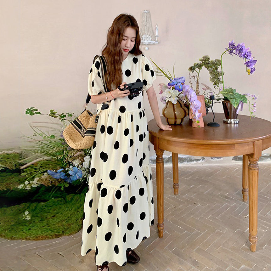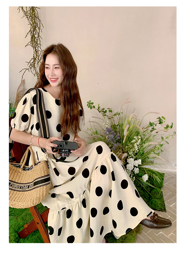 【ワンピース】大きめドット パフスリーブ ワンピース 夏 トレンド感 上品 半袖 マーメイド ロングドレス【SHシリーズ】