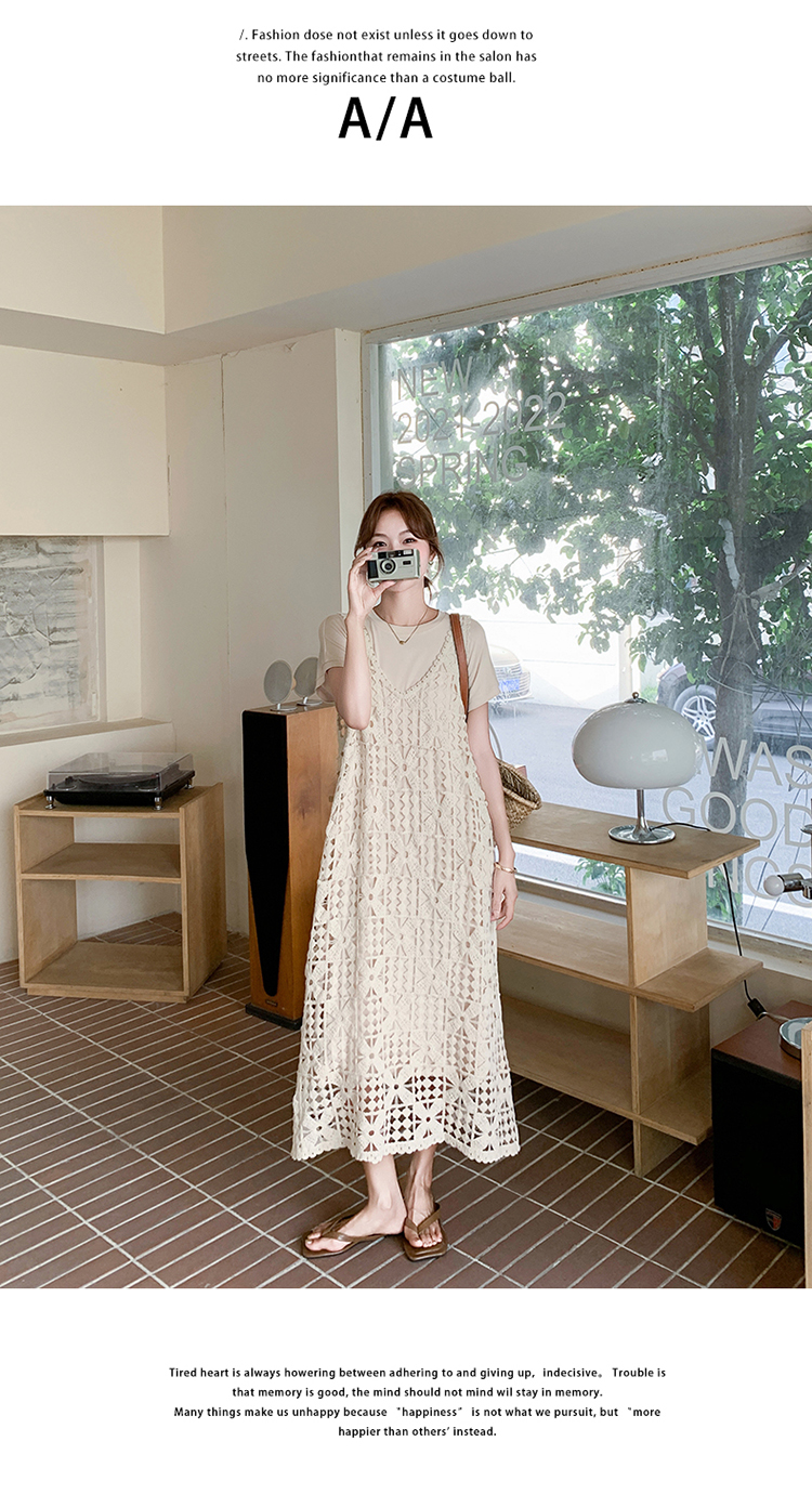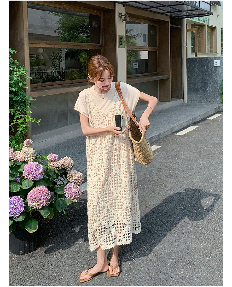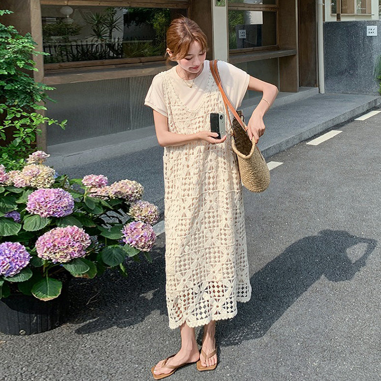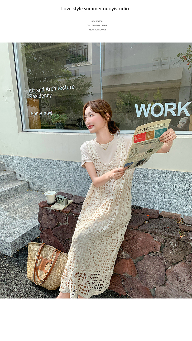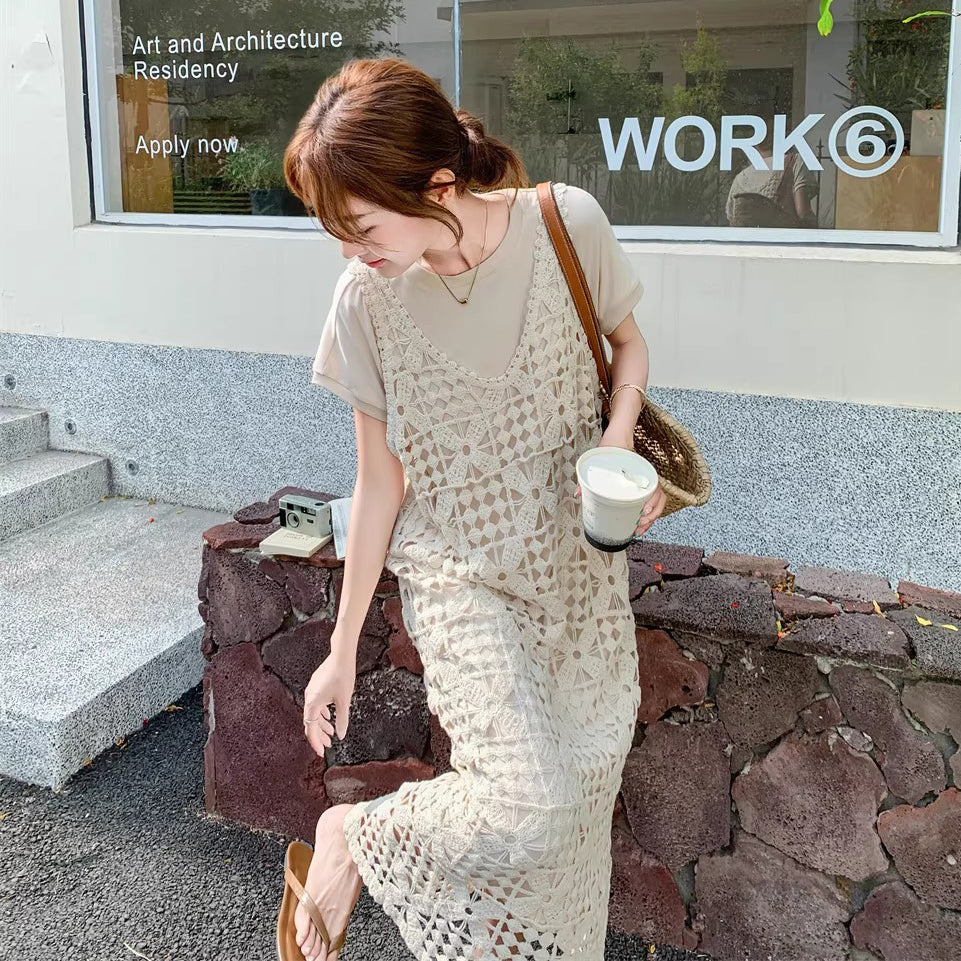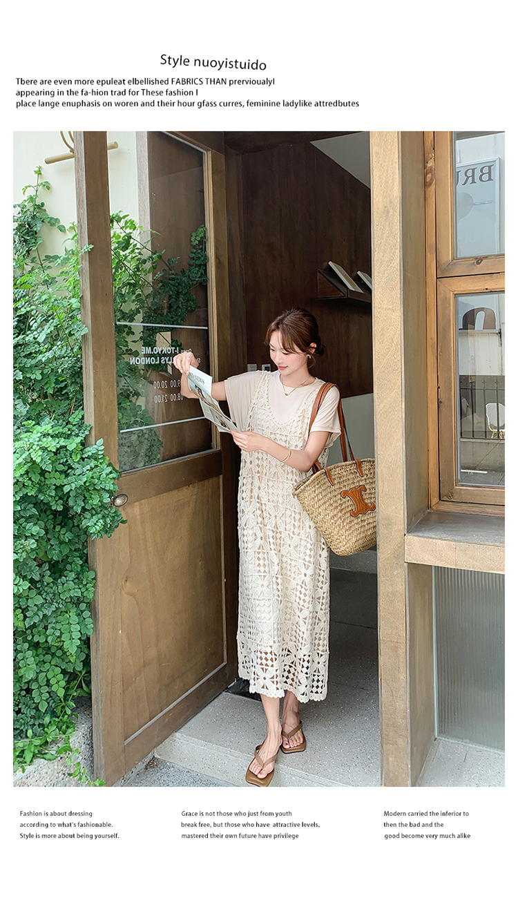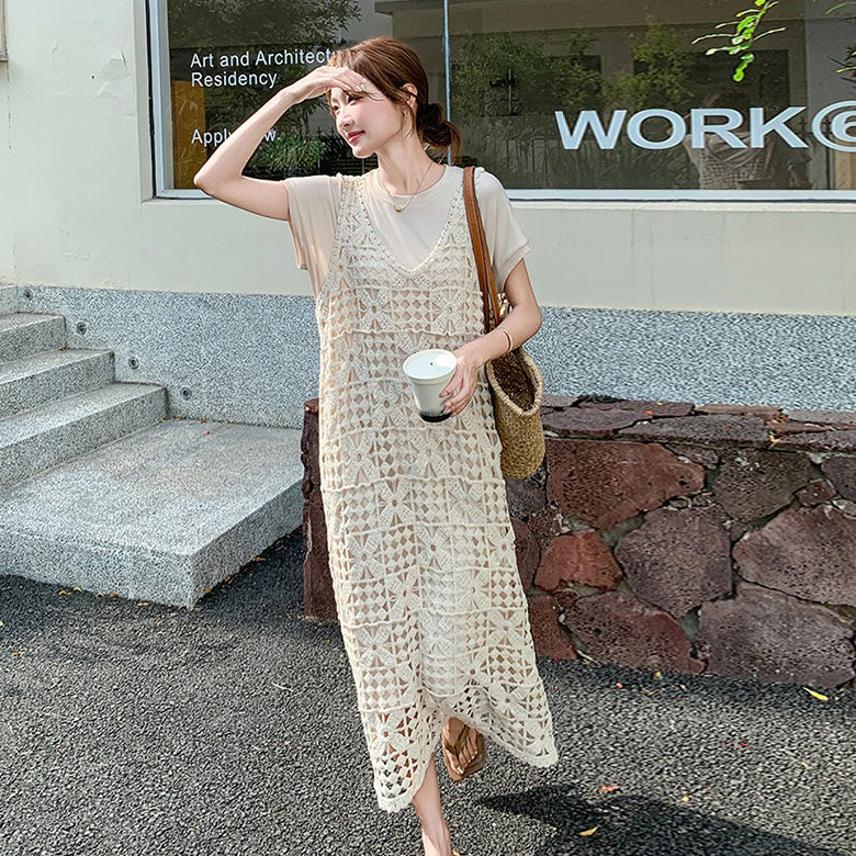 2点セット!【セットアップ】透かし編みカーデ+ 半袖ワンピースセットアップ|激かわ映えロングワンピース【JZシリーズ】