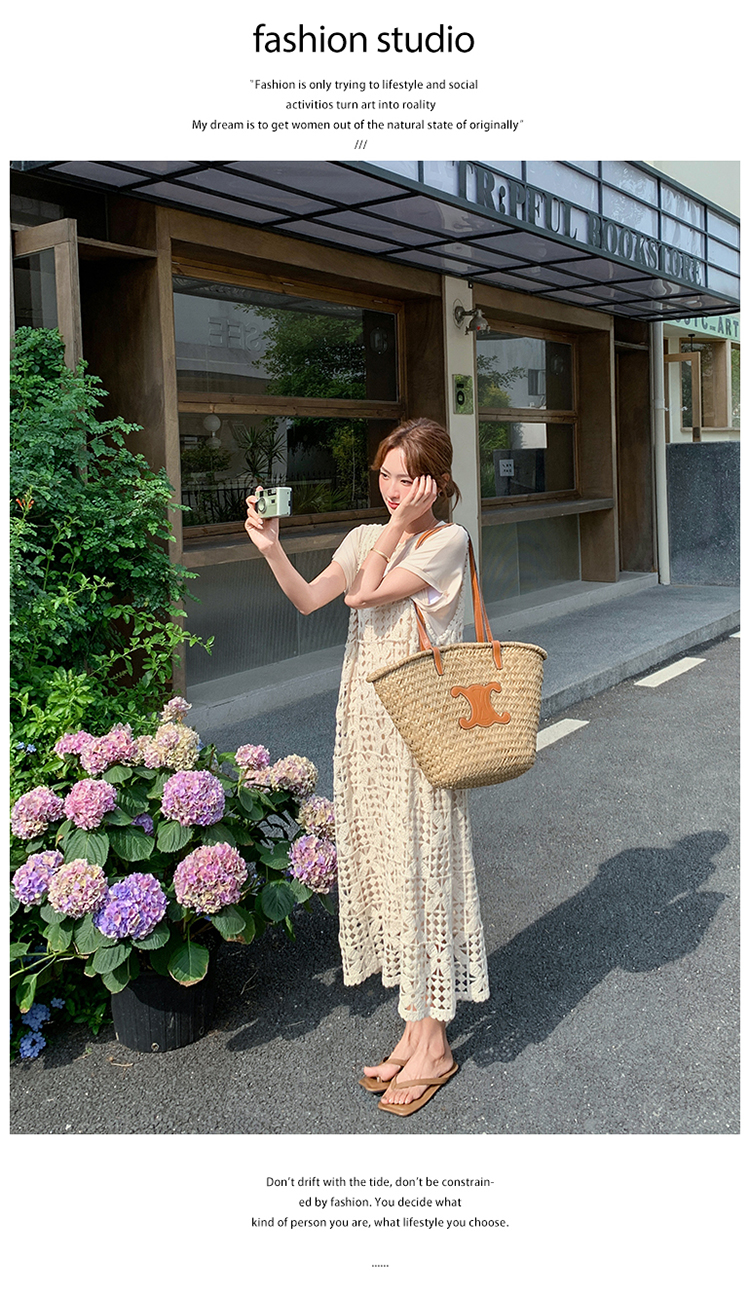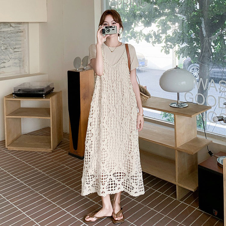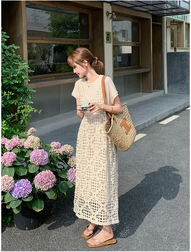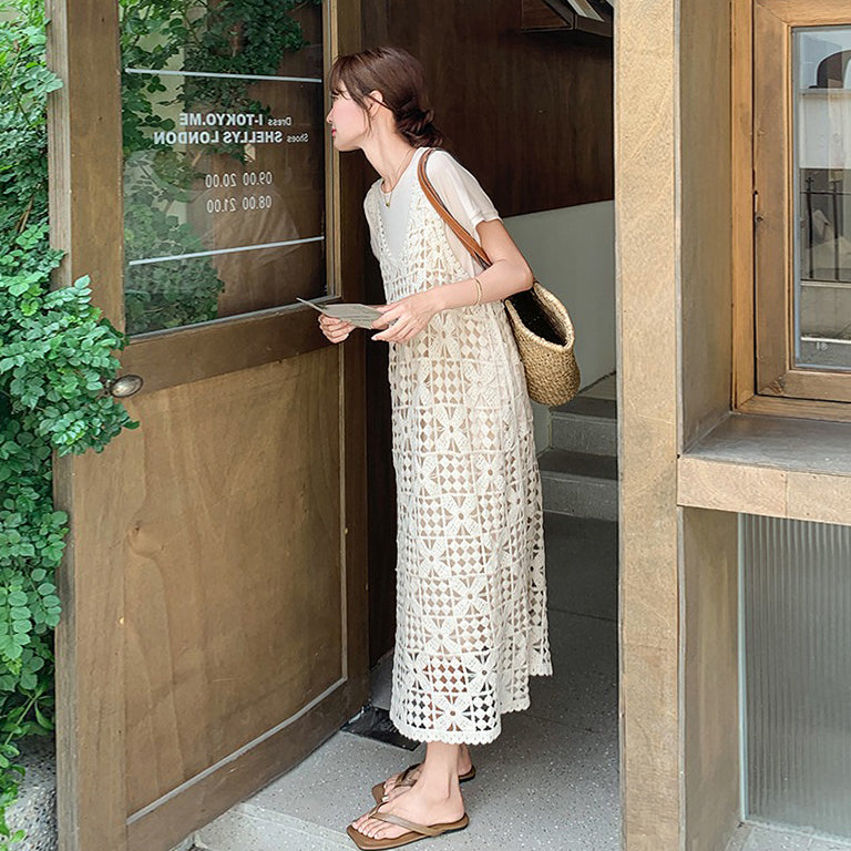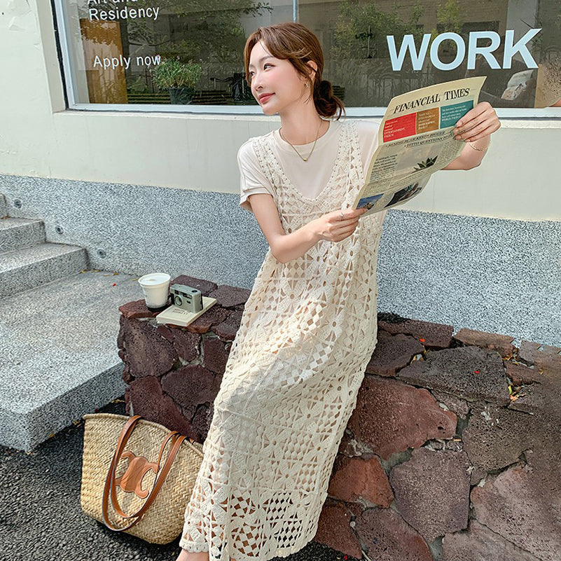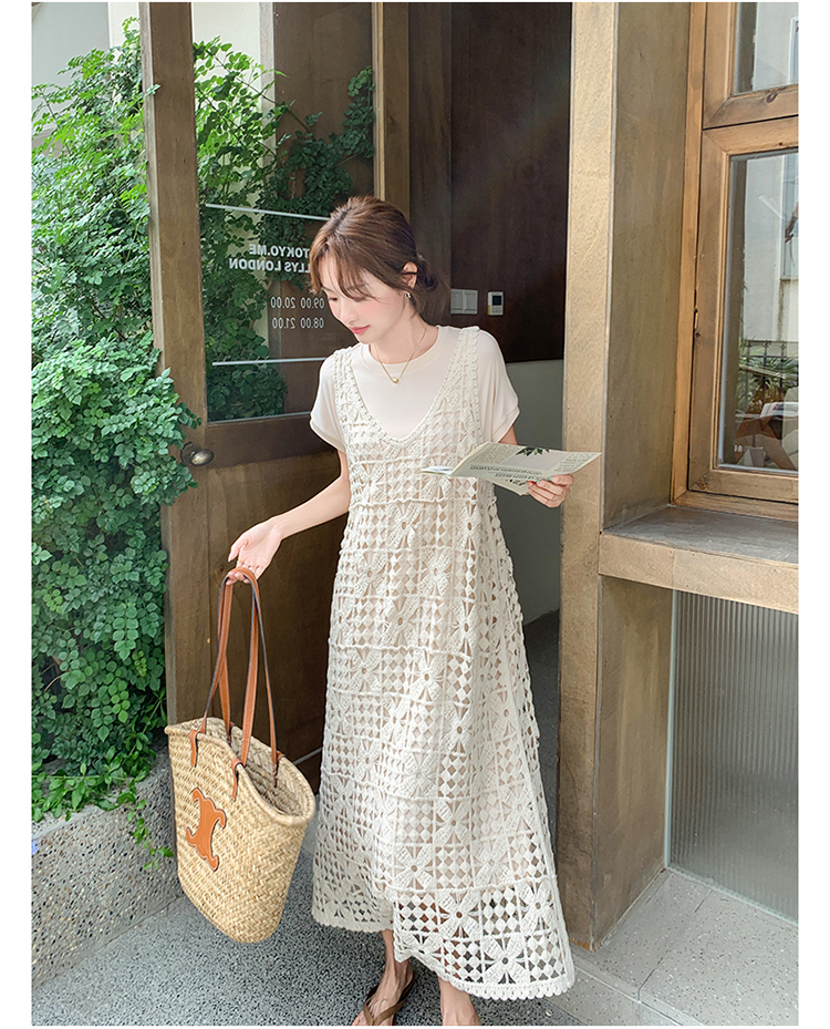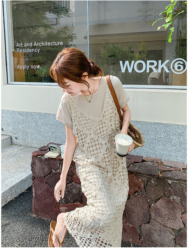 2点セット!【セットアップ】透かし編みカーデ+ 半袖ワンピースセットアップ|激かわ映えロングワンピース【JZシリーズ】