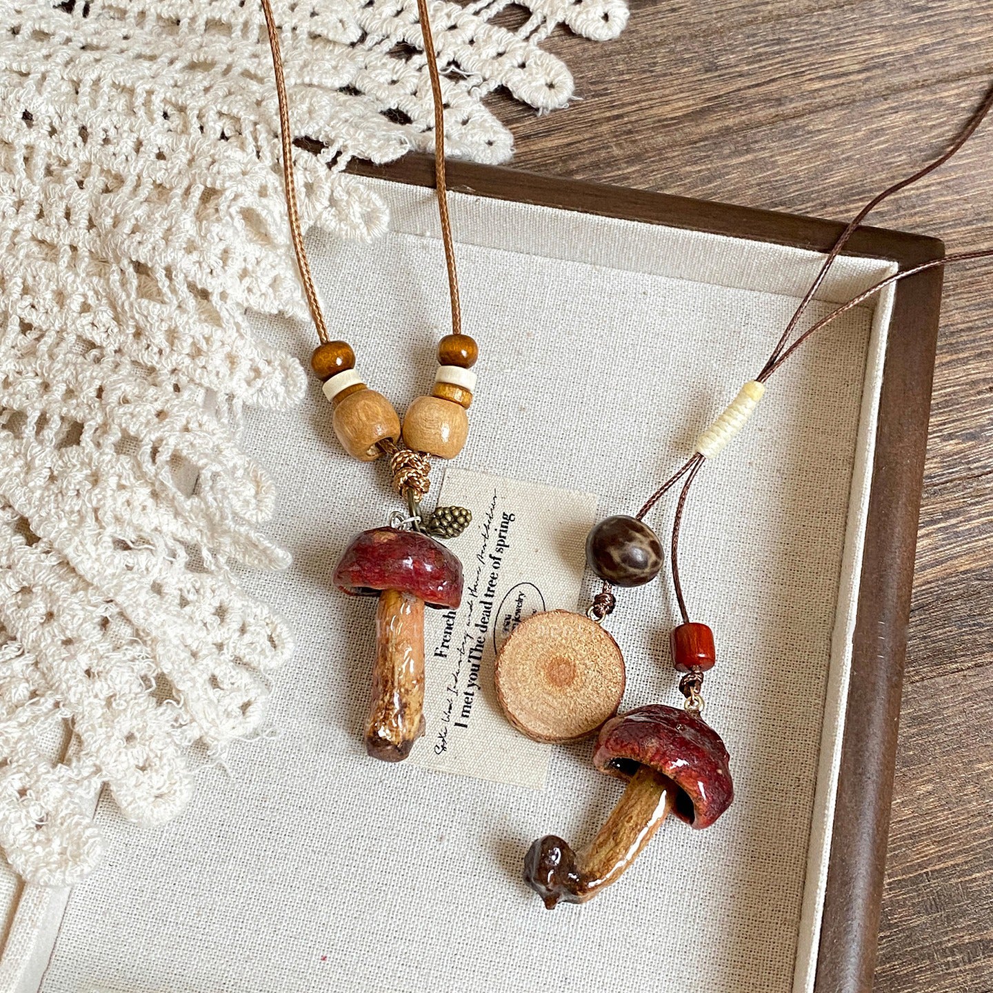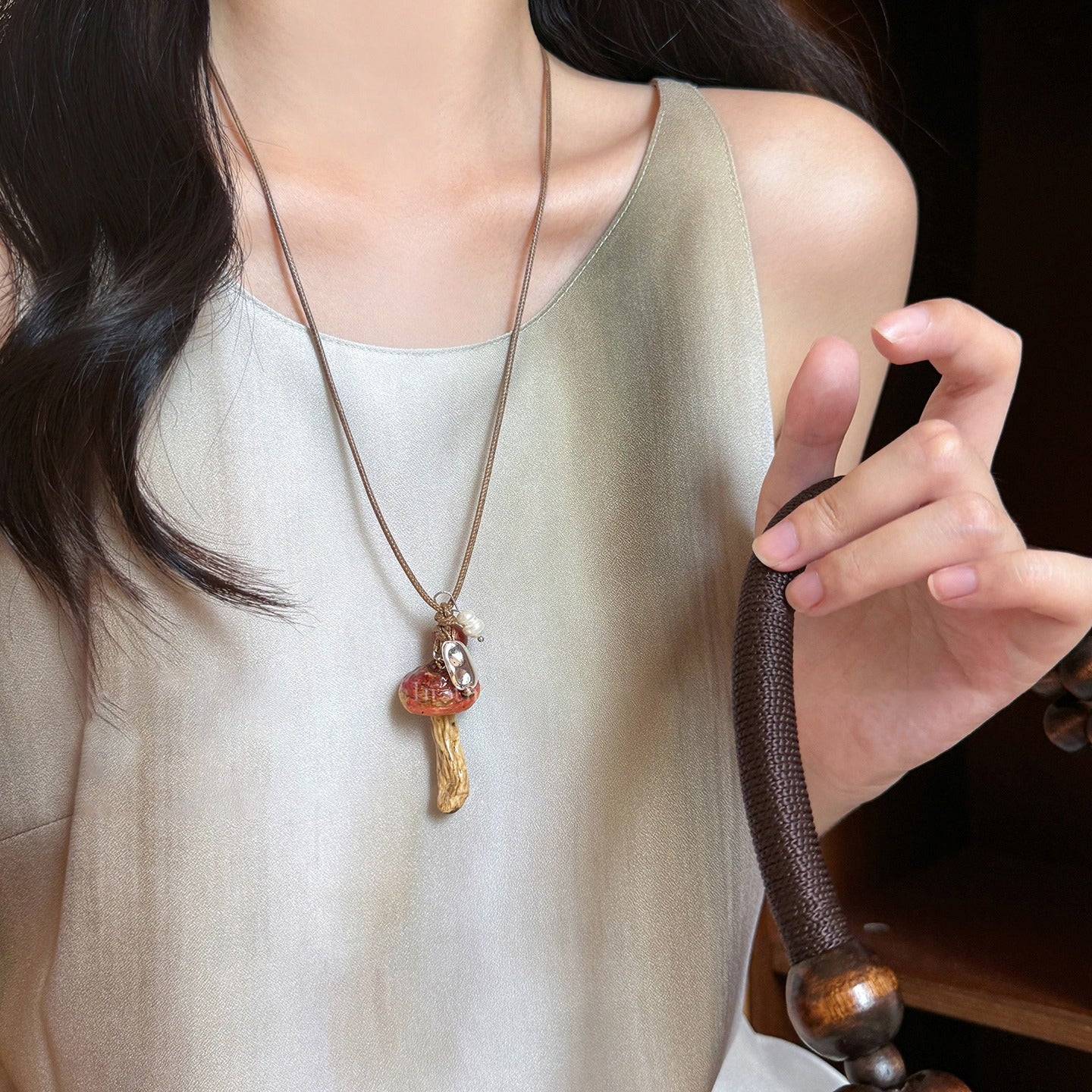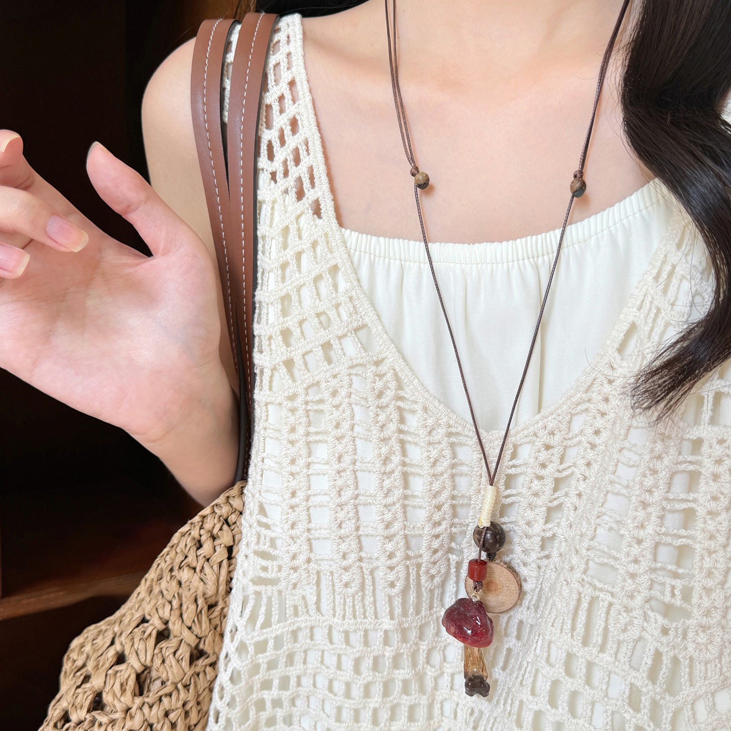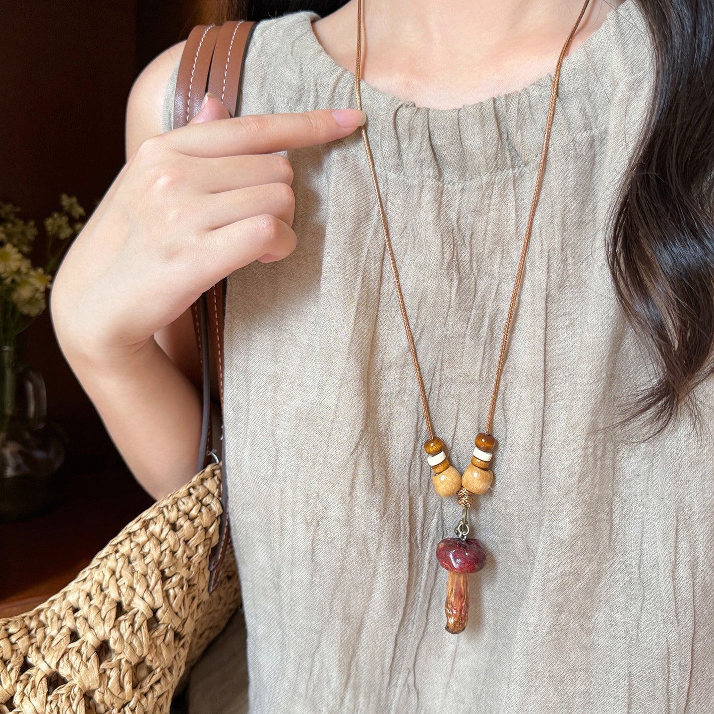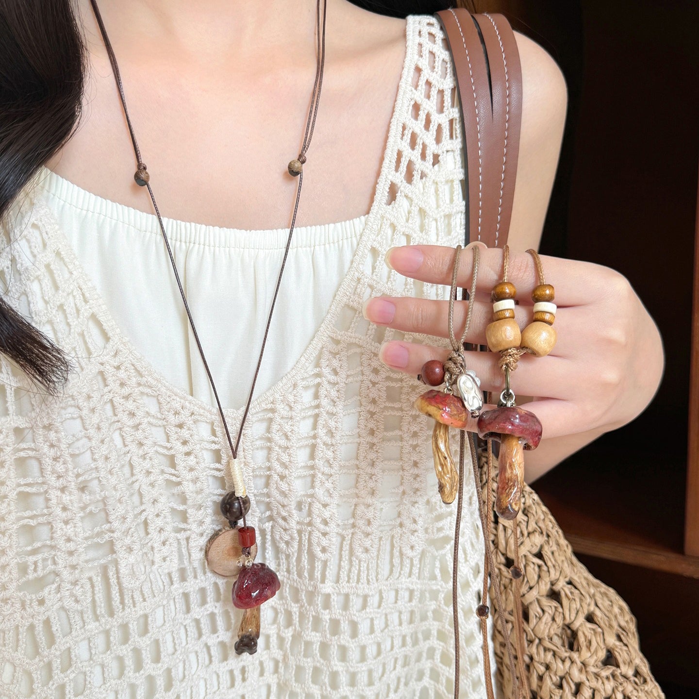 【🎁 B2G1|先行スタート!】【グッズ】 天然キノコモチーフビーズネックレス レディース 森系 ロング丈 ニットチェーン 個性派 民族風アクセサリー