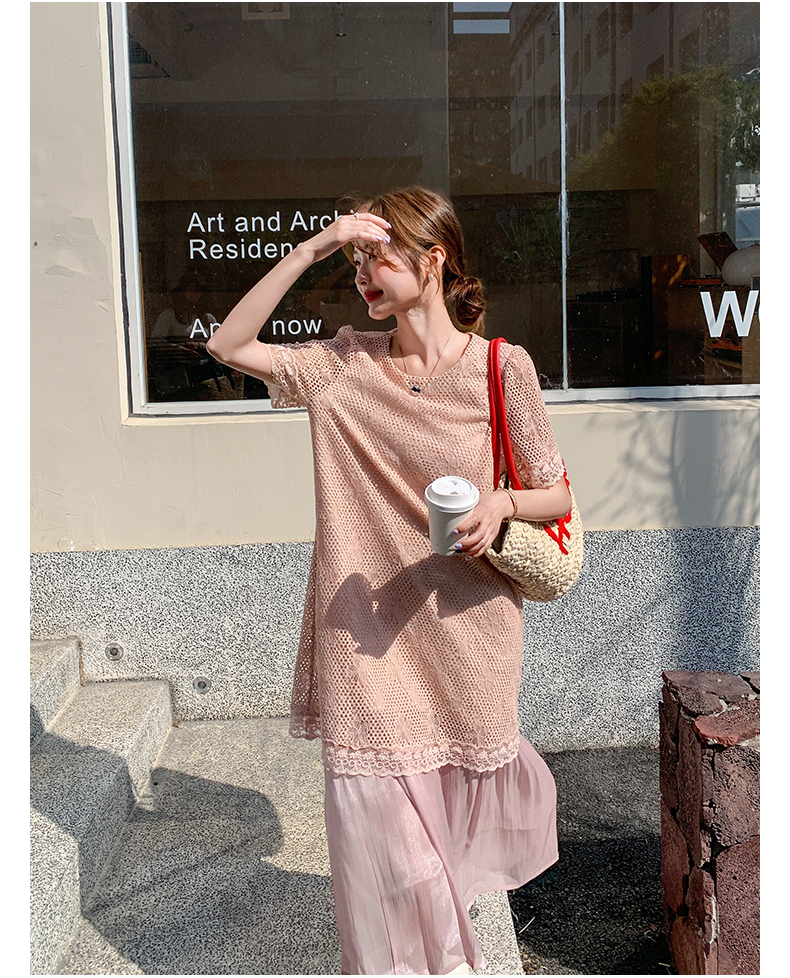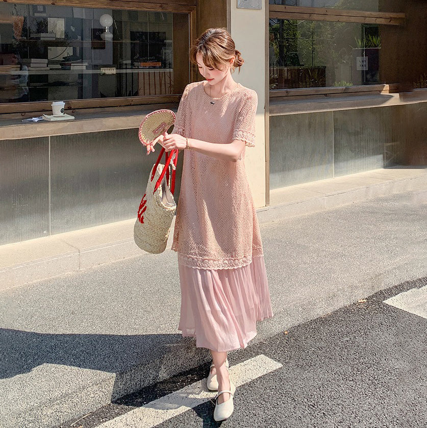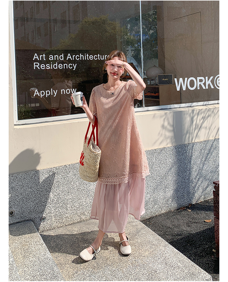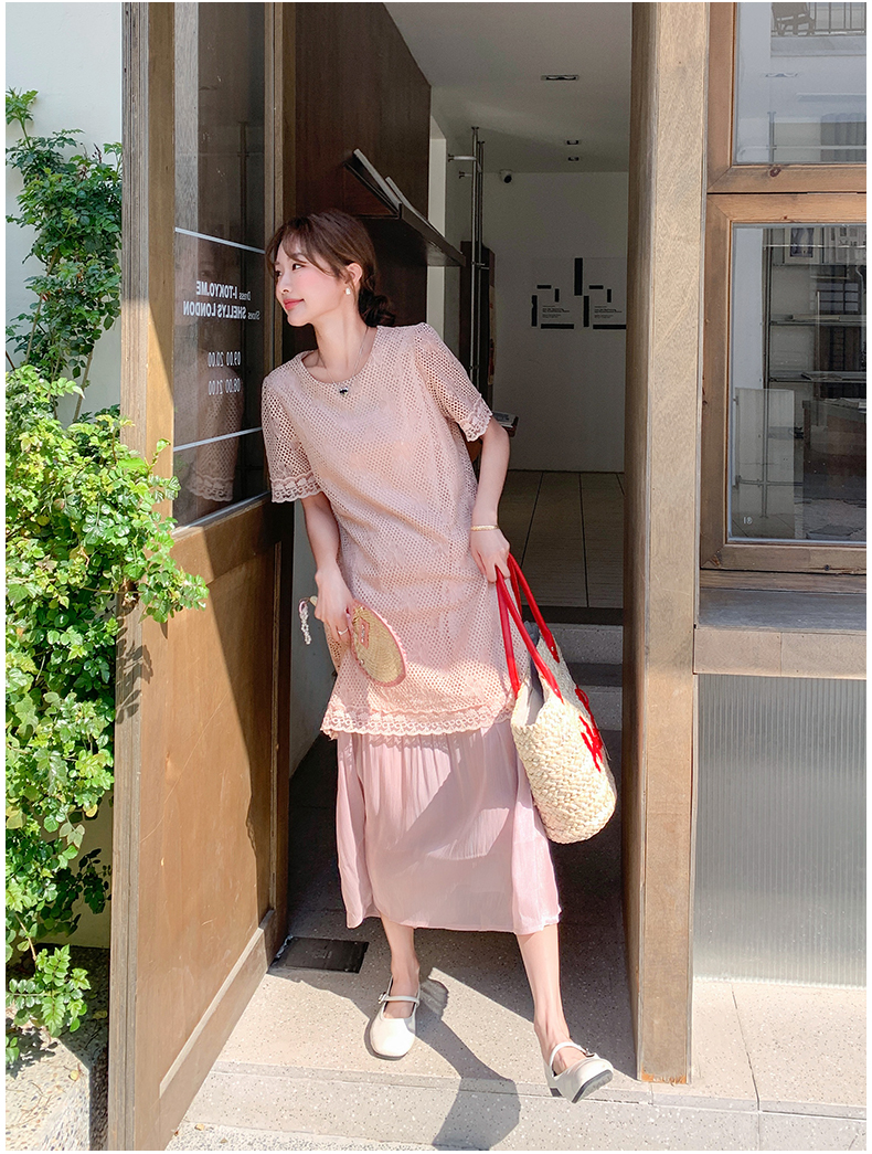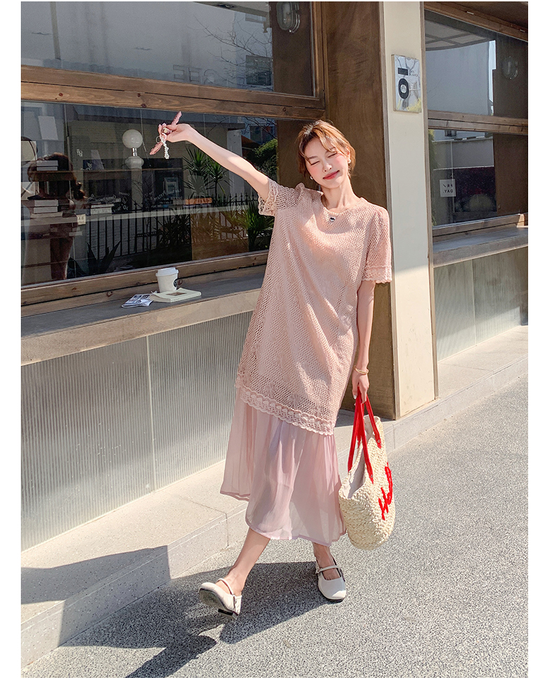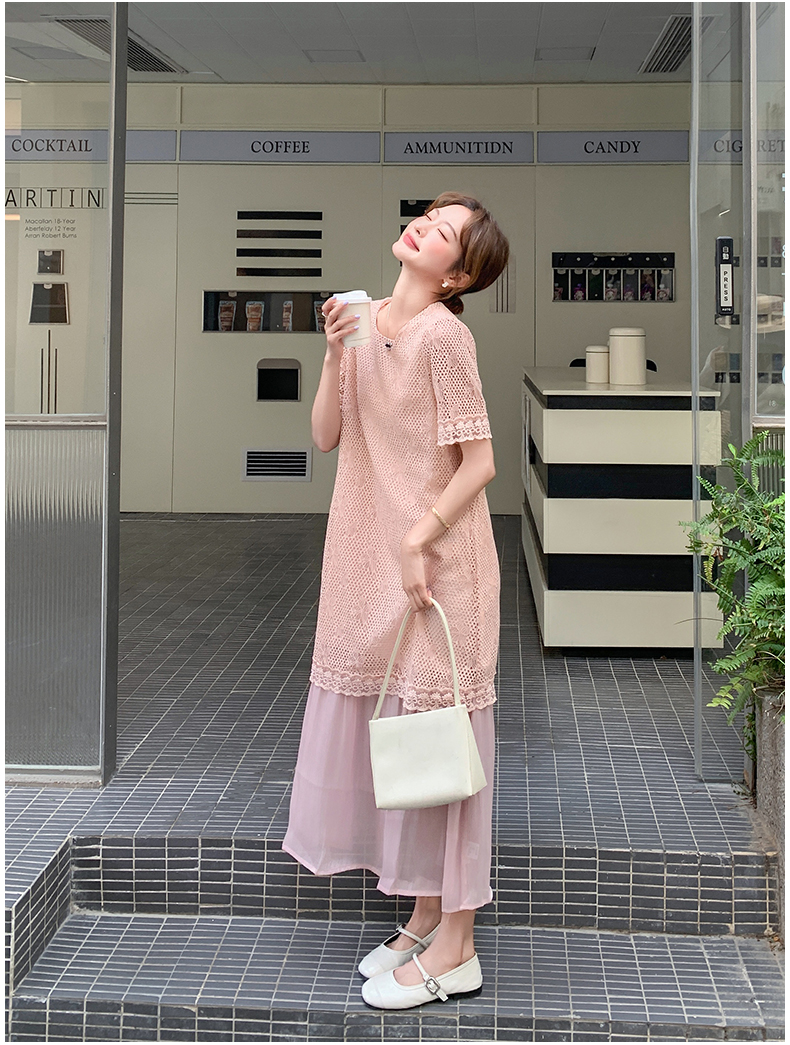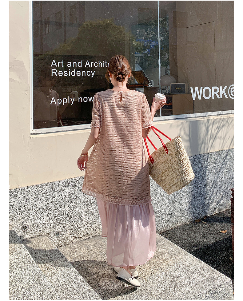 【ワンピース】レース 透かし編み 切り替え ドッキング風 半袖ワンピース レディース 夏新作 甘め上品 ロング丈ドレス【JZシリーズ】