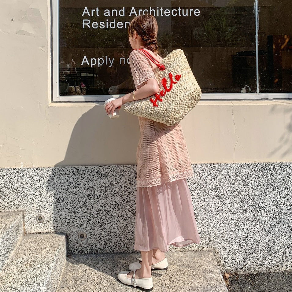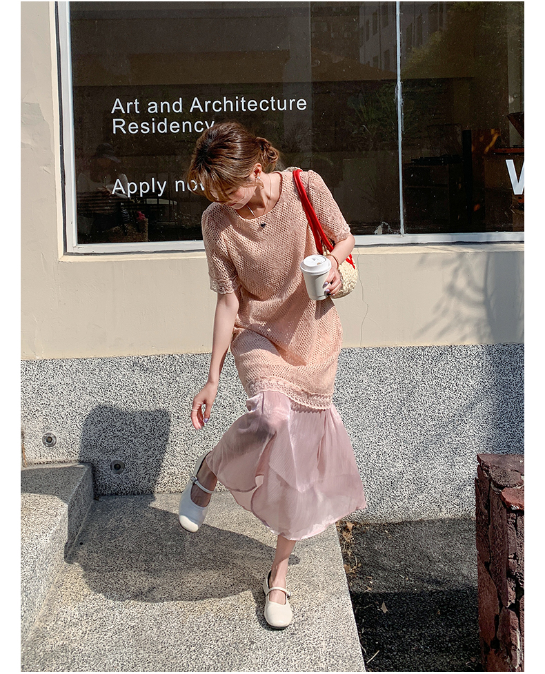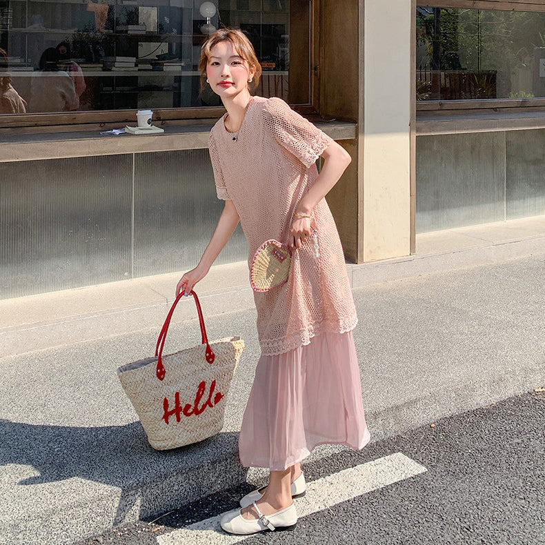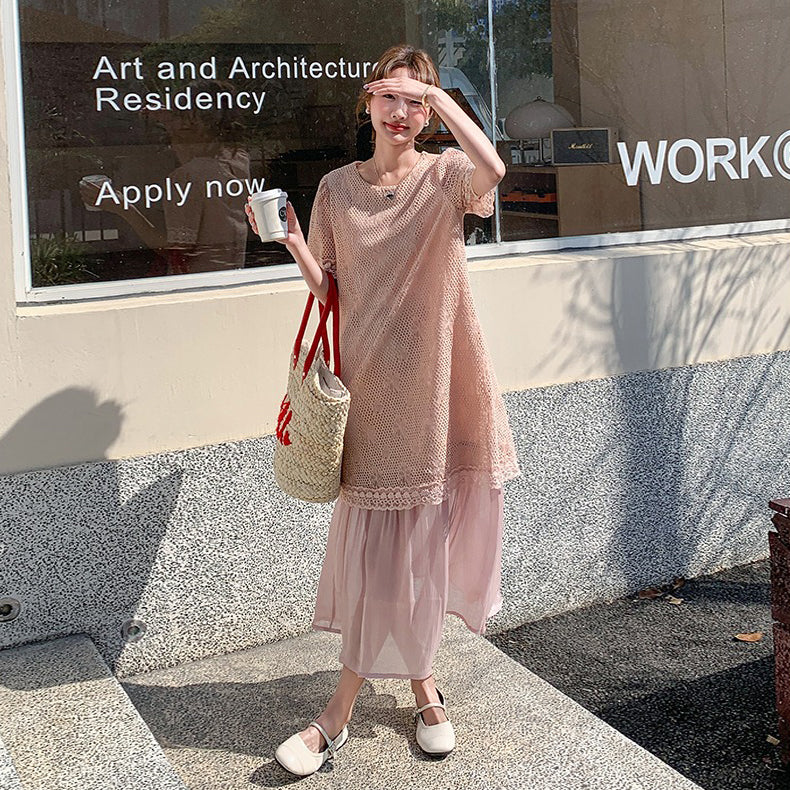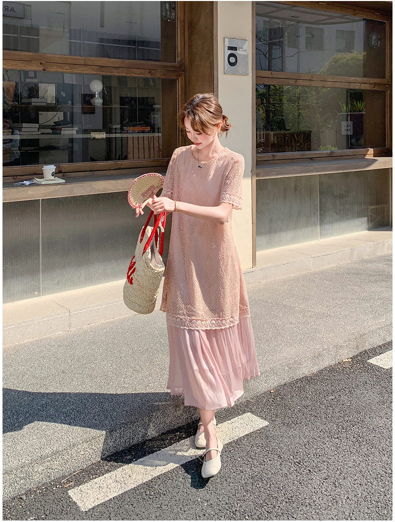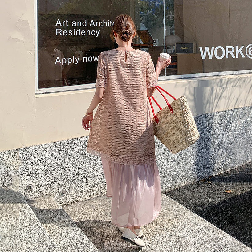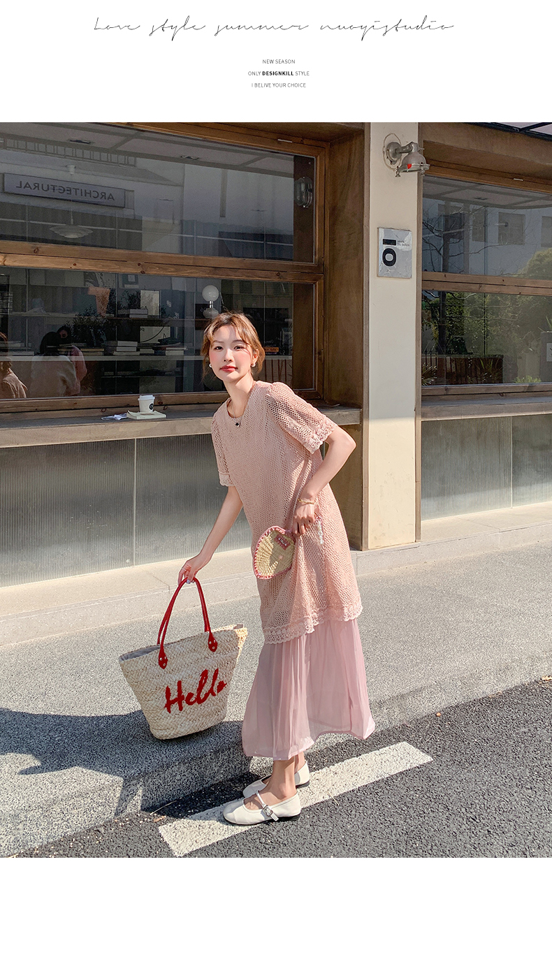 【ワンピース】レース 透かし編み 切り替え ドッキング風 半袖ワンピース レディース 夏新作 甘め上品 ロング丈ドレス【JZシリーズ】
