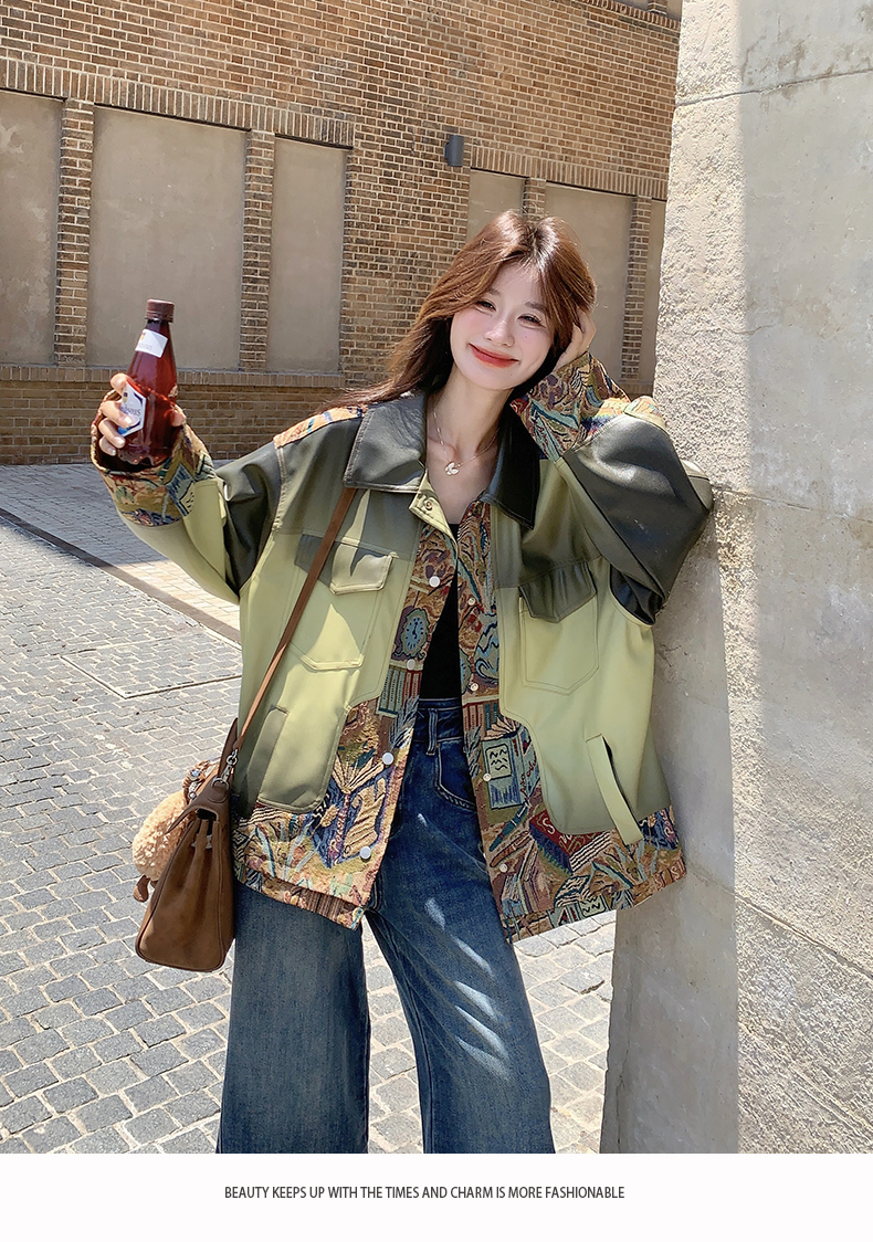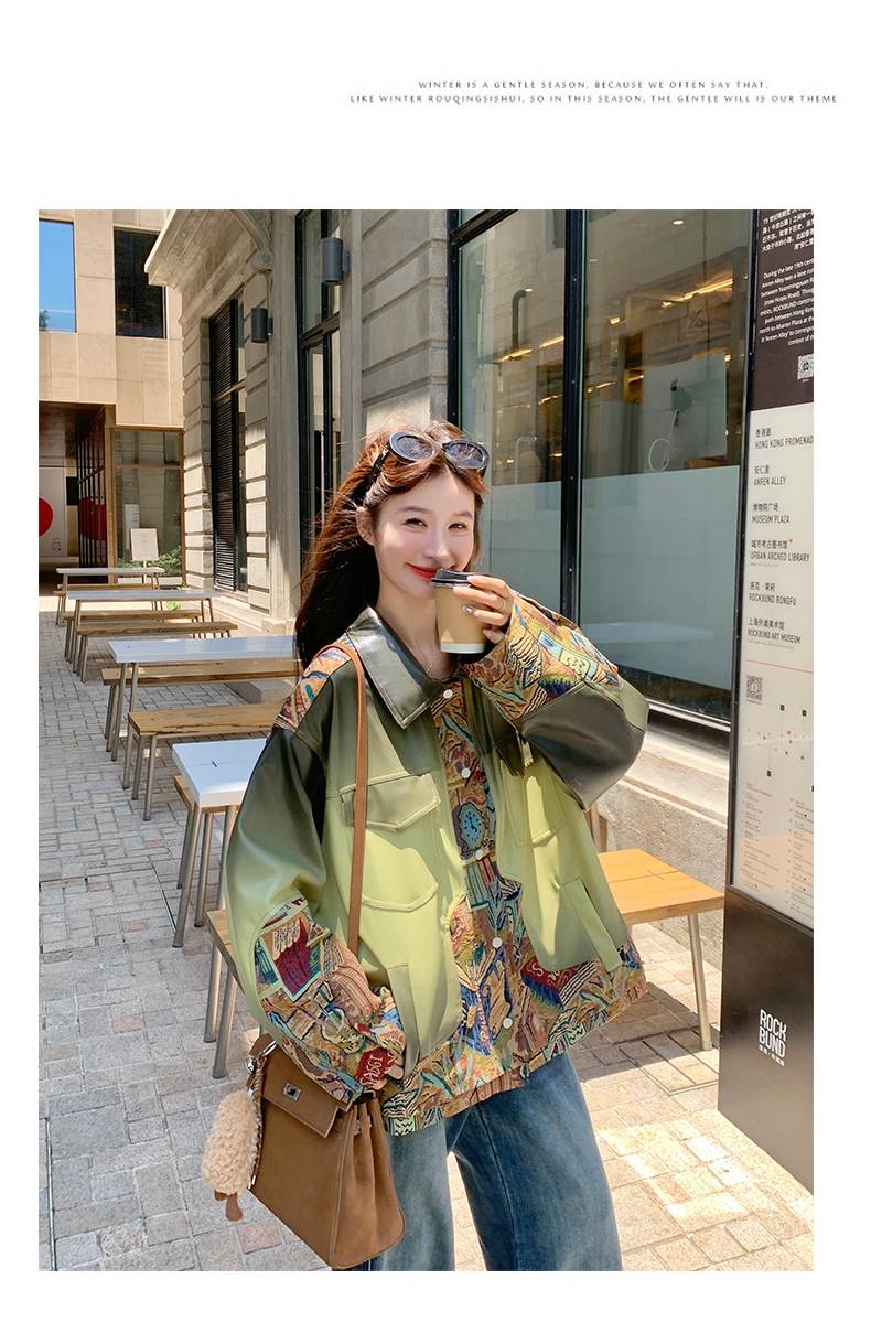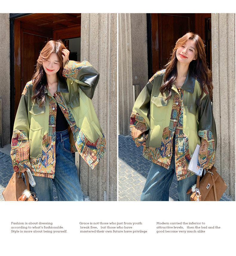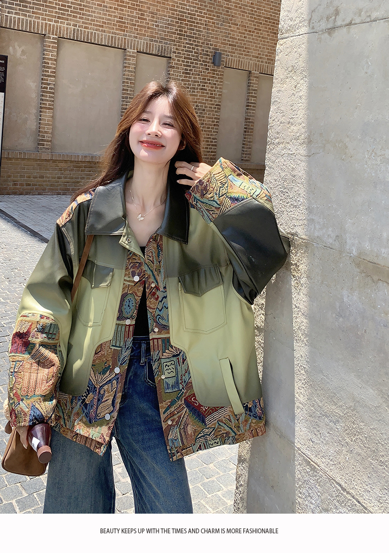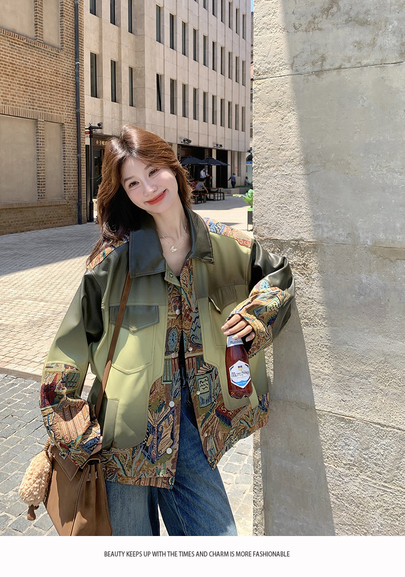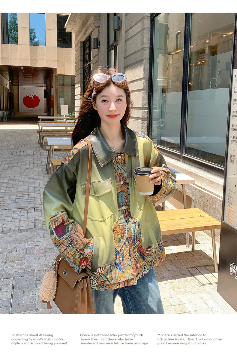 【商品名】【アウター】エスニック柄切替 グラデーショングリーンレザージャケット レディース 初秋 今年のトレンド 大人気 韓国風 ストリート映え【SHシリーズ】