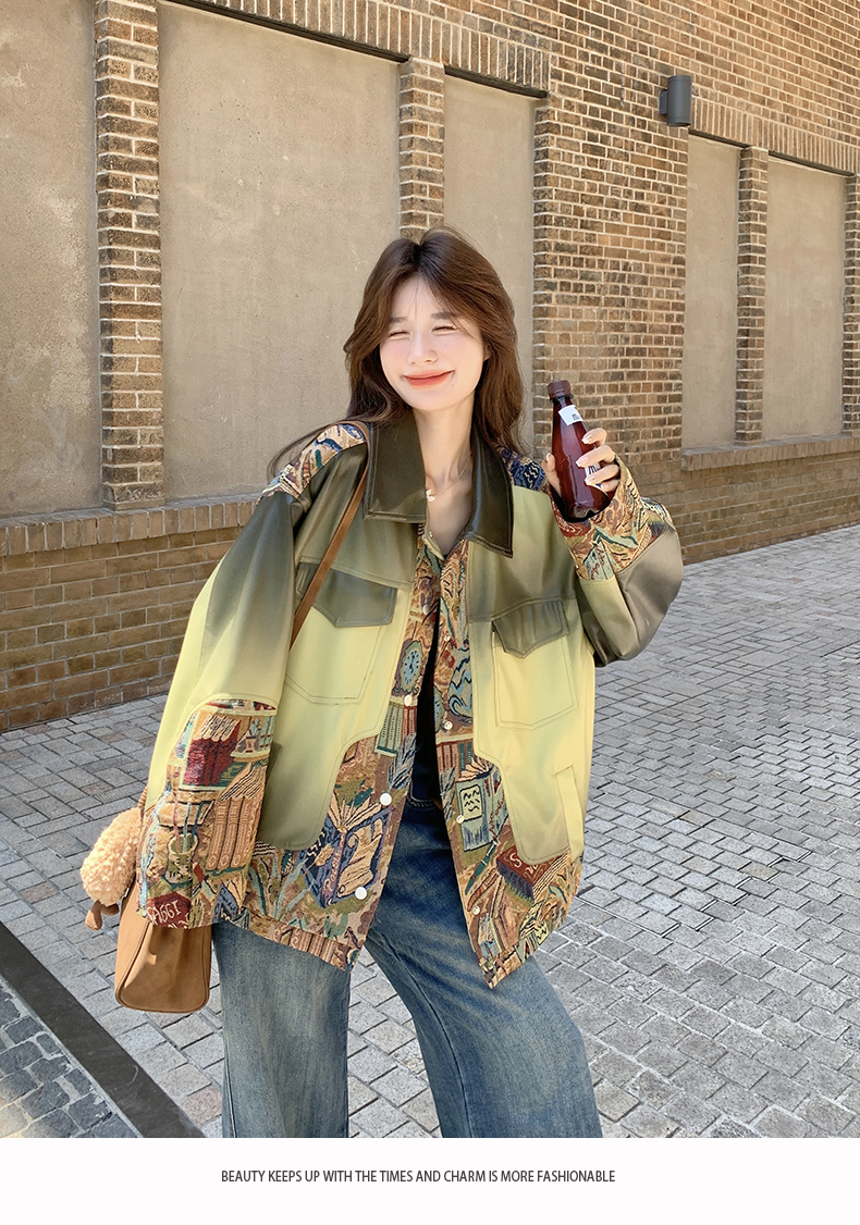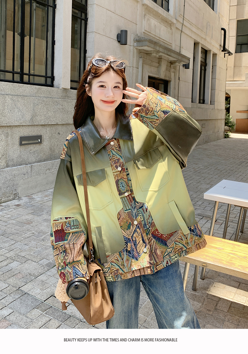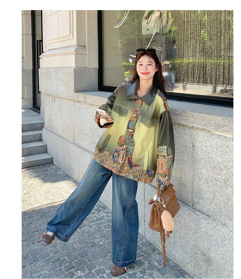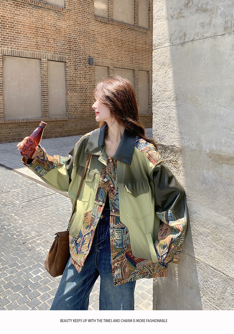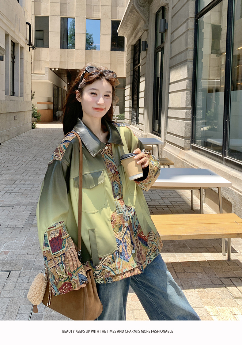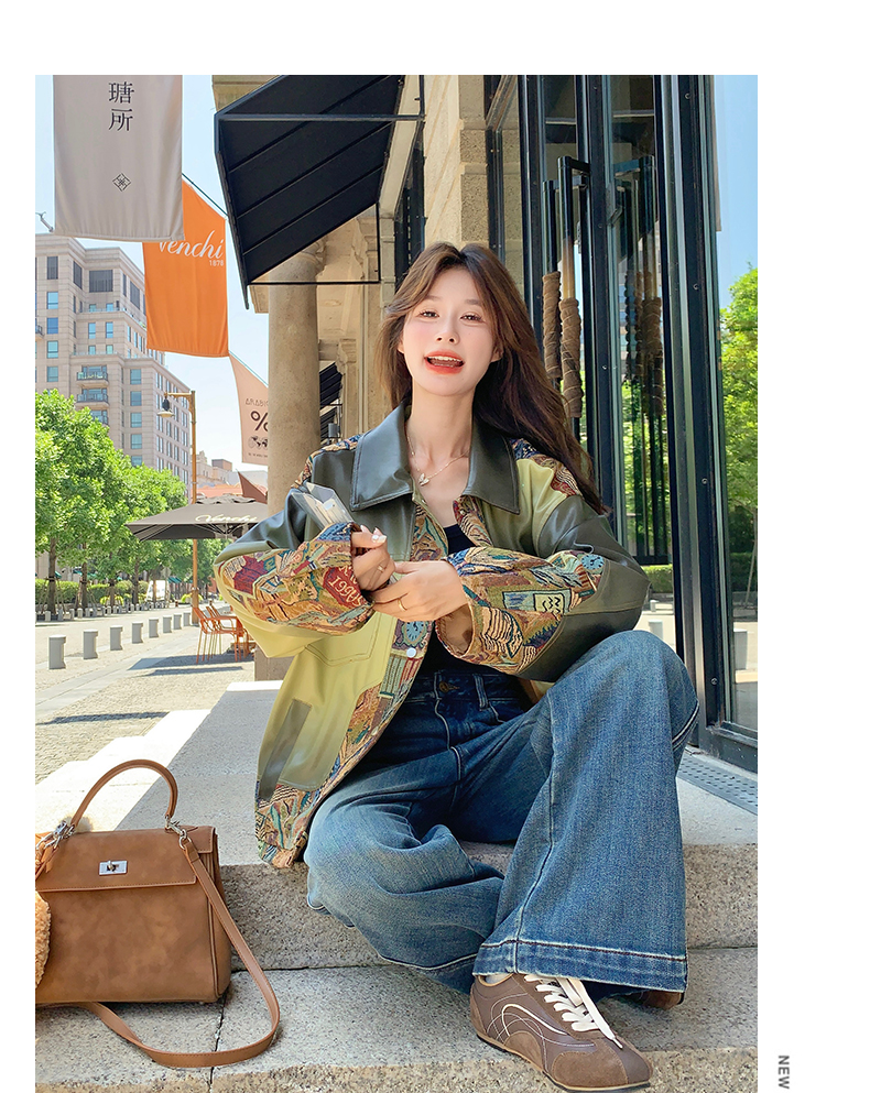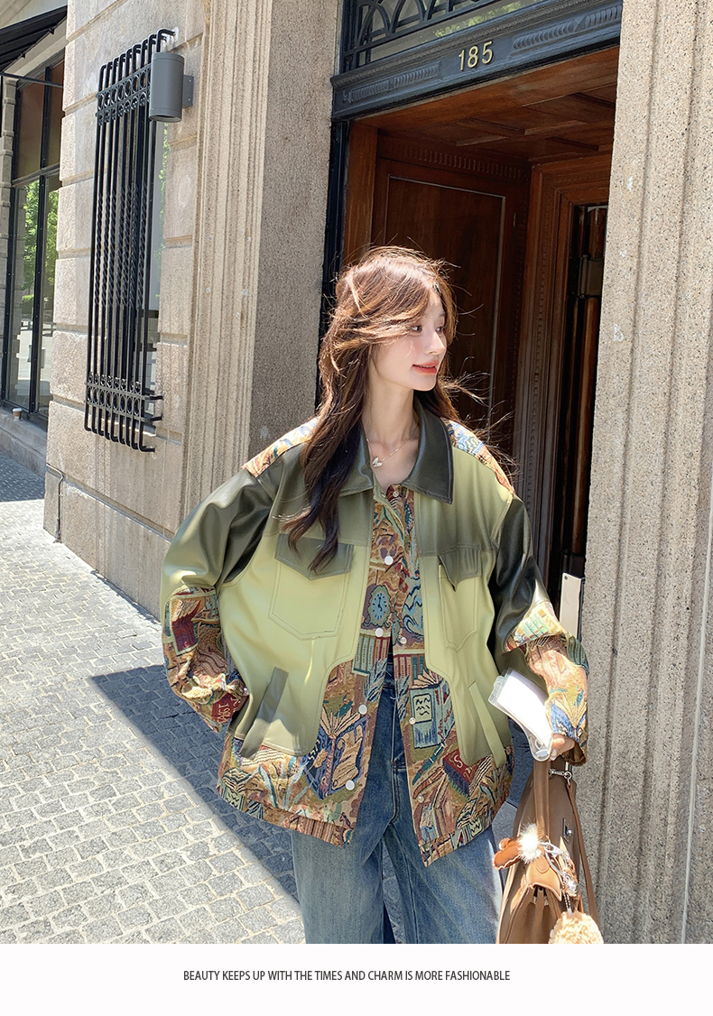【商品名】【アウター】エスニック柄切替 グラデーショングリーンレザージャケット レディース 初秋 今年のトレンド 大人気 韓国風 ストリート映え【SHシリーズ】