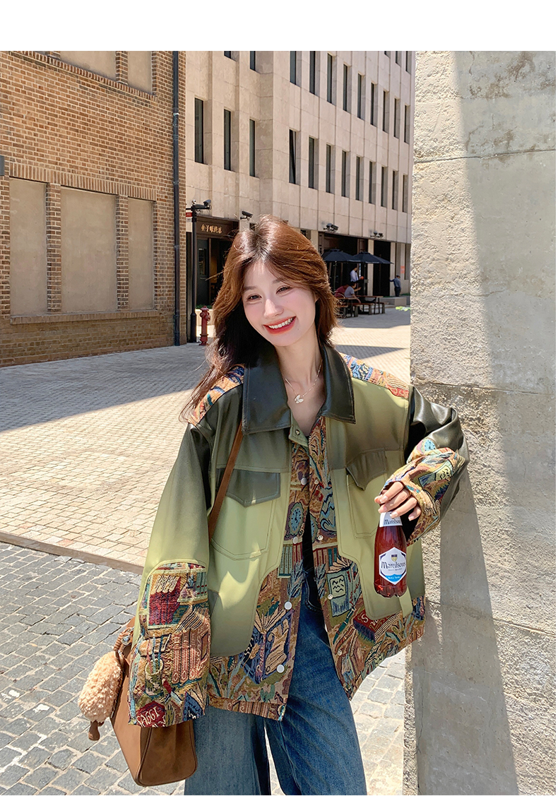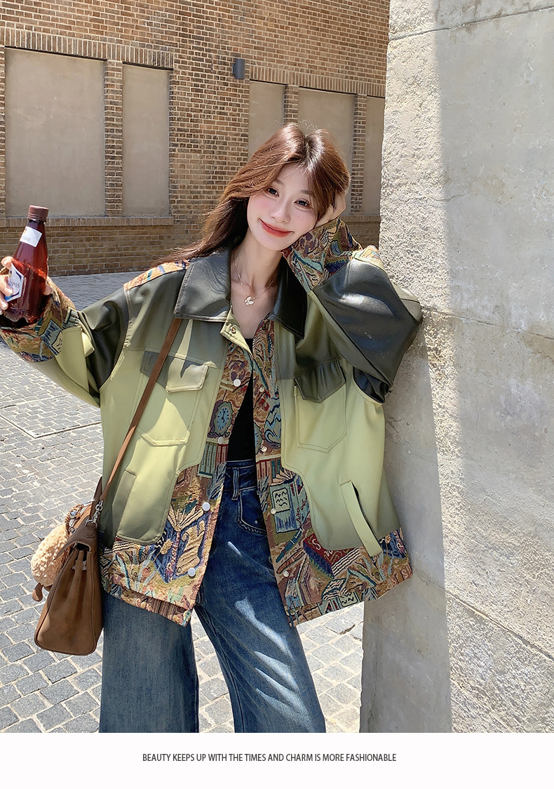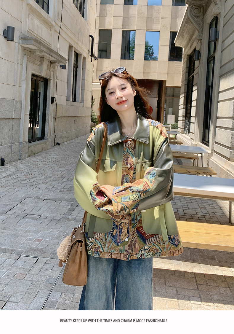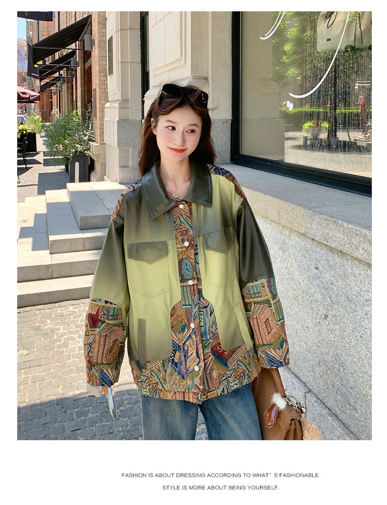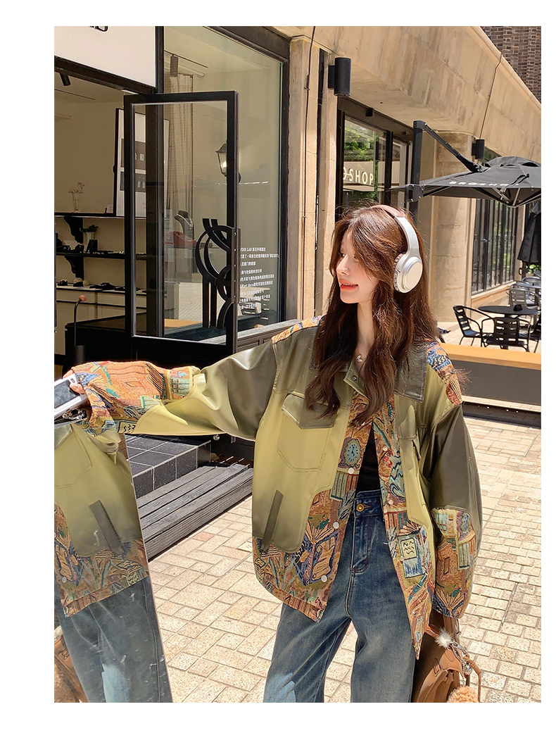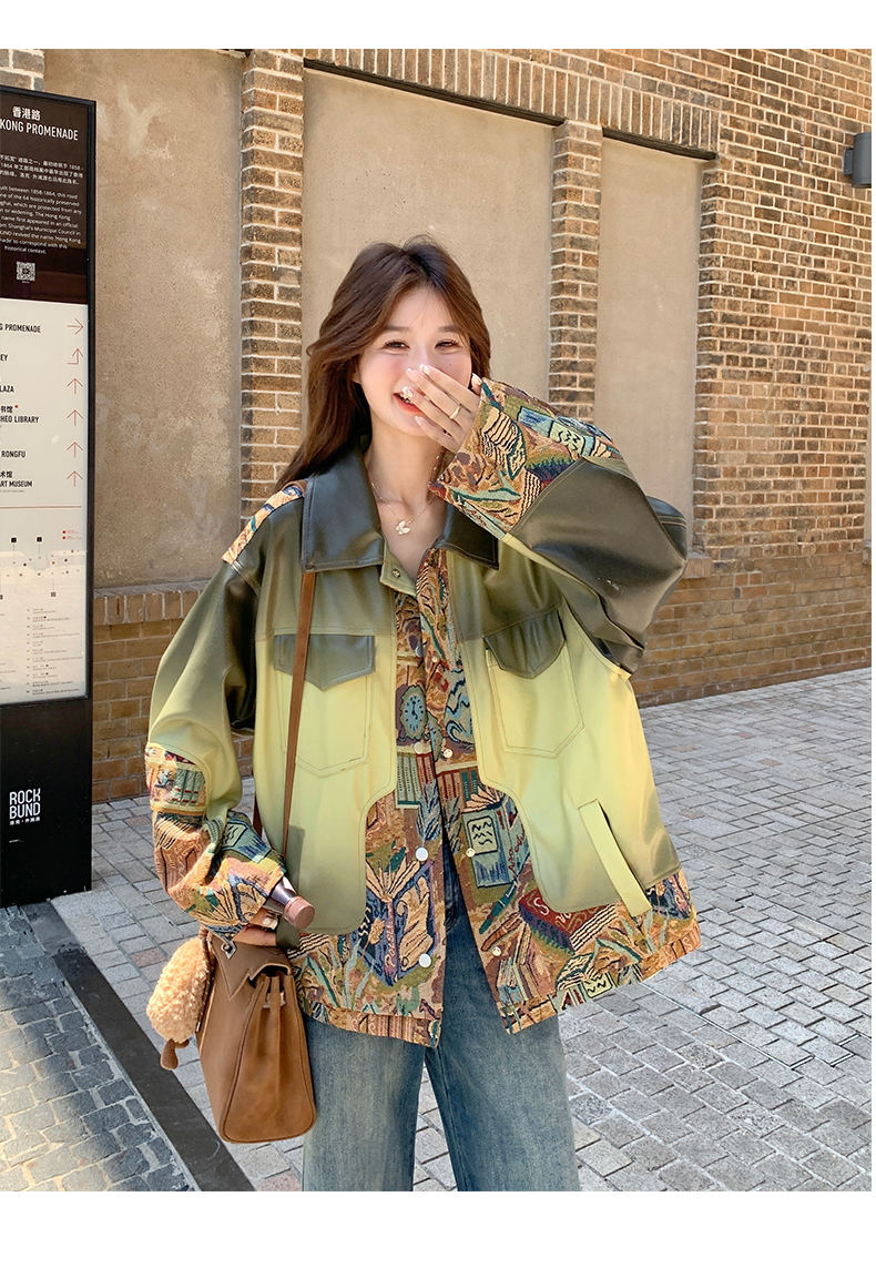 【アウター】エスニック柄切替 グラデーショングリーンレザージャケット レディース 初秋 今年のトレンド 大人気 韓国風 ストリート映え【SHシリーズ】