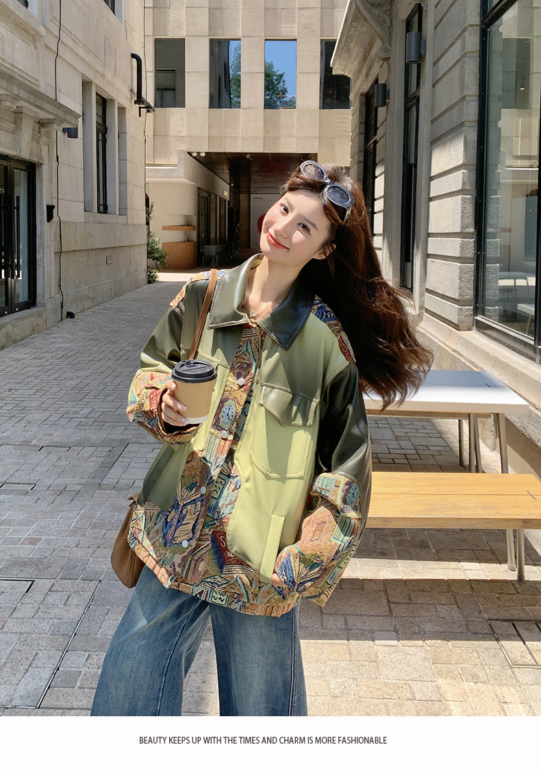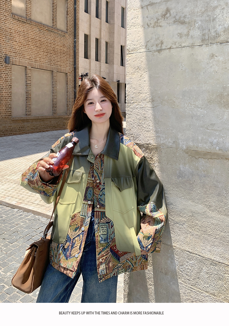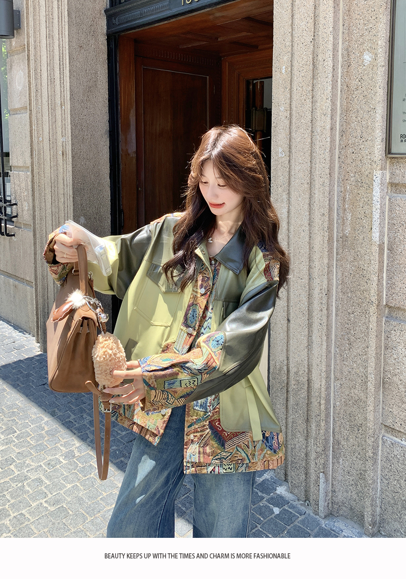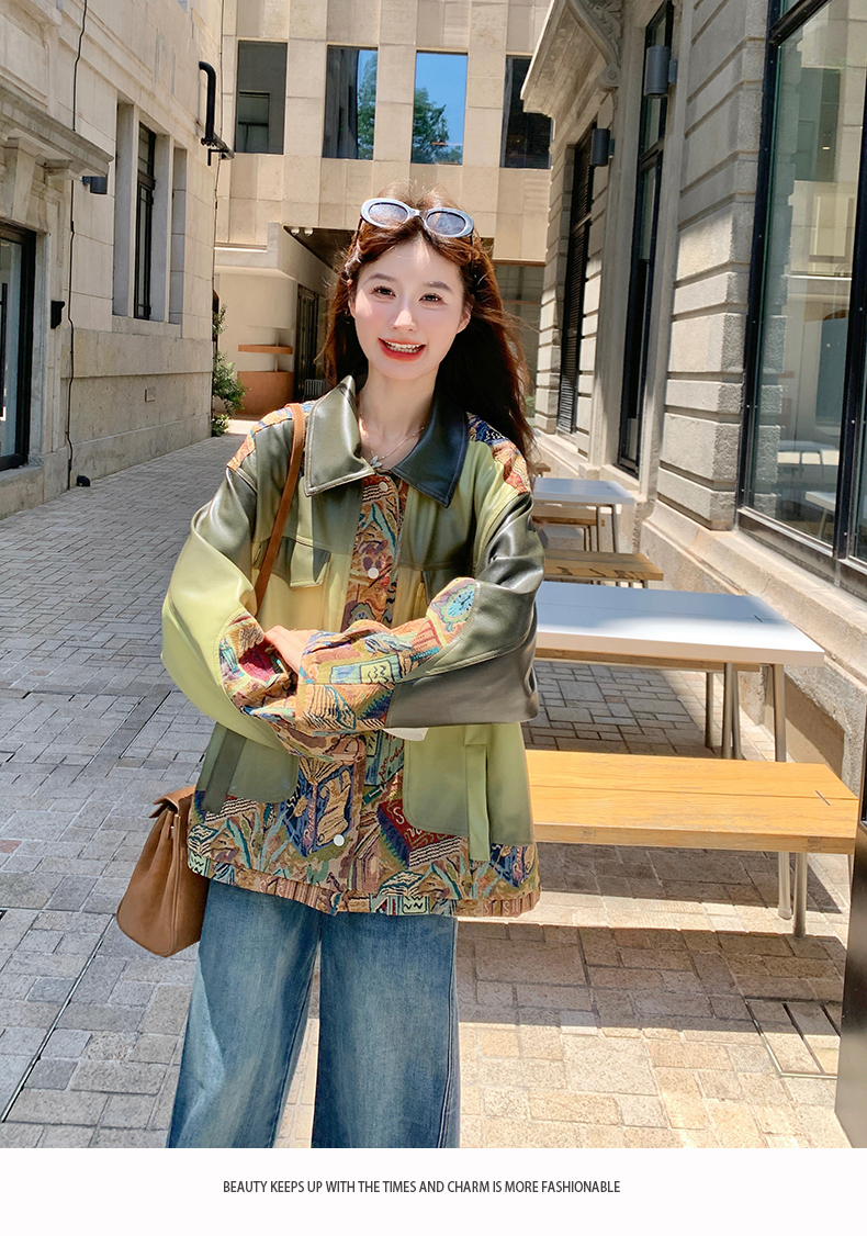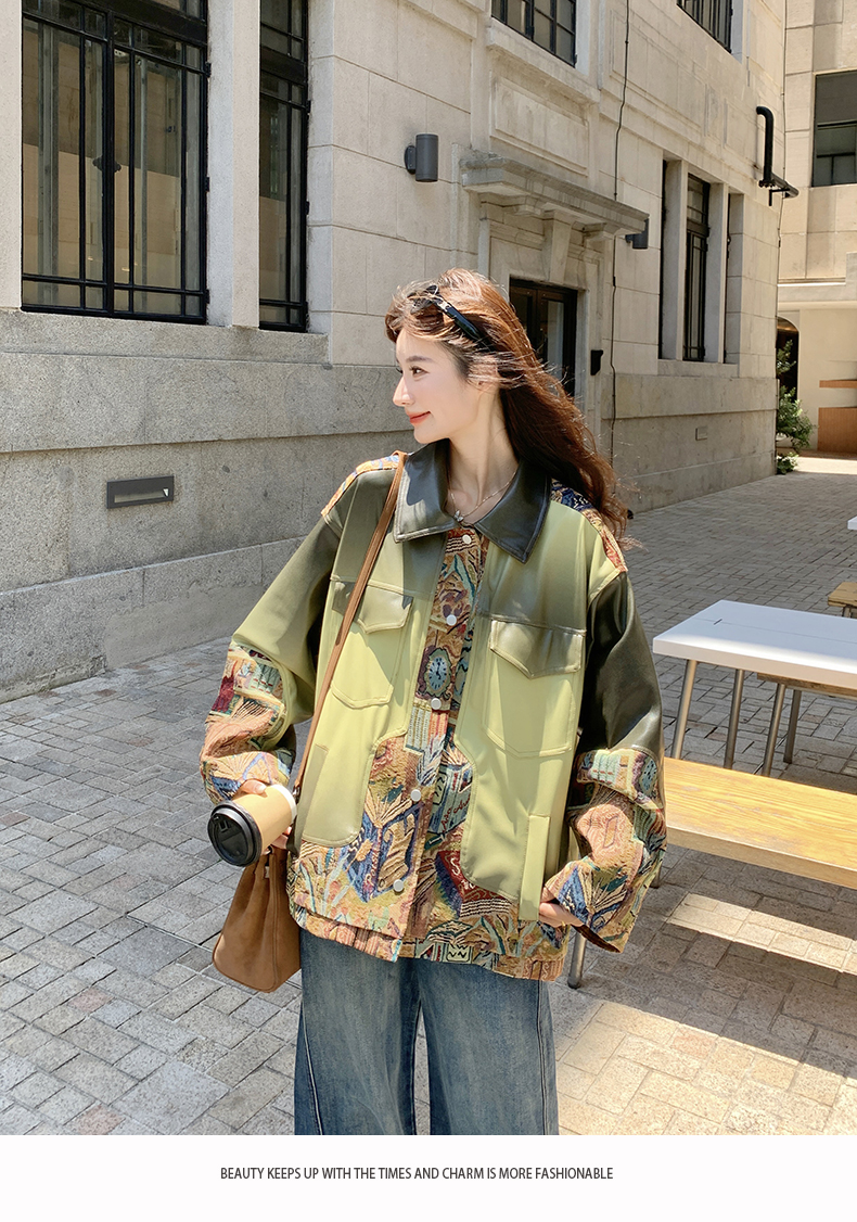 【アウター】エスニック柄切替 グラデーショングリーンレザージャケット レディース 初秋 今年のトレンド 大人気 韓国風 ストリート映え【SHシリーズ】
