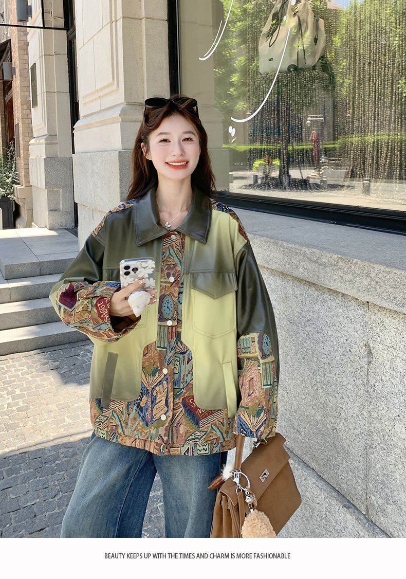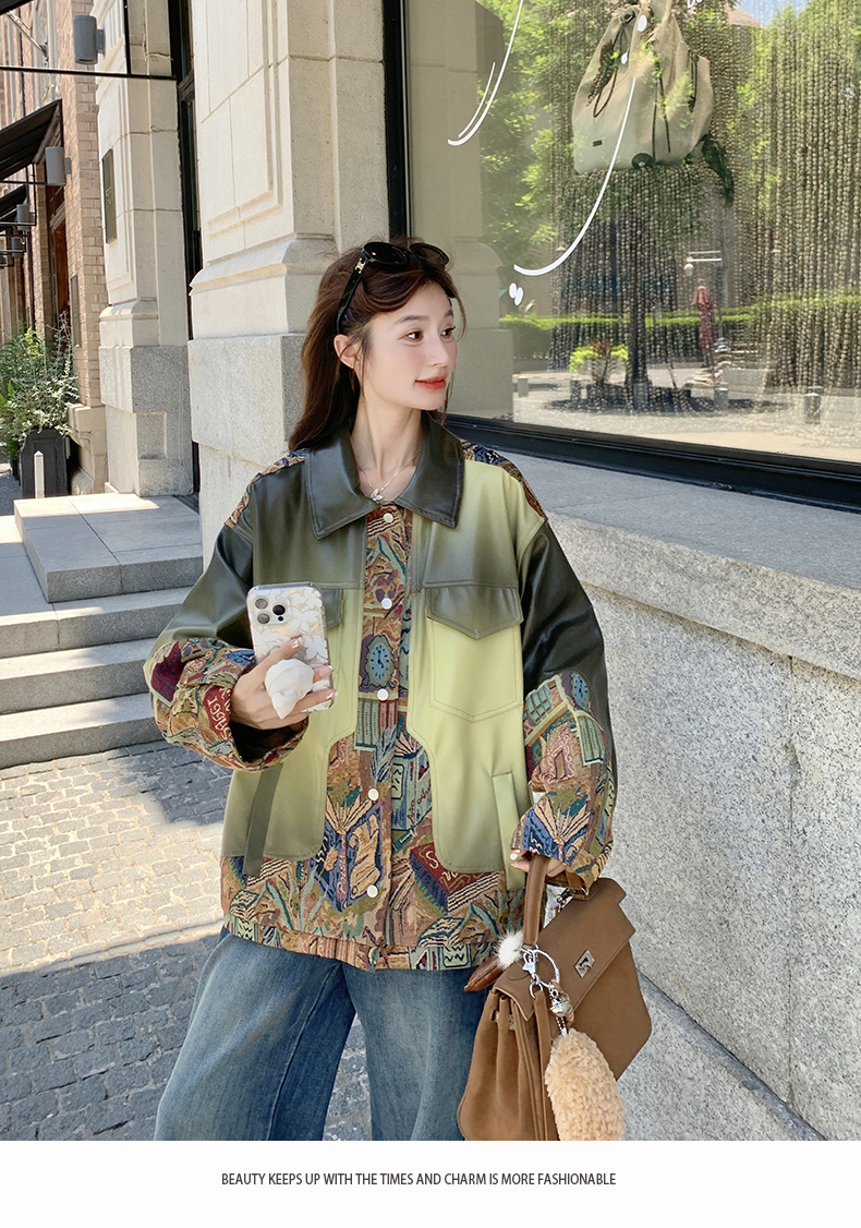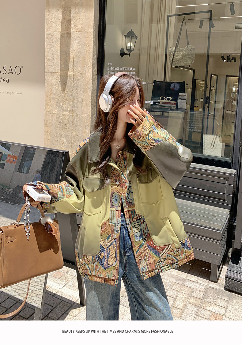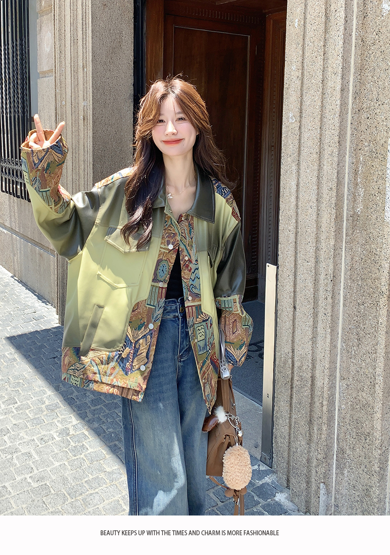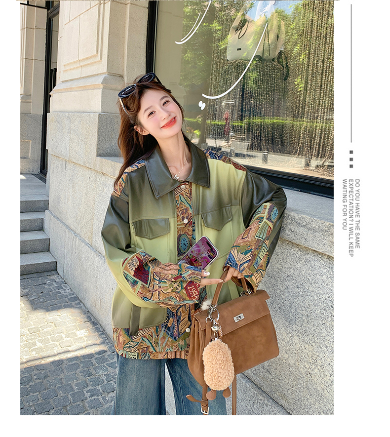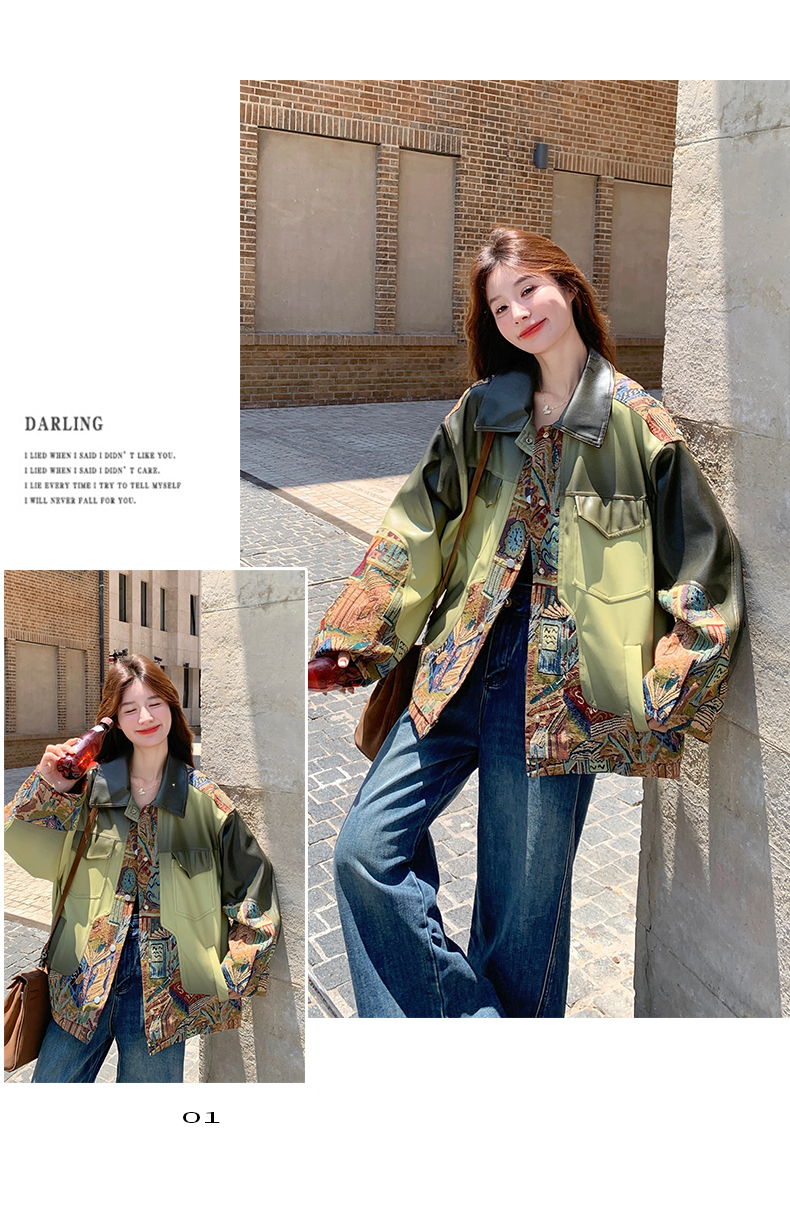 【アウター】エスニック柄切替 グラデーショングリーンレザージャケット レディース 初秋 今年のトレンド 大人気 韓国風 ストリート映え【SHシリーズ】