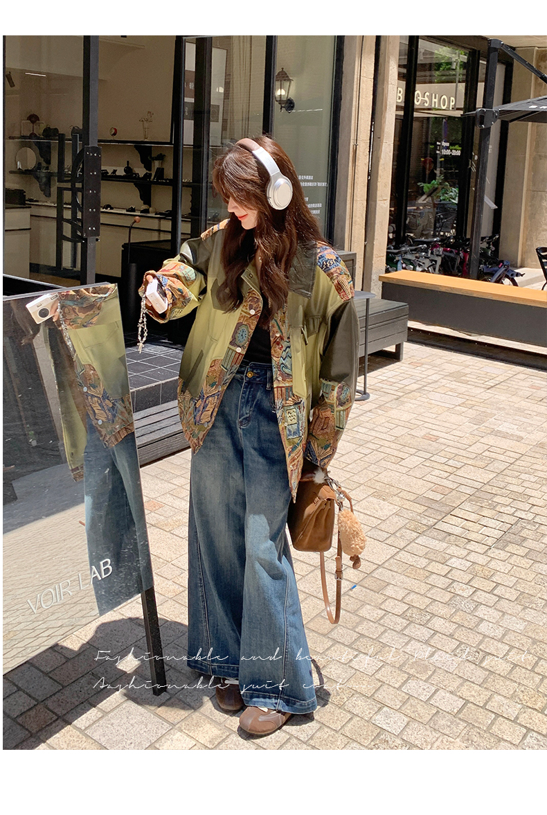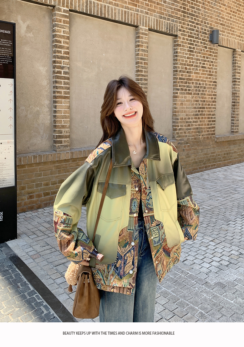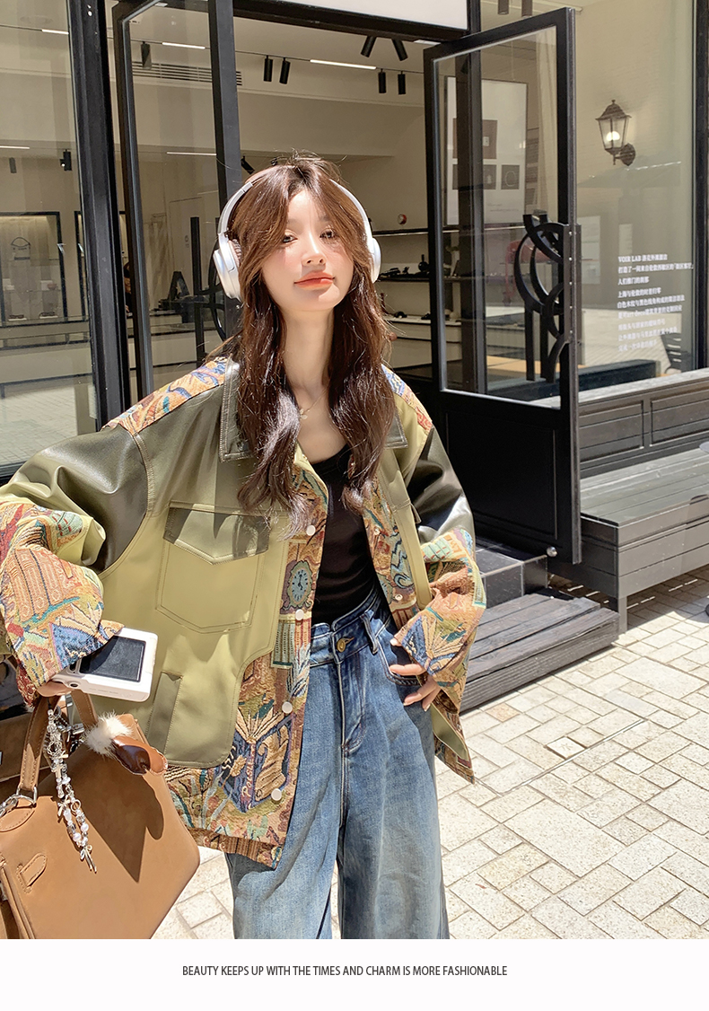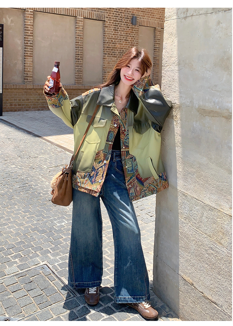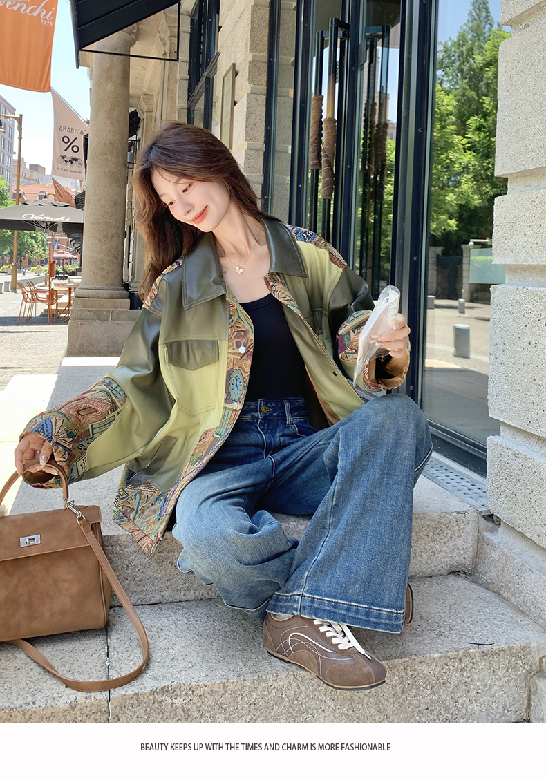 【アウター】エスニック柄切替 グラデーショングリーンレザージャケット レディース 初秋 今年のトレンド 大人気 韓国風 ストリート映え【SHシリーズ】