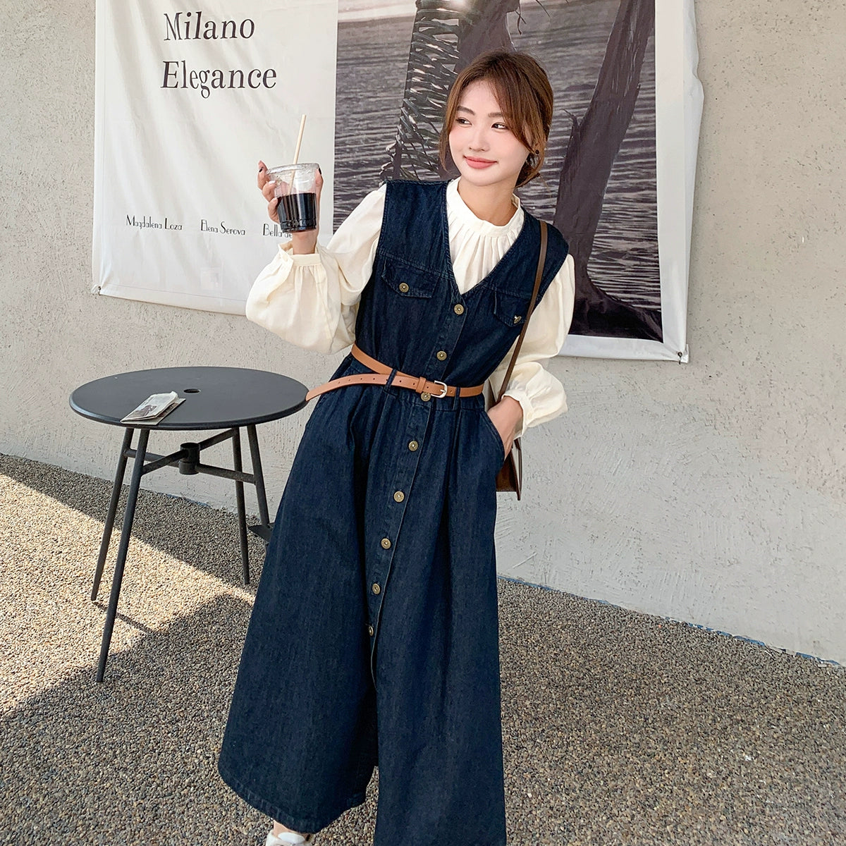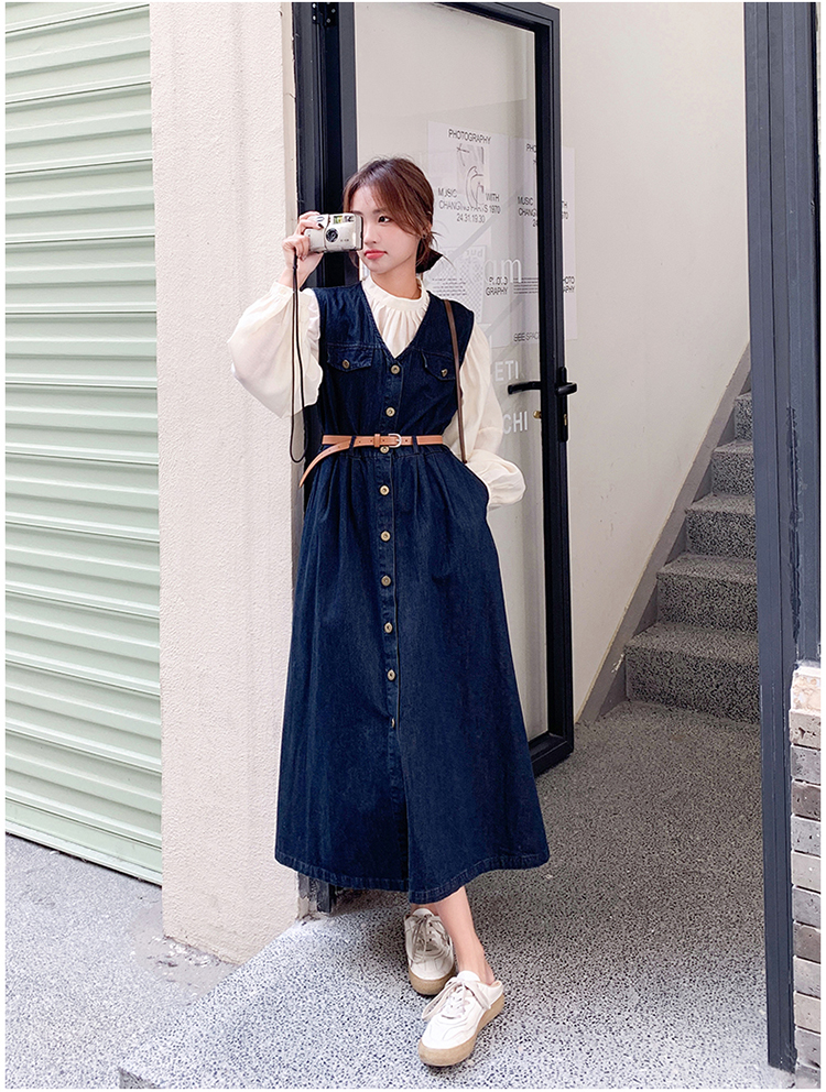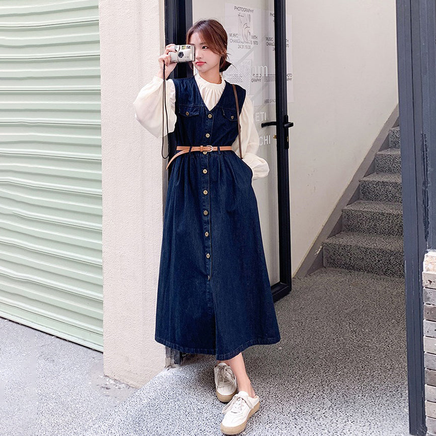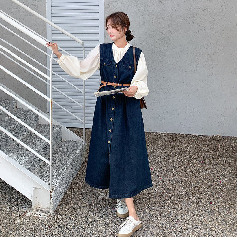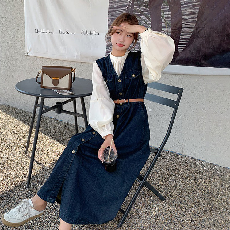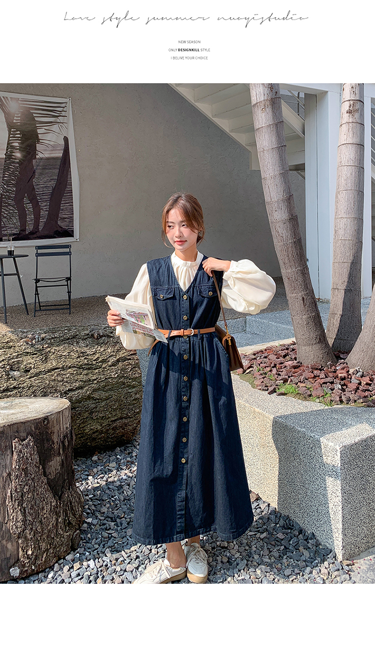 2点セット!【セットアップ】ヴィンテージデニムワンピースセット レディース 春秋 エレガント おしゃれ ブラウス+キャミワンピース 2点セット【JZシリーズ】