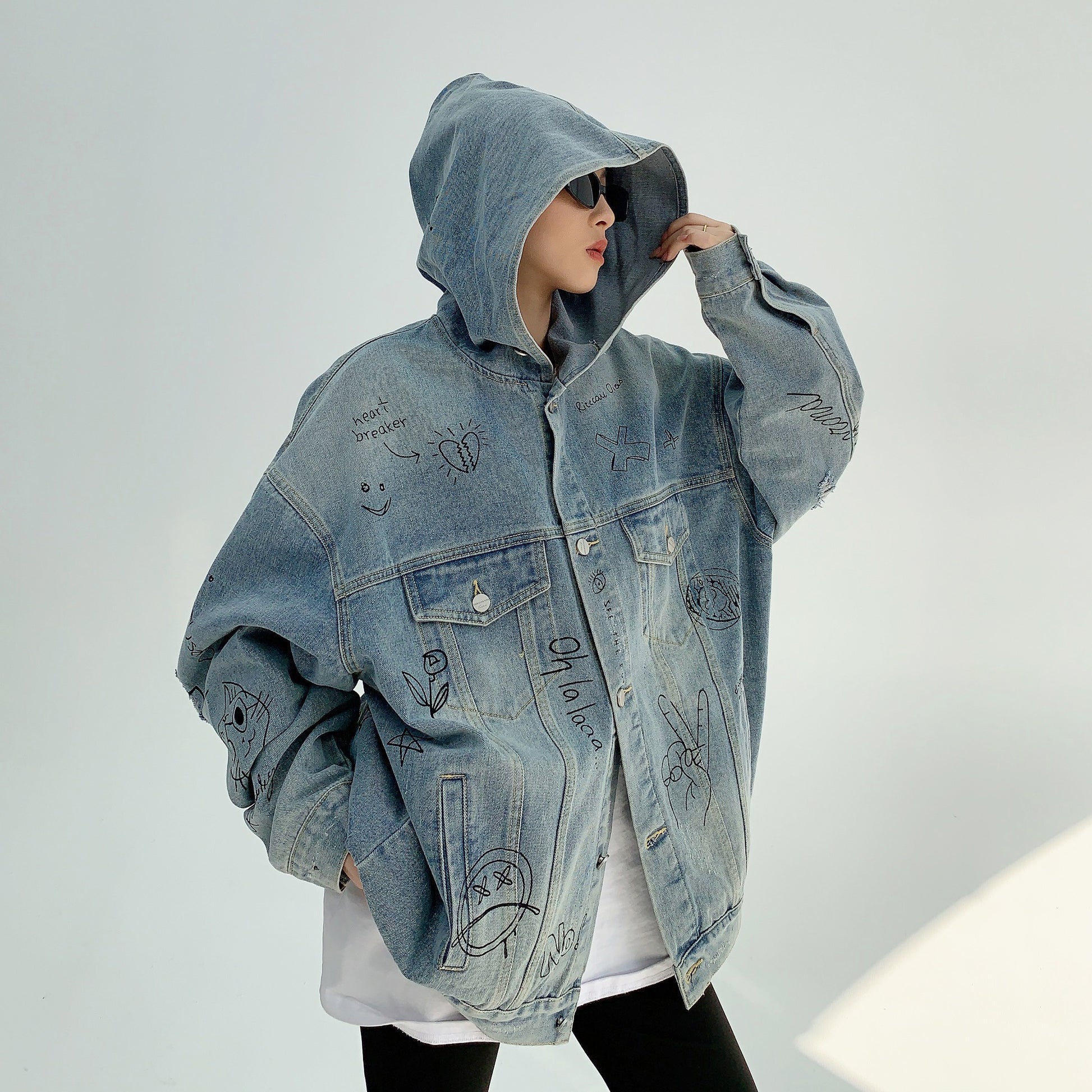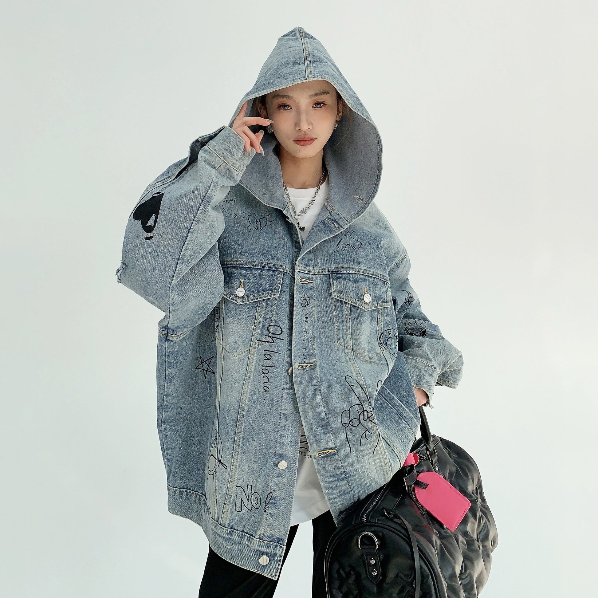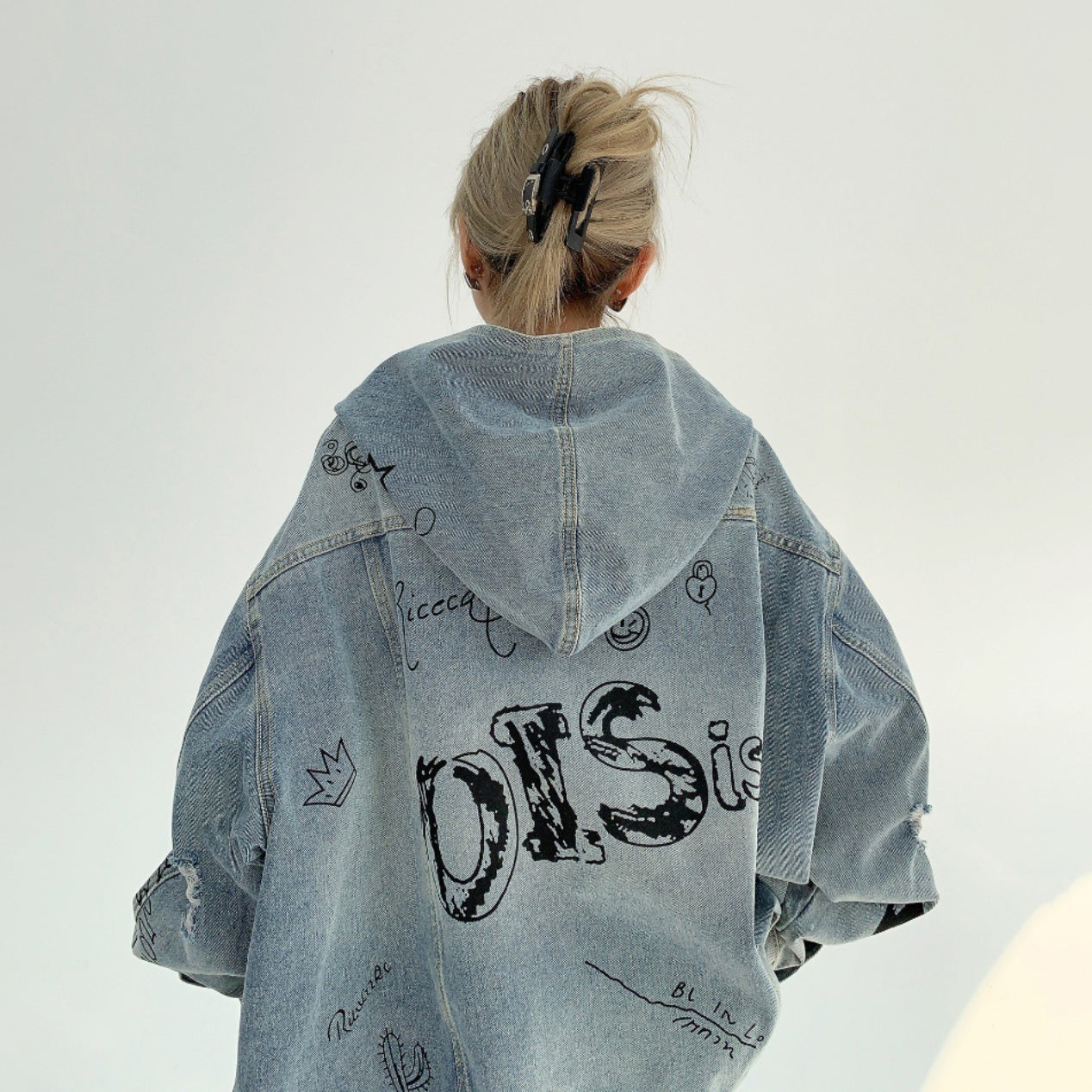 【アウター】春秋 アメリカン 小洒落 ヘビーウェイト カップルジャケット ゆったり レトロデザイン グラフィティ フード付きデニムジャケット【FCシリーズ】