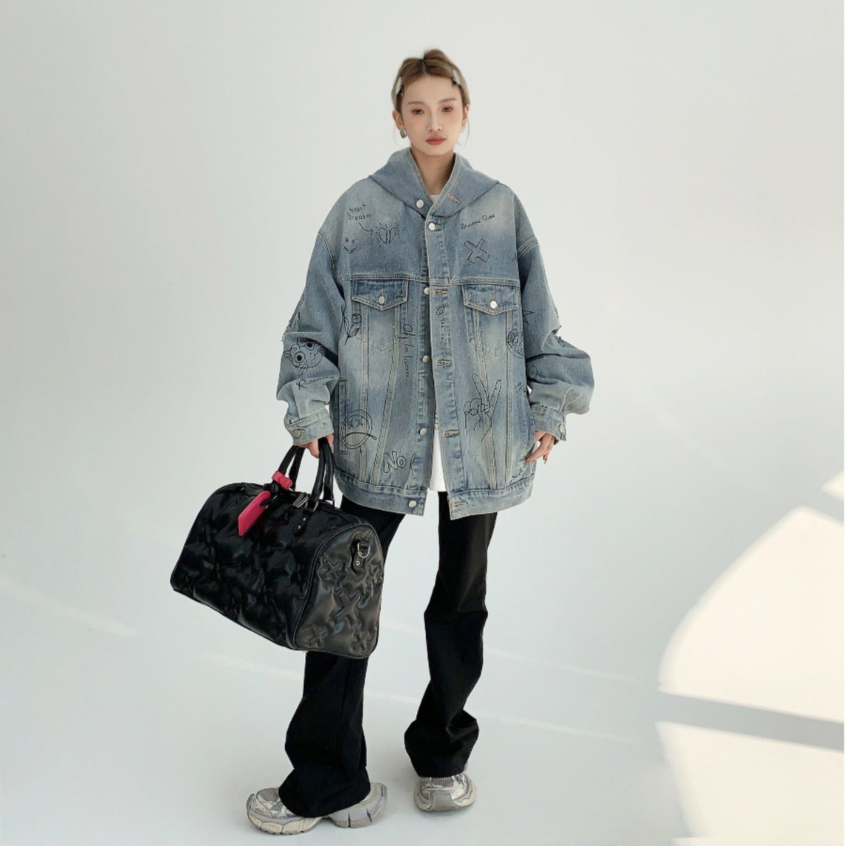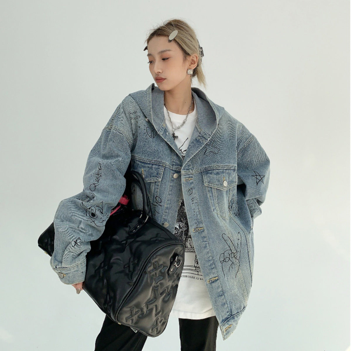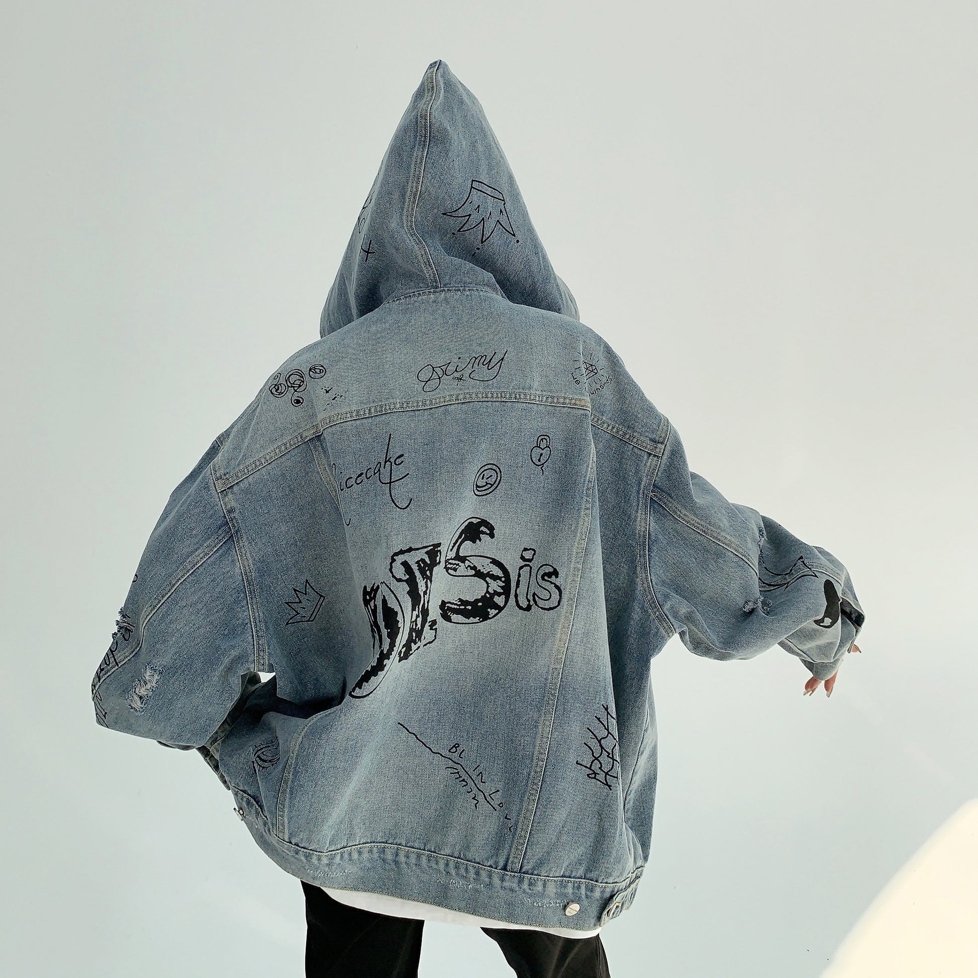 【アウター】春秋 アメリカン 小洒落 ヘビーウェイト カップルジャケット ゆったり レトロデザイン グラフィティ フード付きデニムジャケット【FCシリーズ】