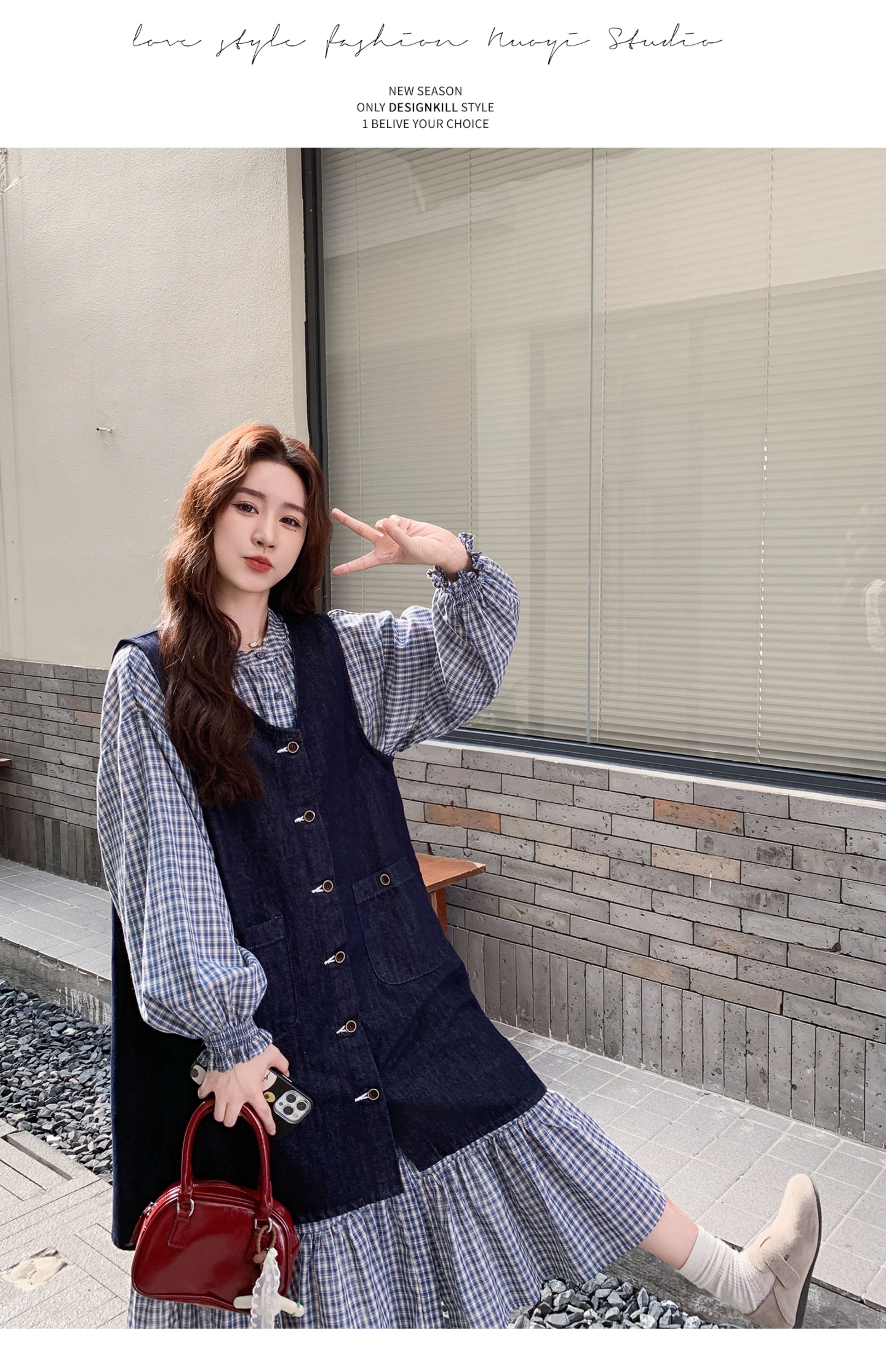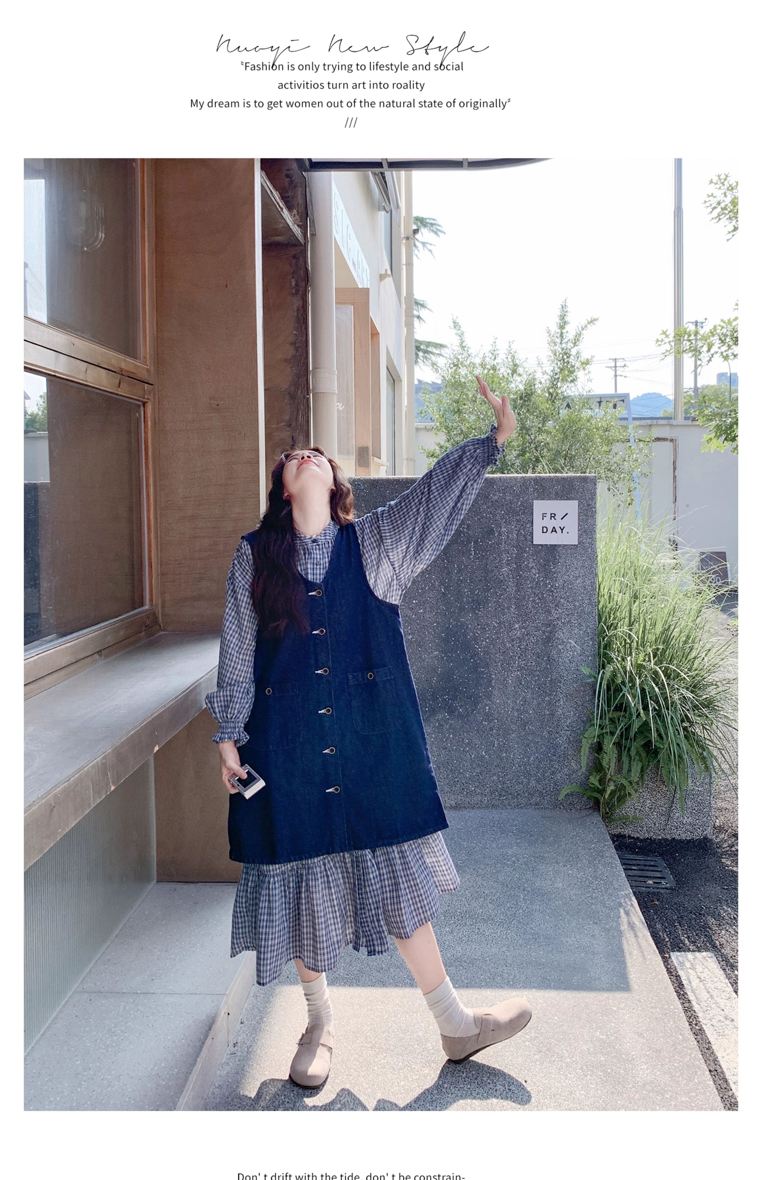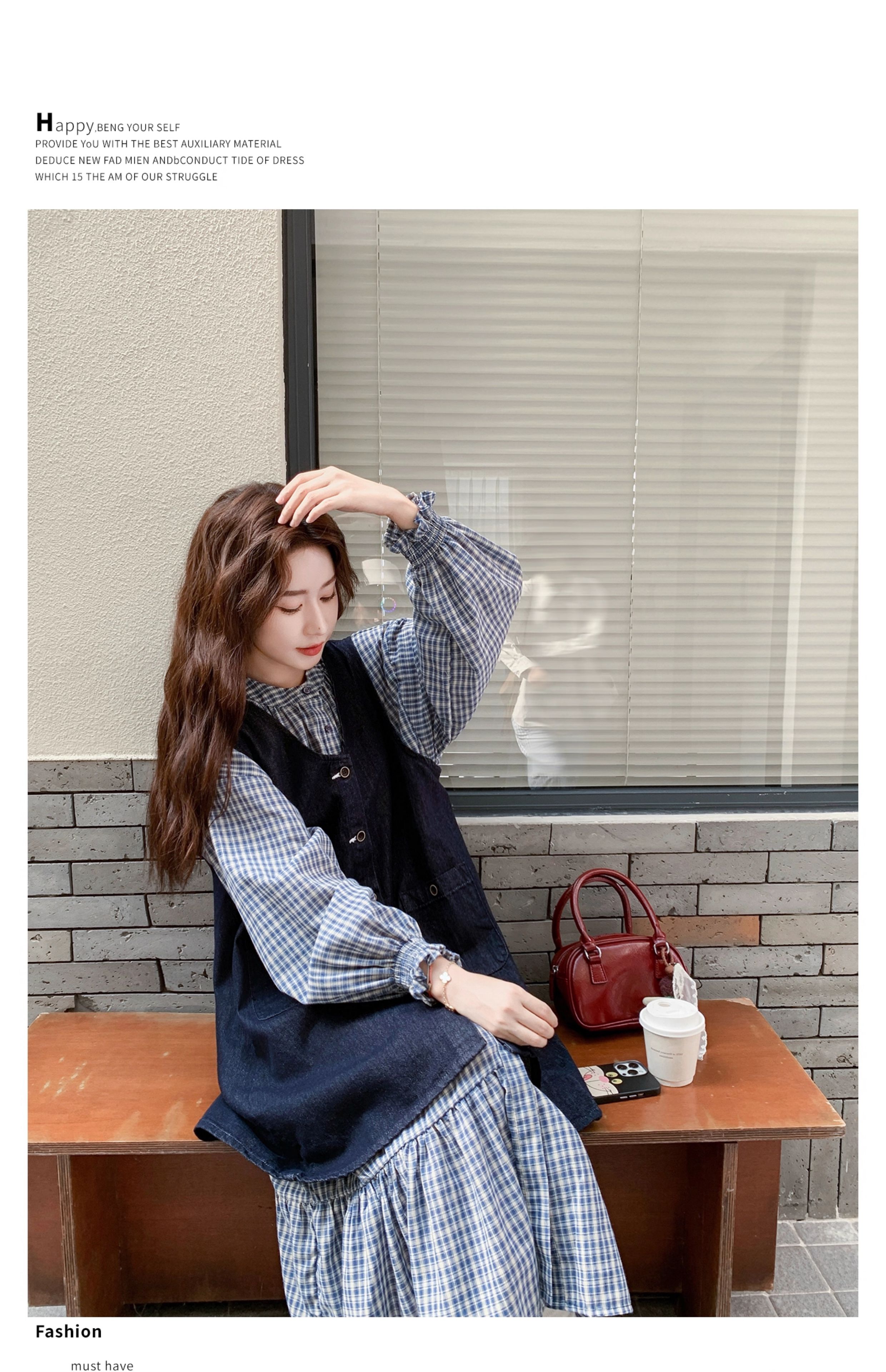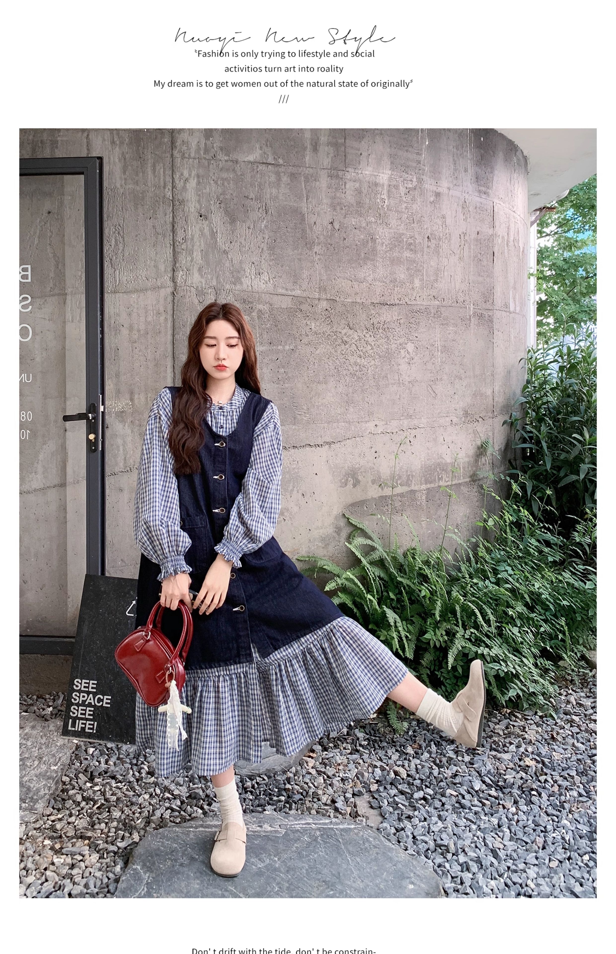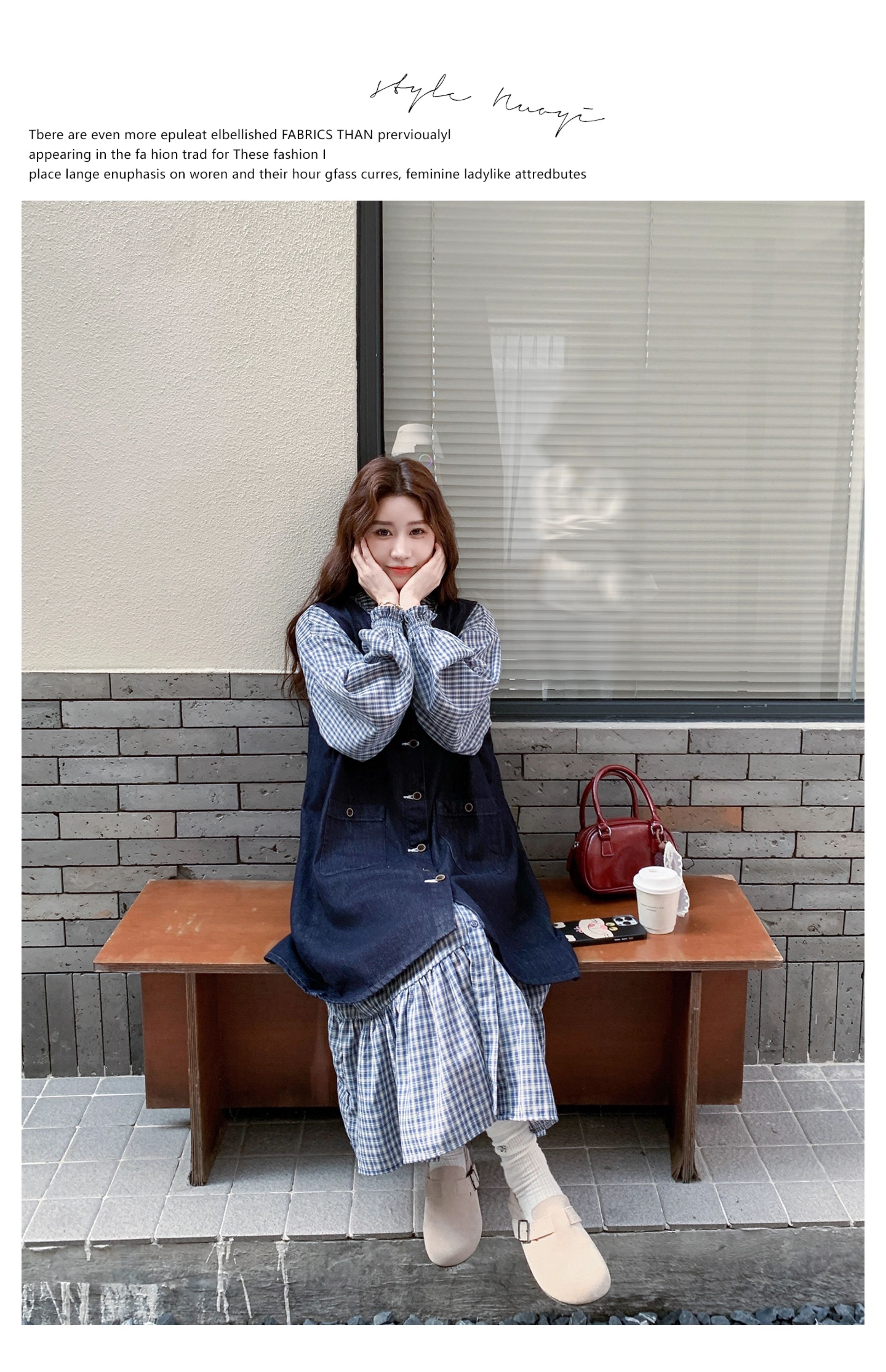 2点セット【セットアップ】韓国風 レトロ 学院スタイル デニム ジレワンピースセット レディース 2025年秋新作 チェック柄【SHシリーズ】